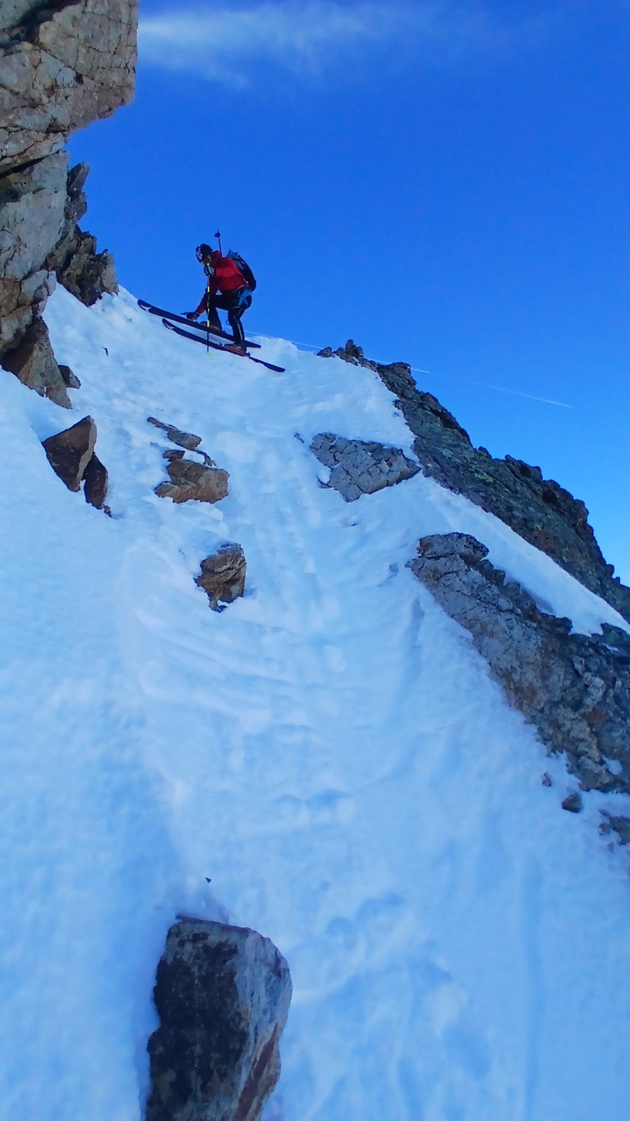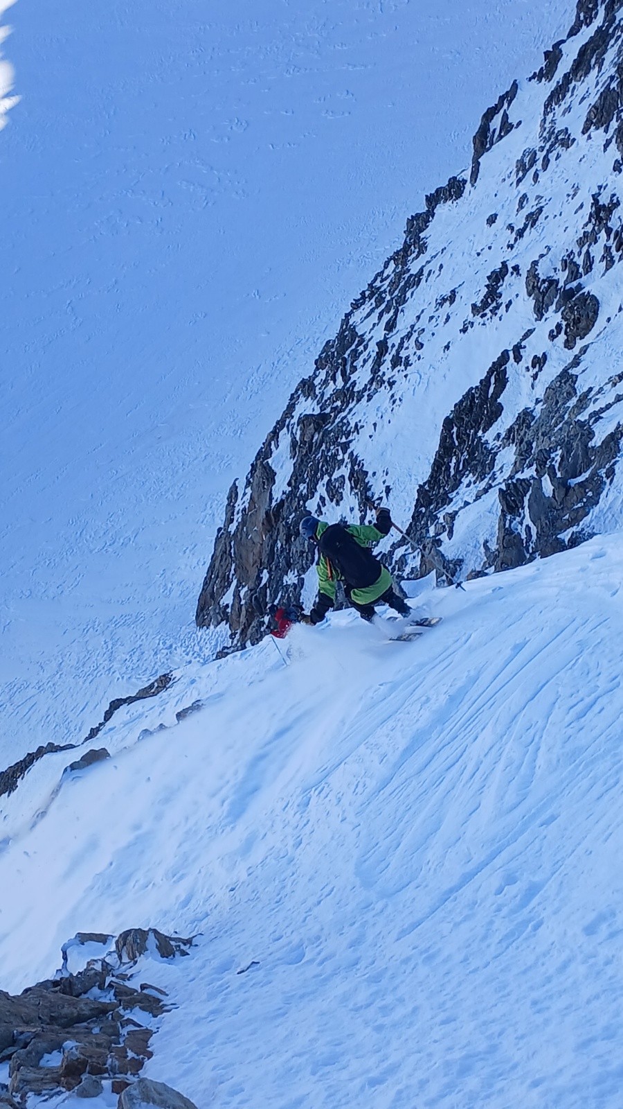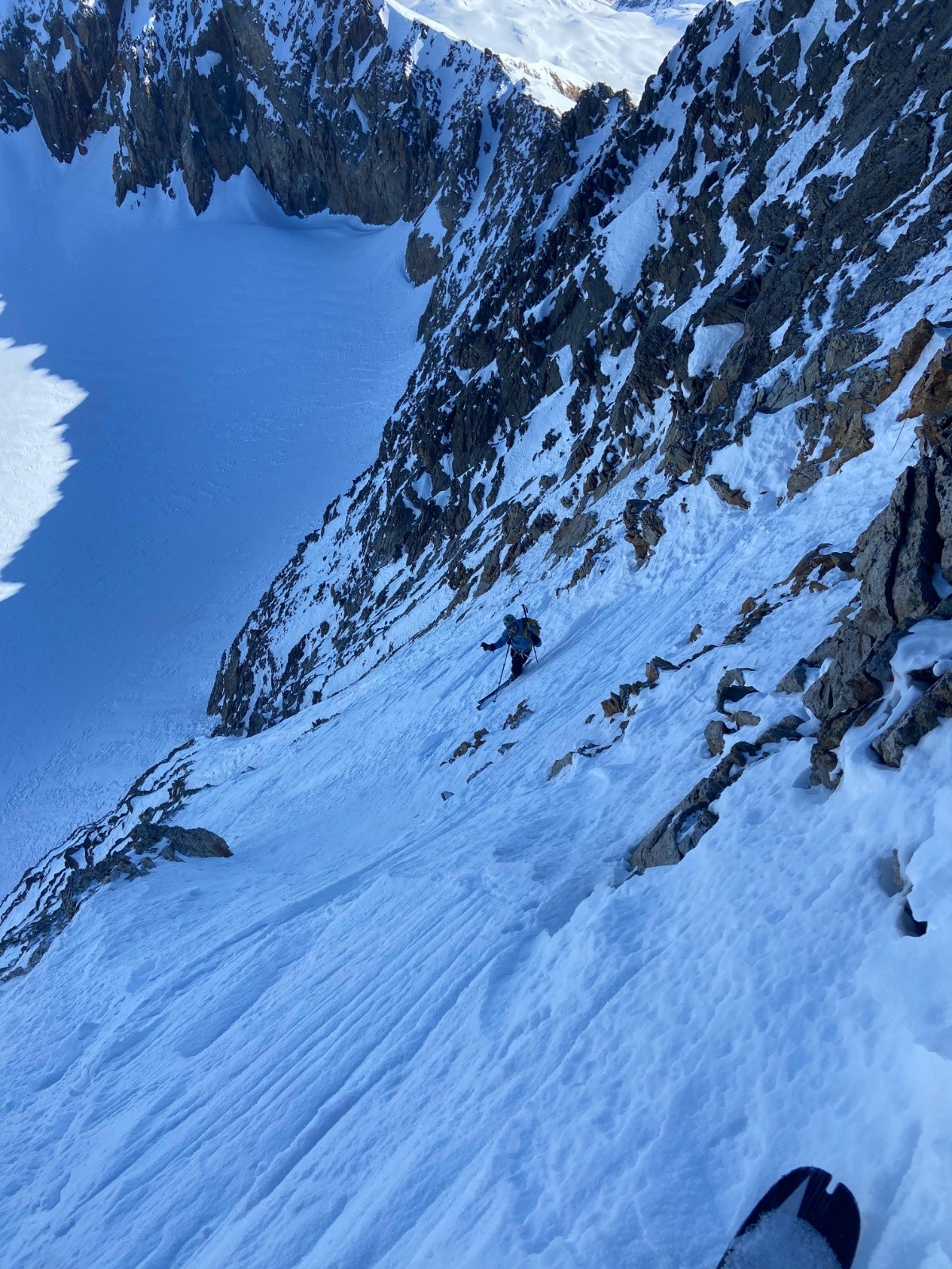 On rejoint le haut de l'écharpe. L'entrée est un peu sèche avec un passage mixte. La suite est beaucoup mieux avec une neige compacte et bon grip. Belle ambiance. On ski sur l'épaule en rive gauche au maximum pour profiter de la meilleure neige possible. Le vent a fait du dégât dans la partie finale et de nombreuses vagues rendent le ski (très) compliqué. Tant pis.