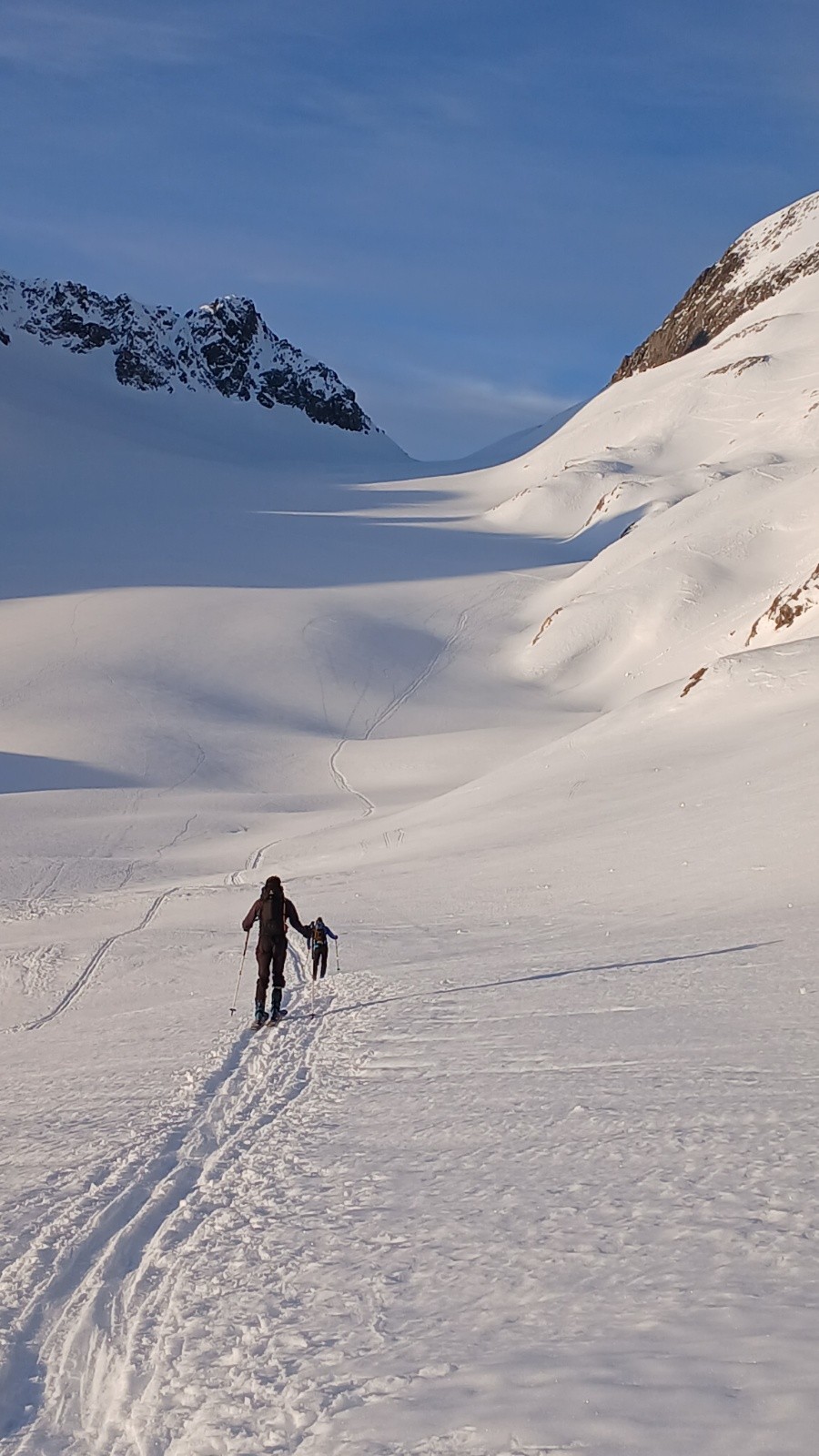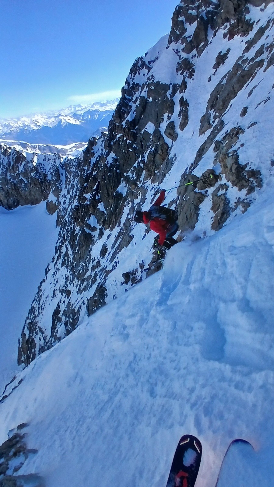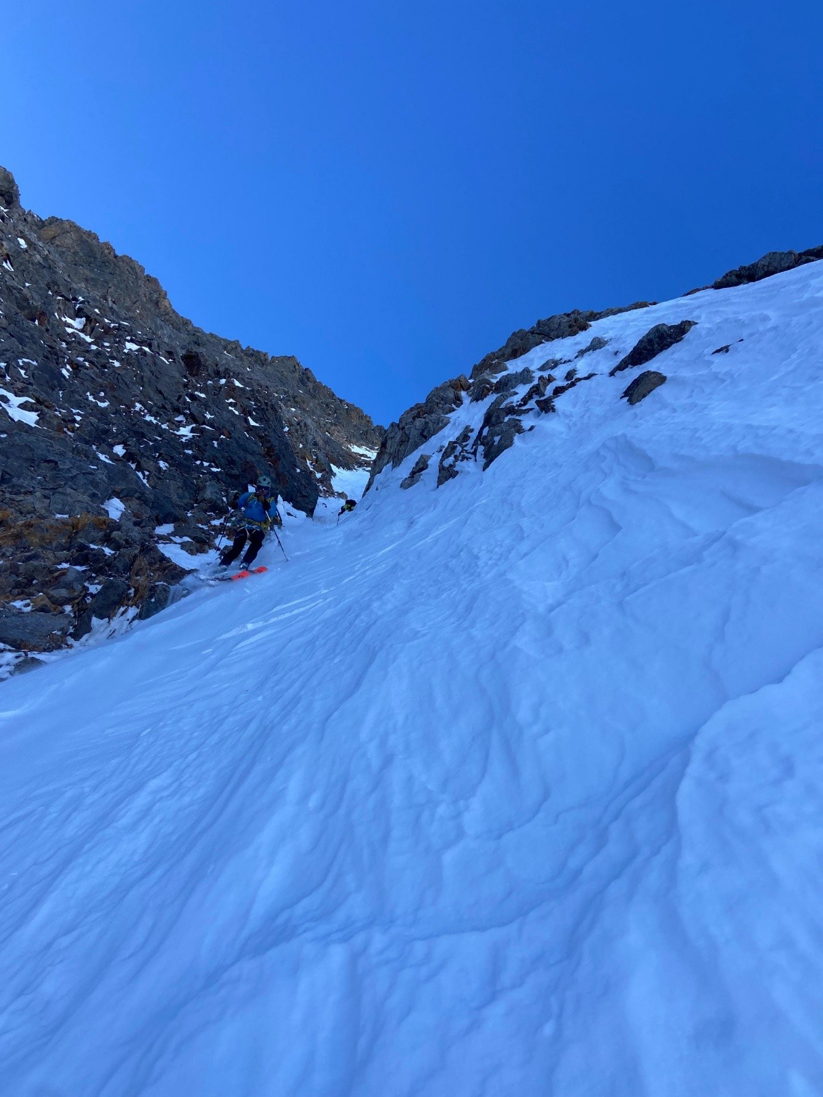 On rejoint le haut de l'écharpe. L'entrée est un peu sèche avec un passage mixte. La suite est beaucoup mieux avec une neige compacte et bon grip. Belle ambiance. On ski sur l'épaule en rive gauche au maximum pour profiter de la meilleure neige possible. Le vent a fait du dégât dans la partie finale et de nombreuses vagues rendent le ski (très) compliqué. Tant pis.