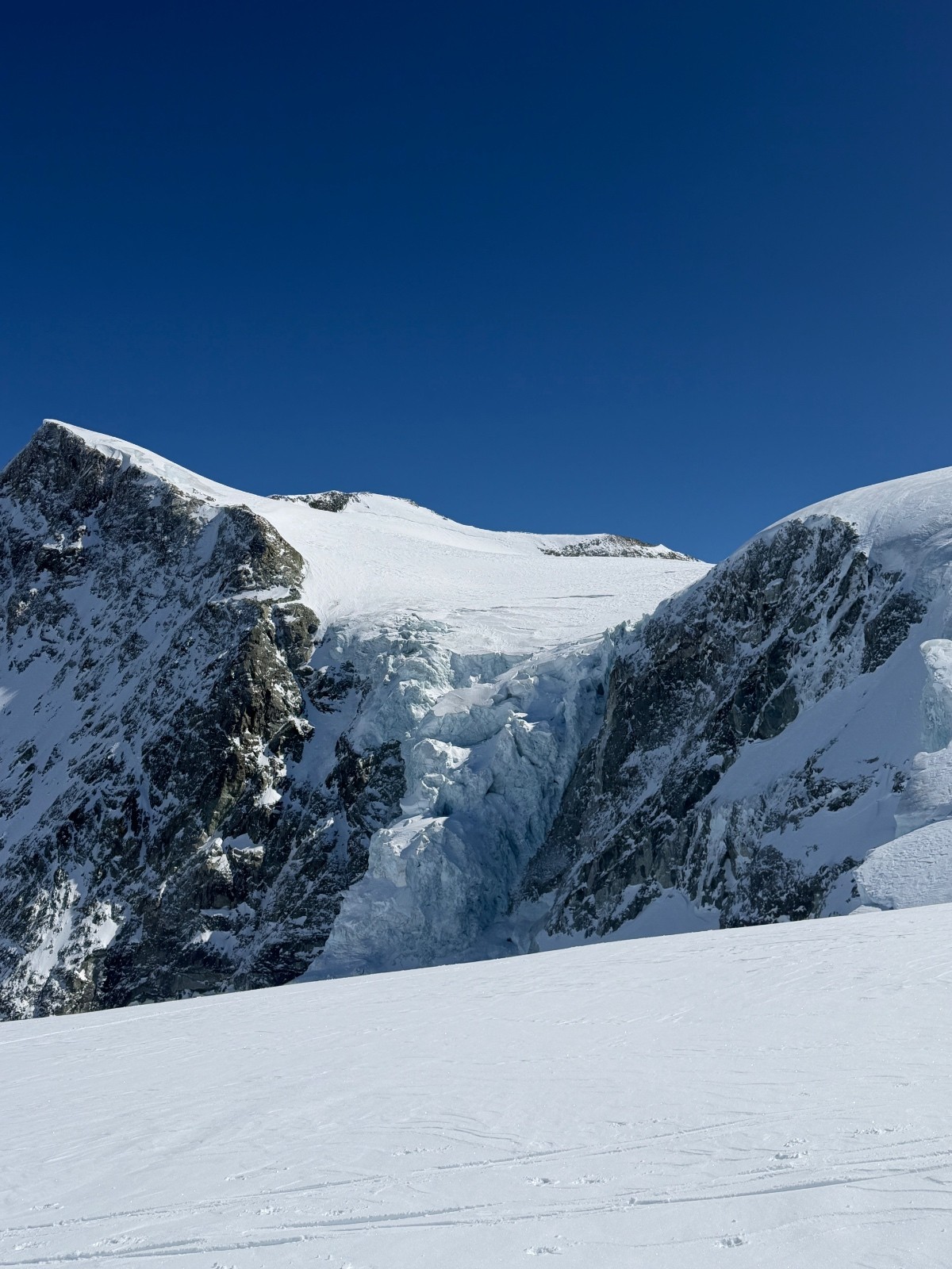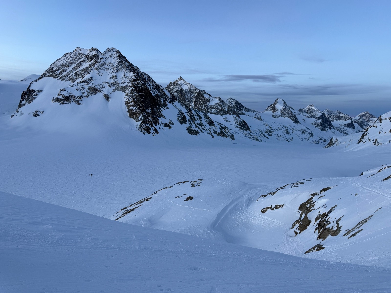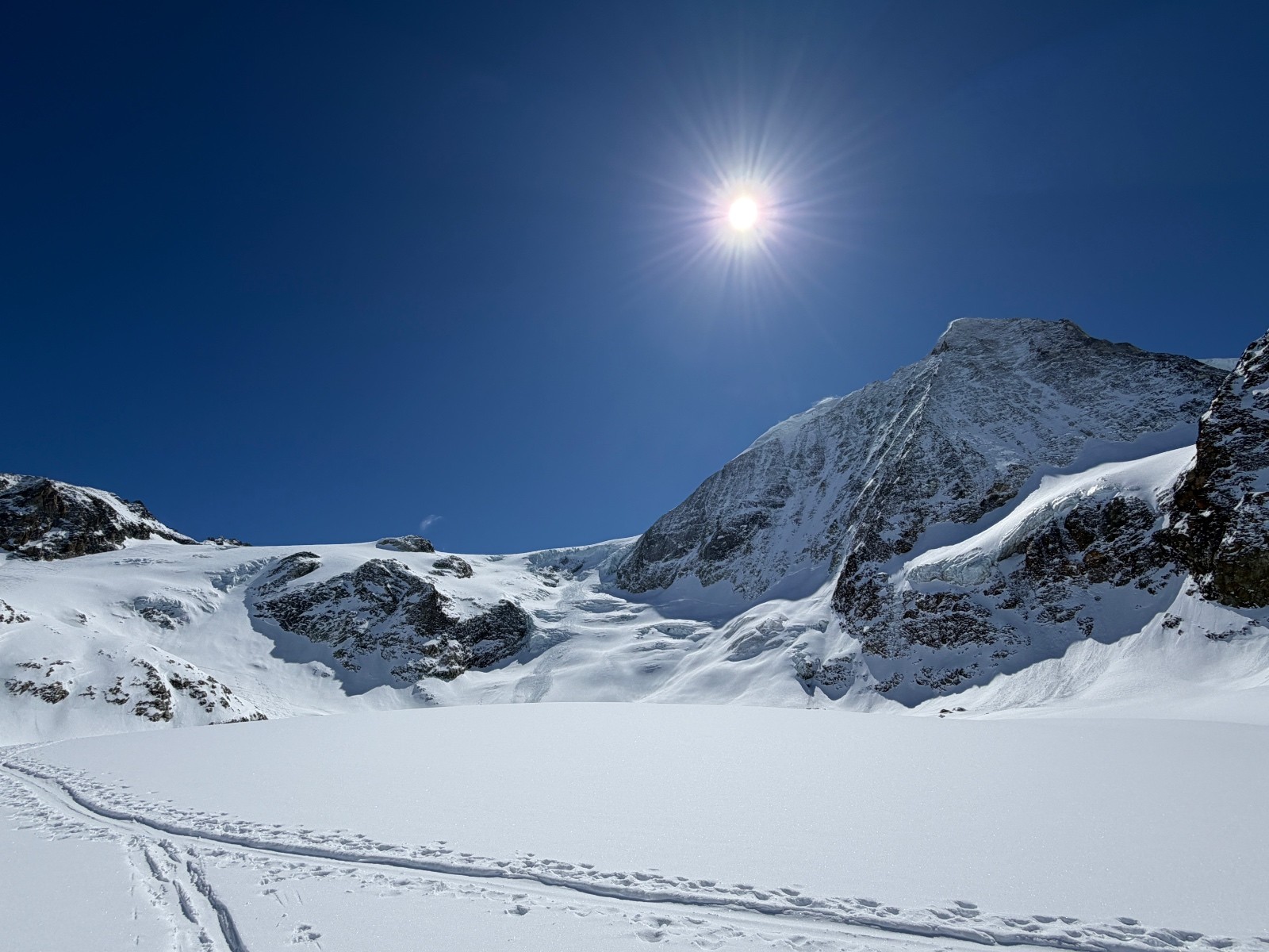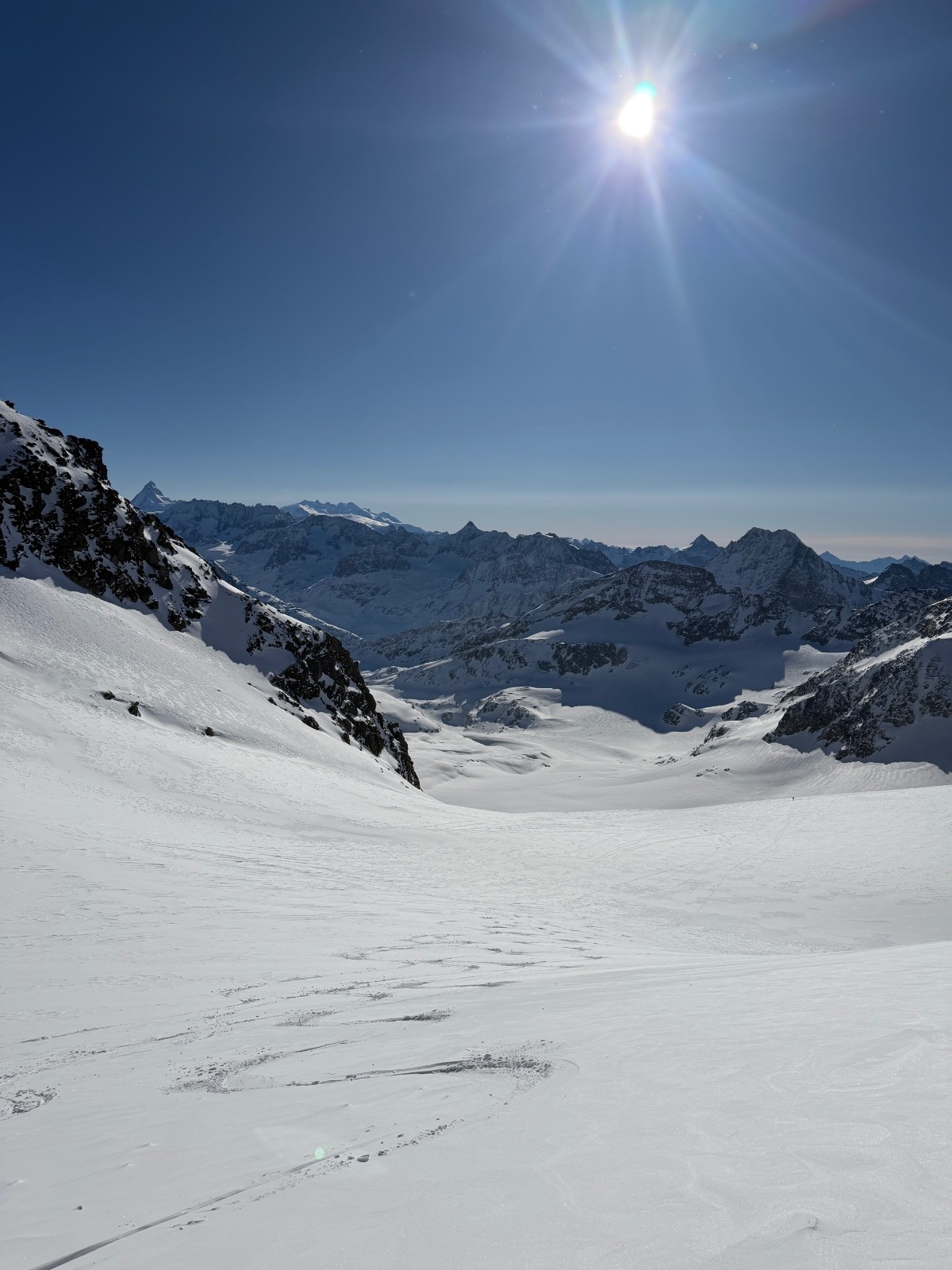 Samedi, après une première journée d’approche et deuxième journée d’échauffement, il fallait une course plus magistral pour marquer notre séjour. Sur les bons conseils de skieurs rencontrés au refuge, nous mettons cap sur le mont Blanc de Cheilon et décidons de l’enchaîner avec le pigne d’arolla. Sommet très esthétique. Accès via des pentes où nous slalomons entre les crevasses et sous les ceracs. Ambiance haute montagne garantie. Les très esthétiques arêtes sommitales et les environs se dégagent quelques minutes après notre arrivée au sommet. Cette fois ci, la providence semble avec nous. Descente dans une poudre durcie jusqu’au glacier en longeant la rimaye pour éviter les crevasses puis sur le glacier jusqu’à col de Cheilon (4*) . Descente dans la combe jusque sous la cabane des Dix en poudreuse protégée par le vent et encore globalement encore froide (5*). Longue remontée jusqu’au col de la Serpentine sous un soleil de plomb. Le dénivelé augmente et nous rappelle qu’enchaîner des courses à +2500 de D+ se fait mieux en Belledonne que dans des environnements haute montagne. Passé le col de la serpentine, les watts manquent, les arrêts se font plus fréquents et le cardio remonte rapidement. Il ne reste plus grand-chose pour atteindre le sommeil mais il faut s’employer sérieusement pour venir à bout du faux plat final.
