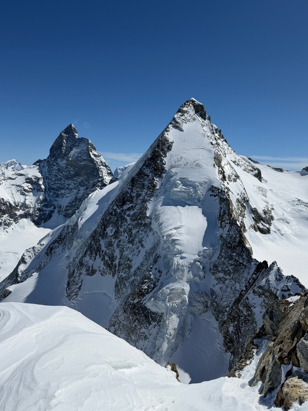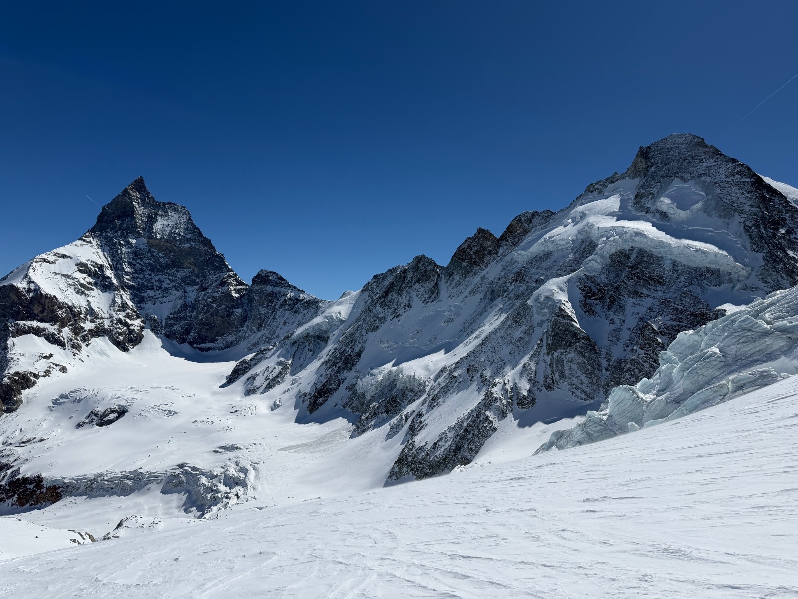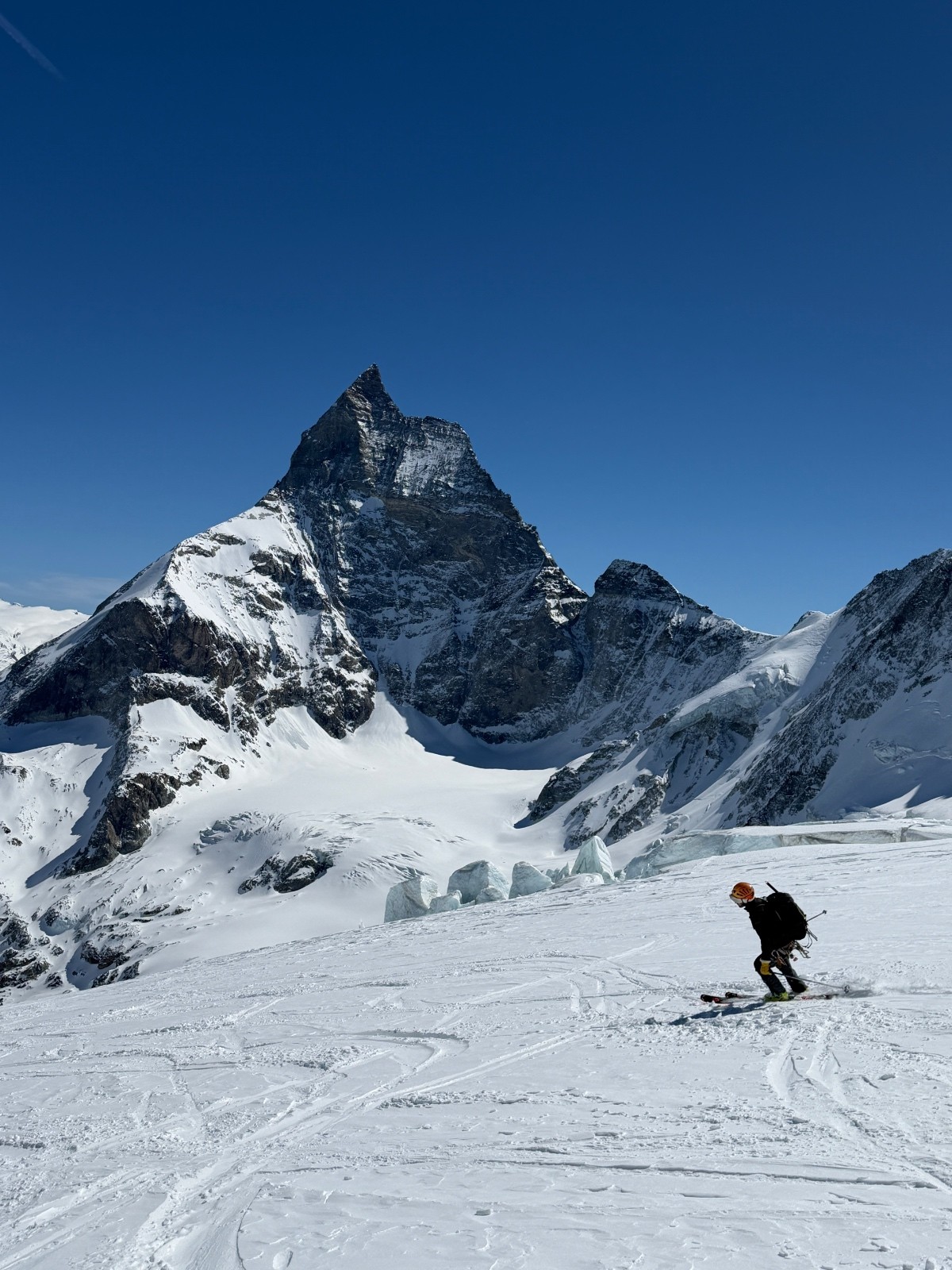 Dimanche, étonnamment la caisse et les jambes reviennent vite malgré la bambée de la veille. Nous gagnons rapidement le col de Valpeline via les cols de l’évêque et du mont brûlé (remonté en crampons). Crochet à la tête de Valpeline pour apprécier le panorama splendide sur le Cervin et la dent d’Herens. Vue à couper à le souffle. Quelle chance d’être ici, à ce moment, avec de telles conditions…! Descente dans un cadre splendide en zigzagant entre les crevasses jusqu’à 3000 (neige 4*) avant de retrouver de la neige transfo au dessous. On se fait dépasser par deux flèches qu’on ne tarde pas à encourager en criant… record de la Cham-Zermatt battue :)