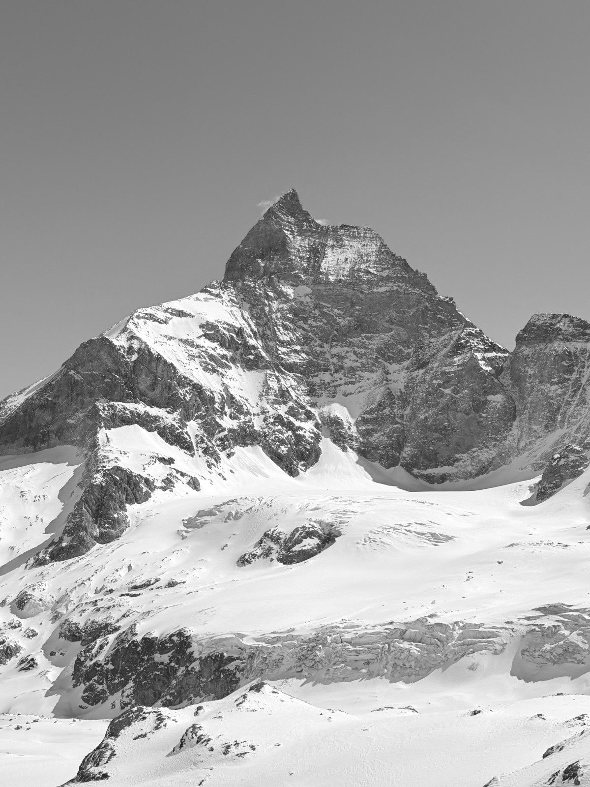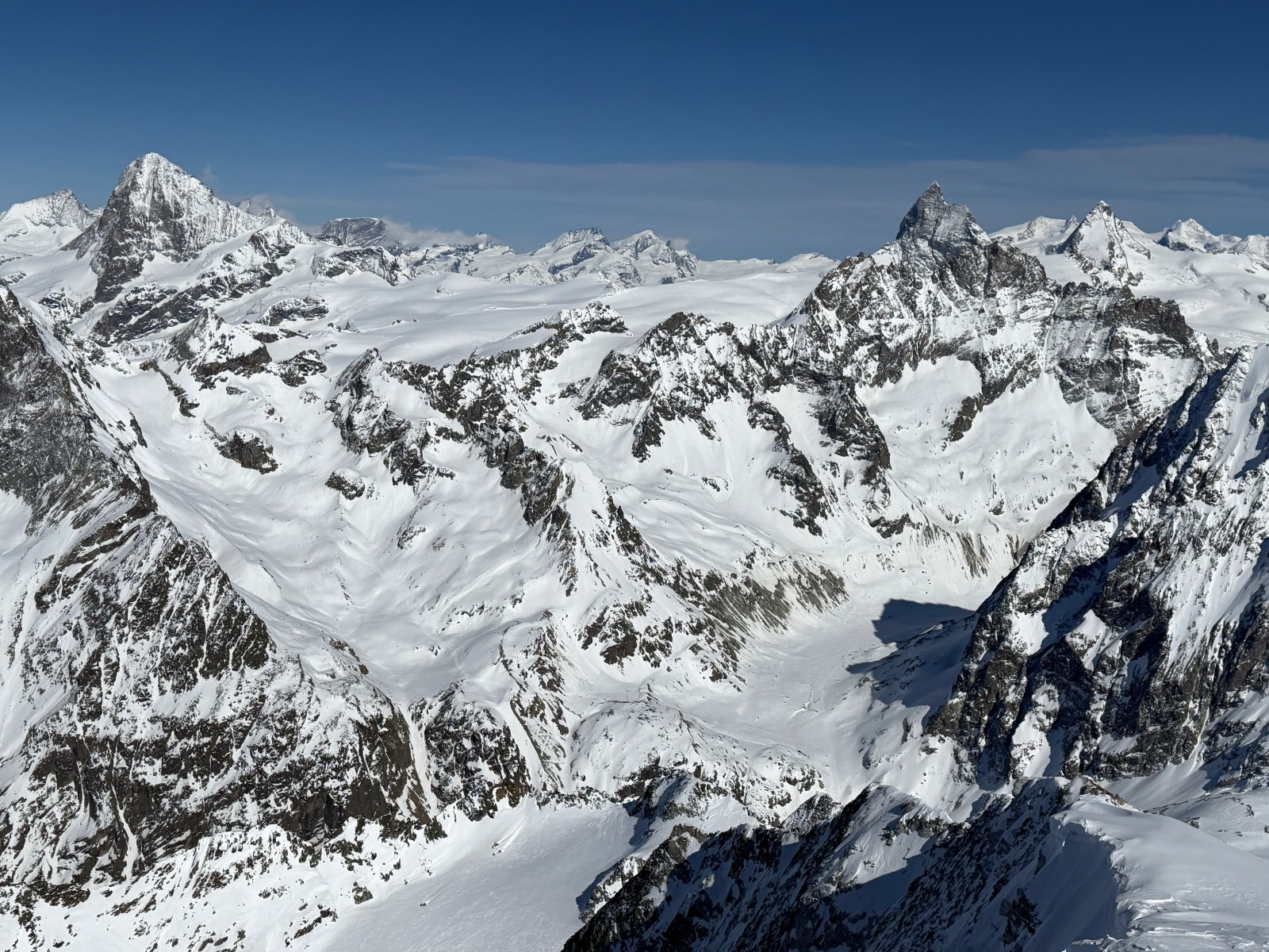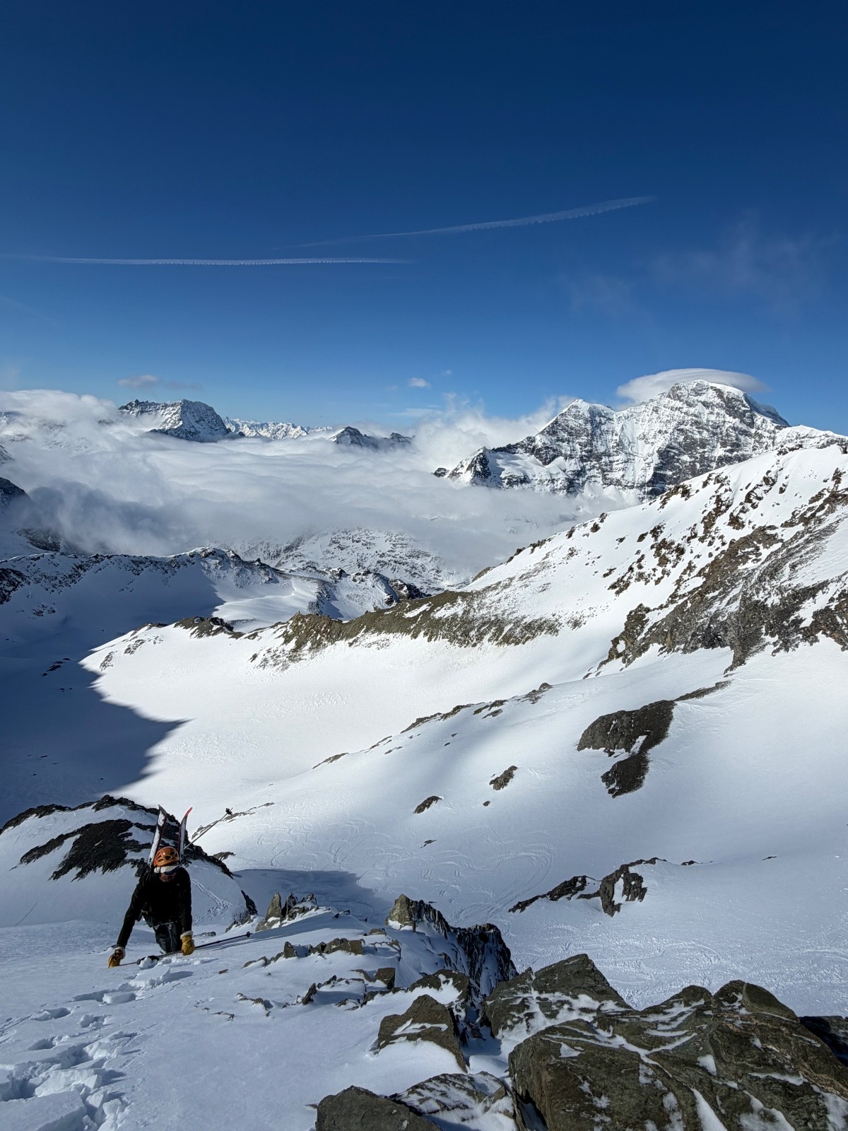 Dimanche, étonnamment la caisse et les jambes reviennent vite malgré la bambée de la veille. Nous gagnons rapidement le col de Valpeline via les cols de l’évêque et du mont brûlé (remonté en crampons). Crochet à la tête de Valpeline pour apprécier le panorama splendide sur le Cervin et la dent d’Herens. Vue à couper à le souffle. Quelle chance d’être ici, à ce moment, avec de telles conditions…! Descente dans un cadre splendide en zigzagant entre les crevasses jusqu’à 3000 (neige 4*) avant de retrouver de la neige transfo au dessous. On se fait dépasser par deux flèches qu’on ne tarde pas à encourager en criant… record de la Cham-Zermatt battue :)