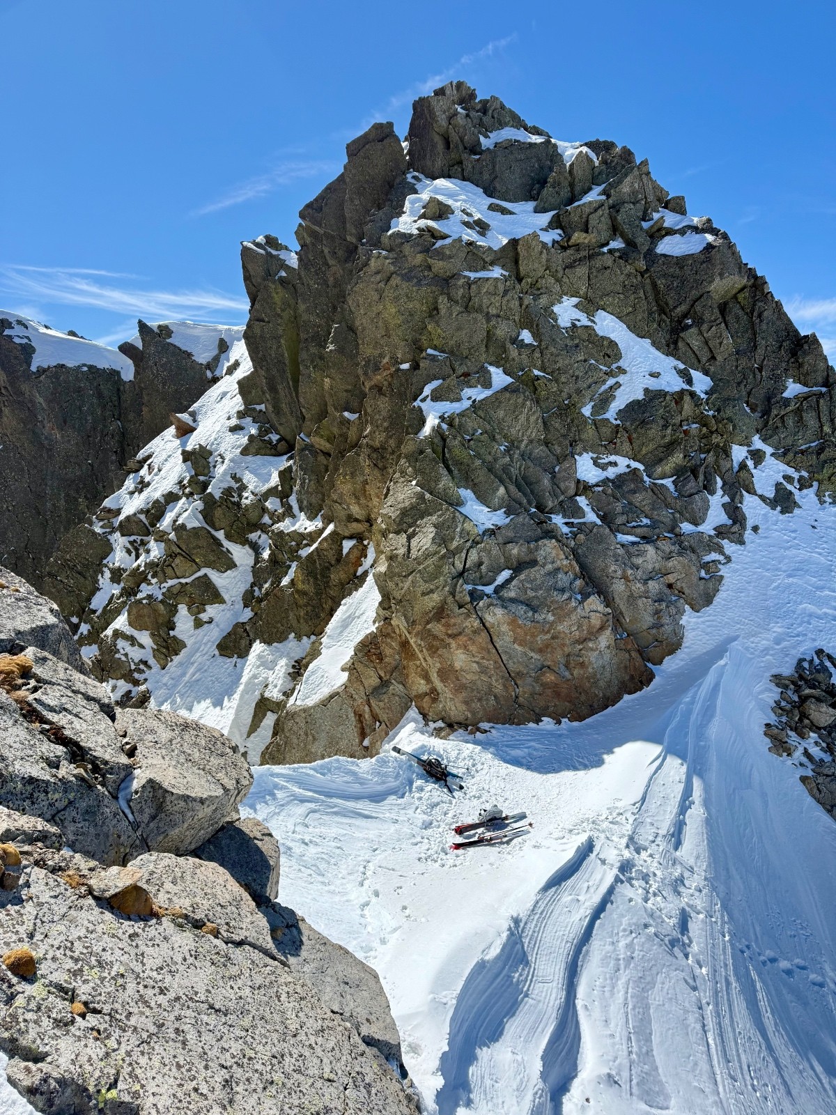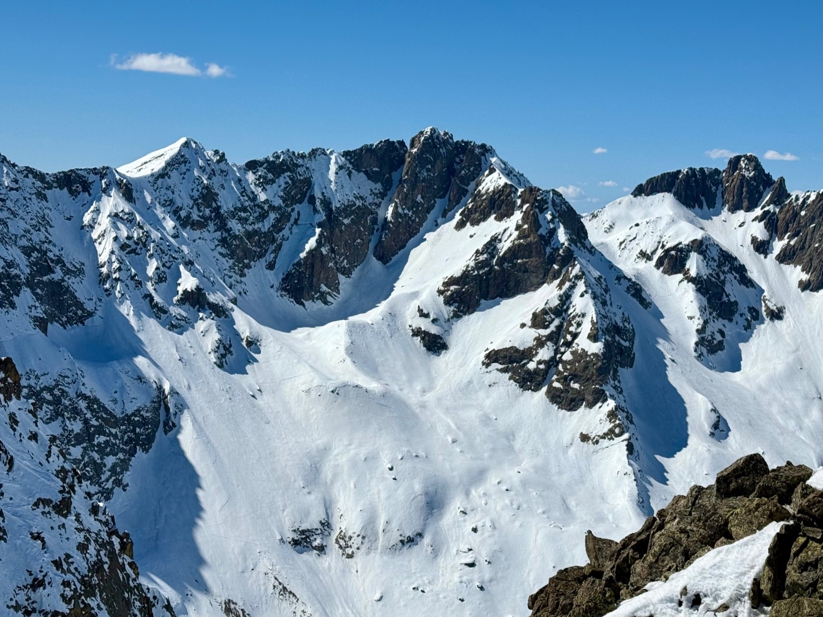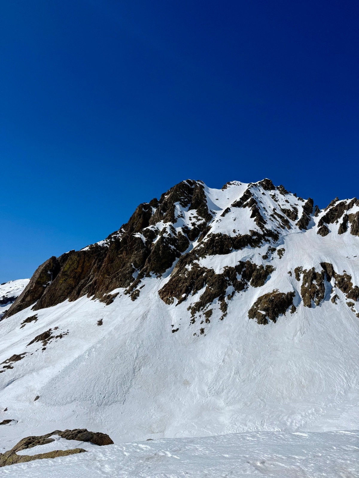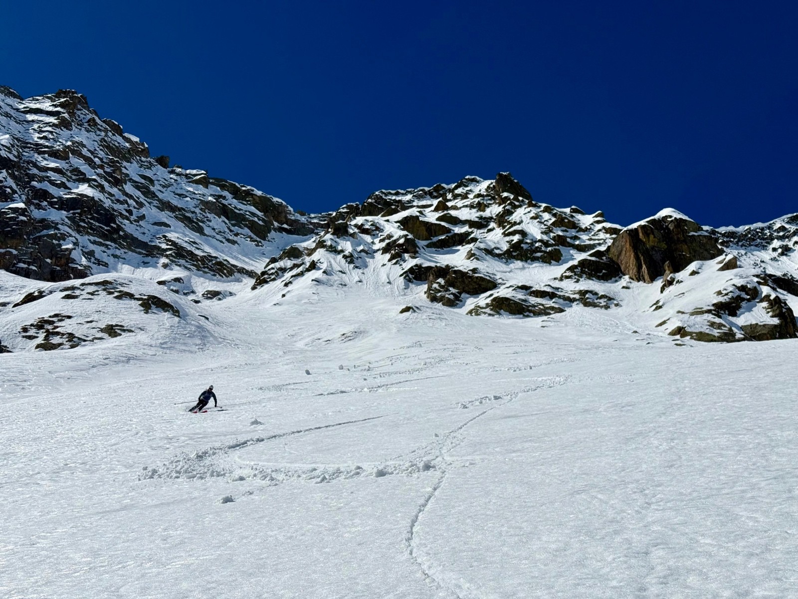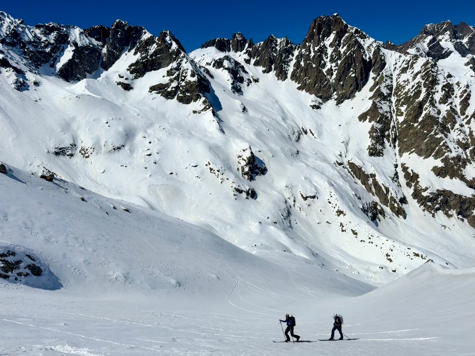 Conditions nivo et activité avalancheuse : 1 purge moyenne en face NE de la tête de la Ruine. Anciennes purges avec cassure de plaque parfois conséquentes en tous versants (SE du Caire Agnel ravagé, faces NE) ; escargots fréquents dans les pentes ayant chauffé. Sluff sous les skis dans le E du Brocan.