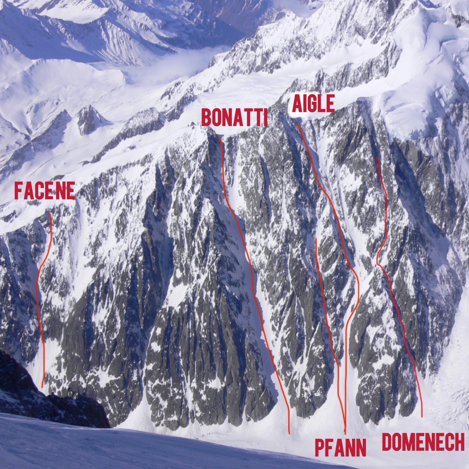 Bonatti branche de Droite : On chausse en haut mais on cramponne plus bas, neige dure, manque de remplissage dans les étroitures. 80 me désescalade qu’on a connu plus agréable. Ensuite c’est une neige changeante, un peu piegeuse mais correcte. Quand la pente se calme on lache un peu les chevaux et on aperçoit les traces de Jules sur le bas.