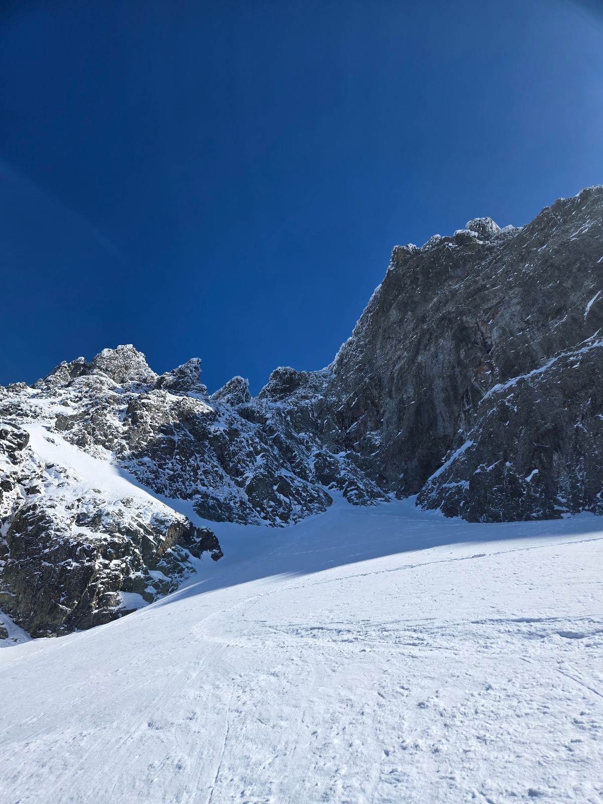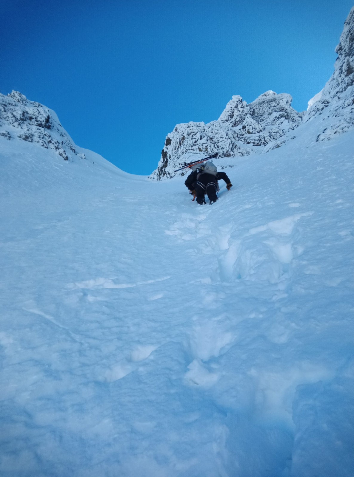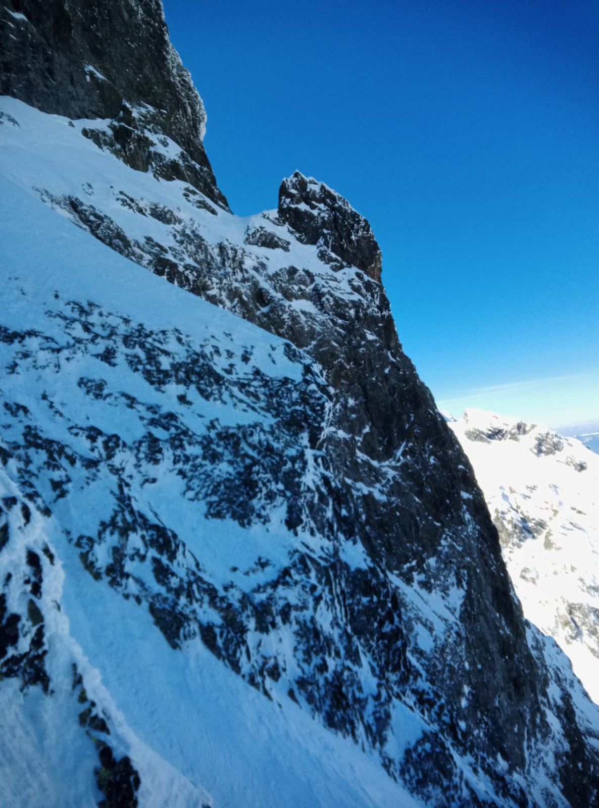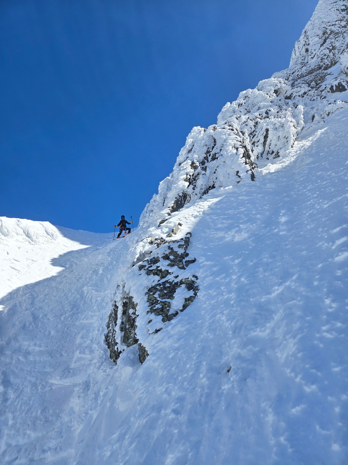 On remonte la face bien plus rapidement que prévu, repérant la ligne qui skie en bas (que l'on ne fera pas car en conditions de neige mauvaises).