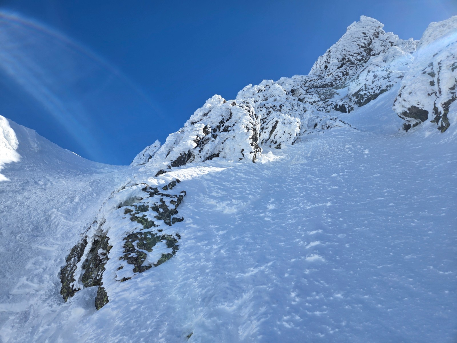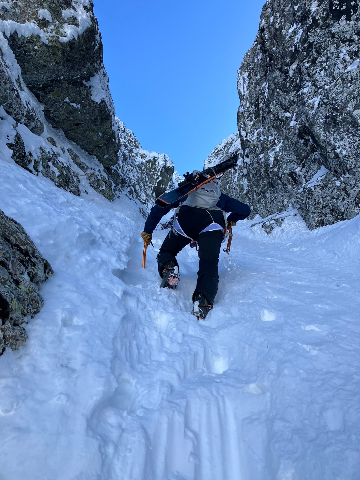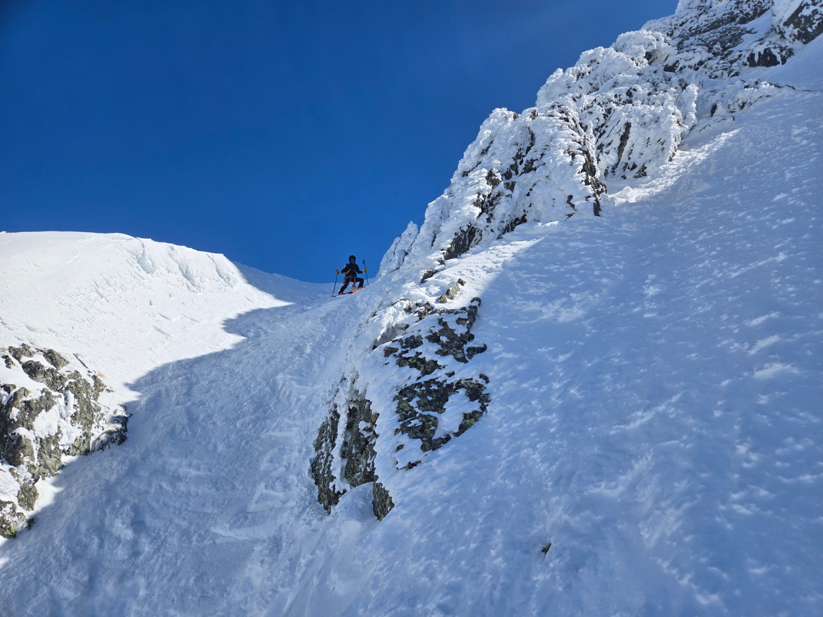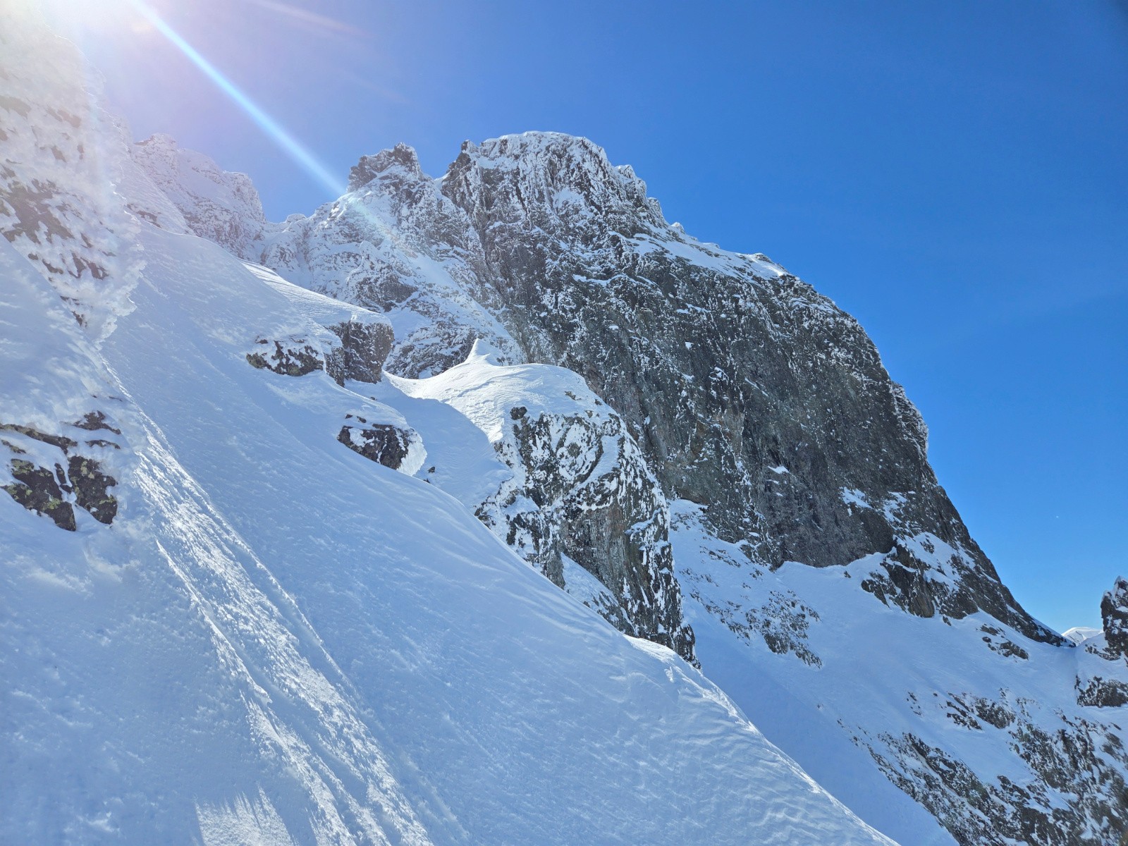 On remonte la face bien plus rapidement que prévu, repérant la ligne qui skie en bas (que l'on ne fera pas car en conditions de neige mauvaises).