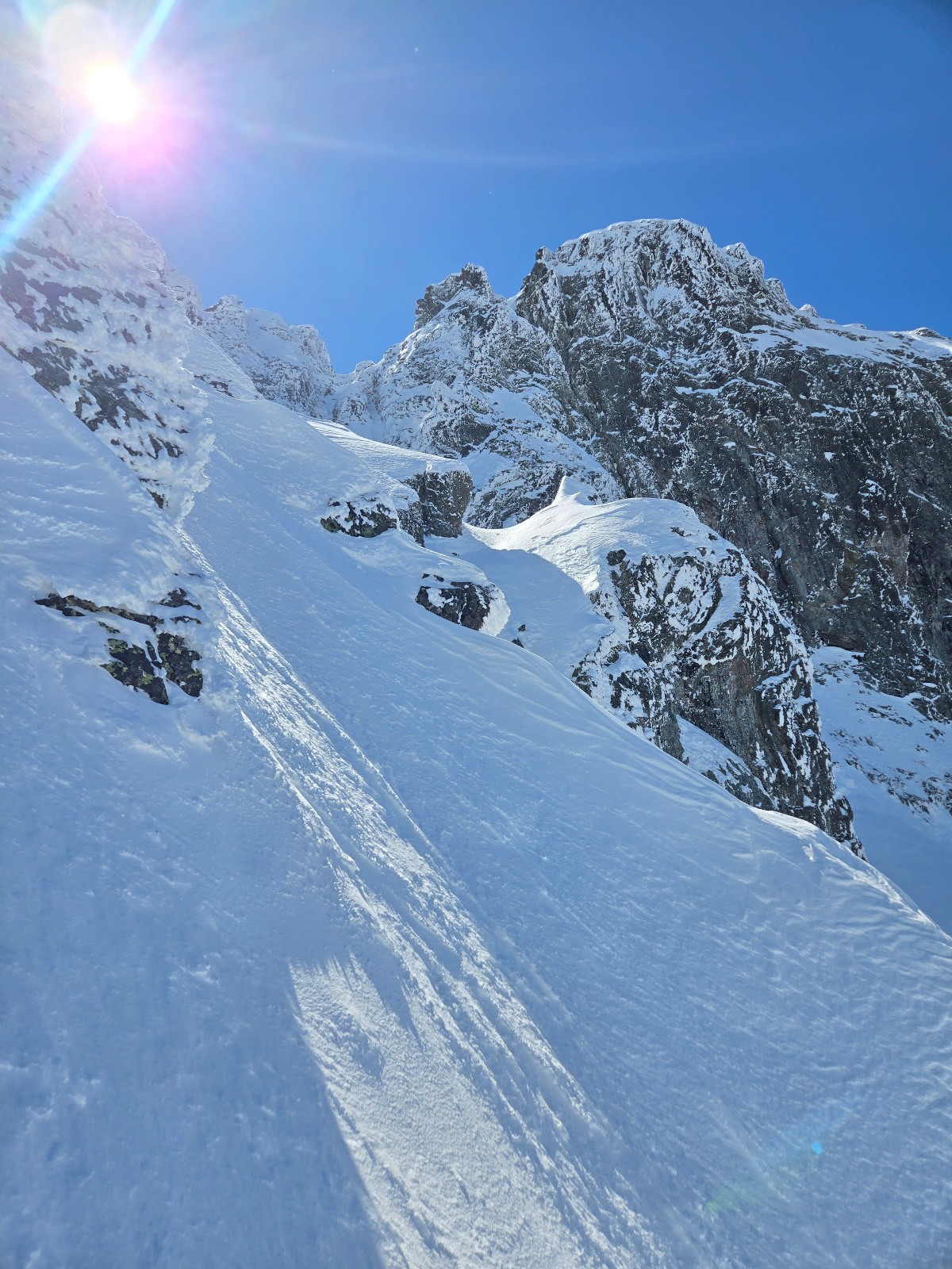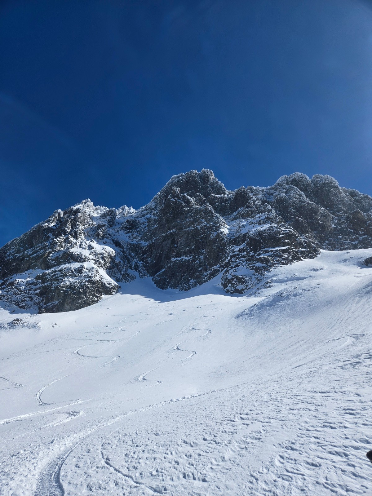 Conditions pour le ski : pas terribles. Beaucoup de croûte de regel assez épaisse lustrée, difficile à casser parfois, sucre sur dalles