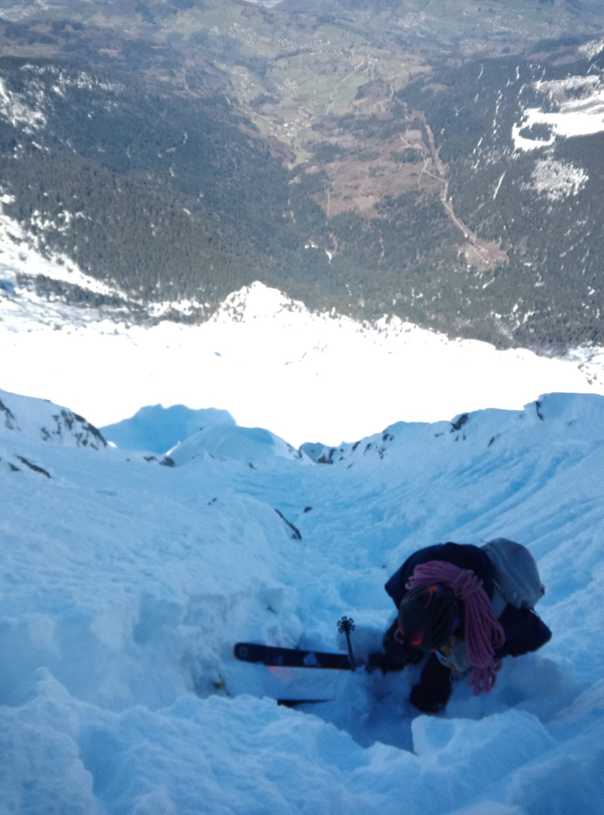 Au goulet, congelés, fatigués, le groupe décide de lâcher un peu le ski et de finir en rappels et désescalade. On aura rarement eu aussi froid !