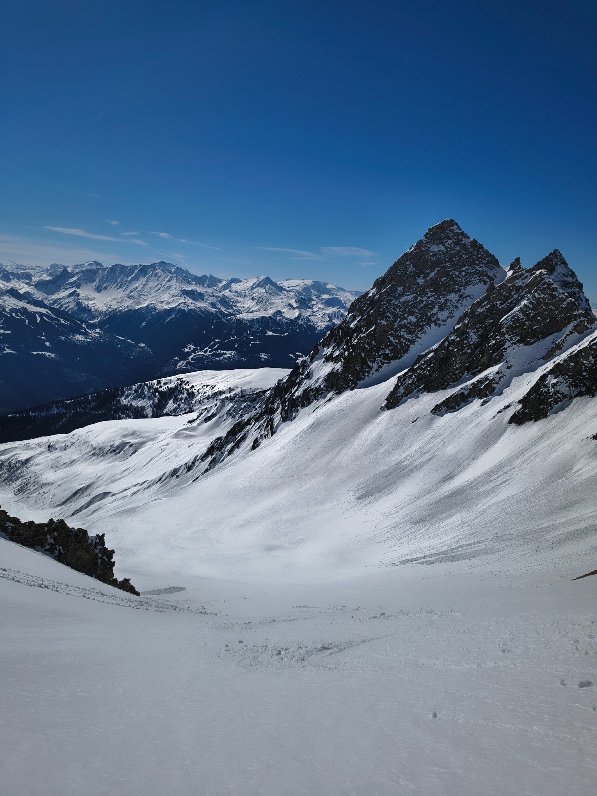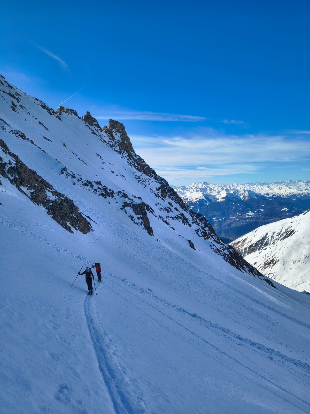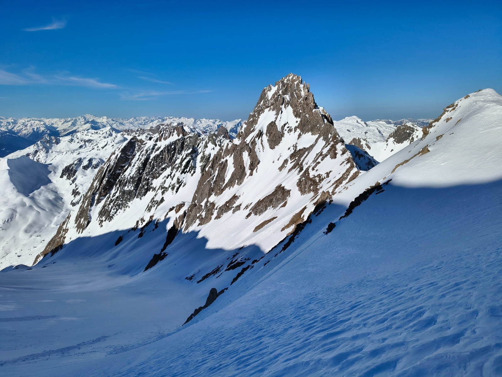 Conditions pour le ski : bon regel, moquette déjà épaisse à 11h en versant Sud, qui deviendra vite de la soupe collante. Neige cartonnée dans le couloir du Roignais