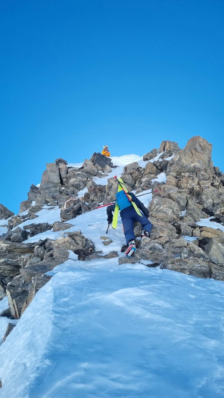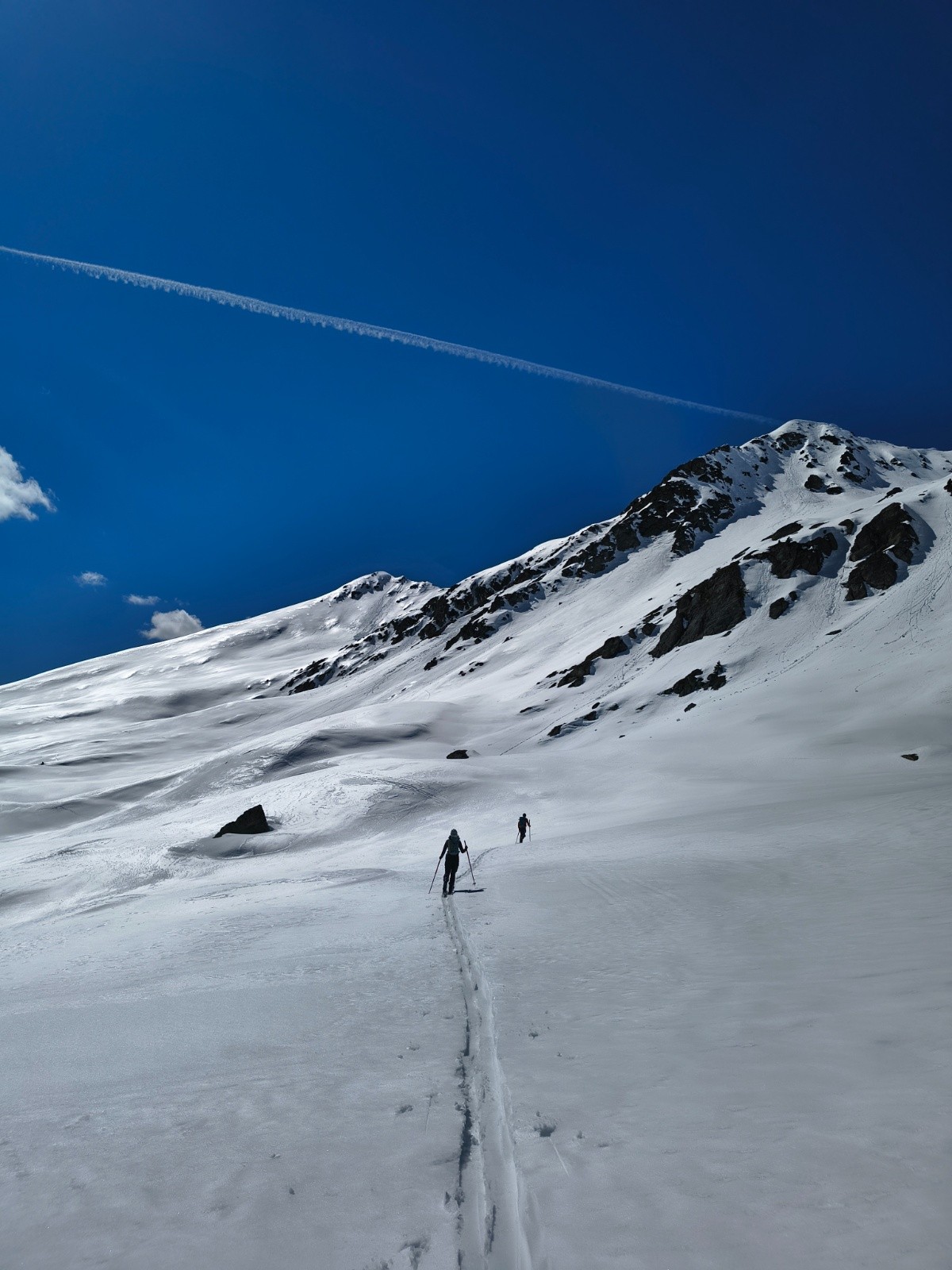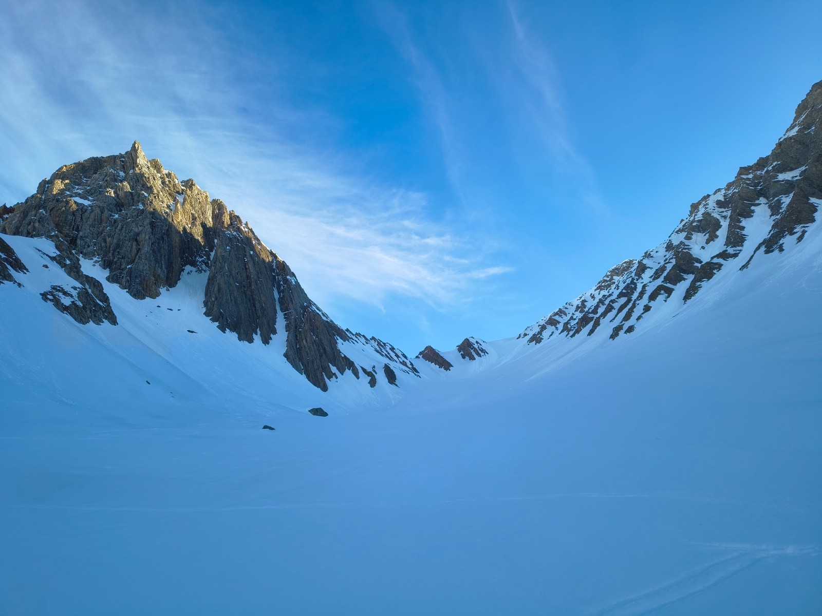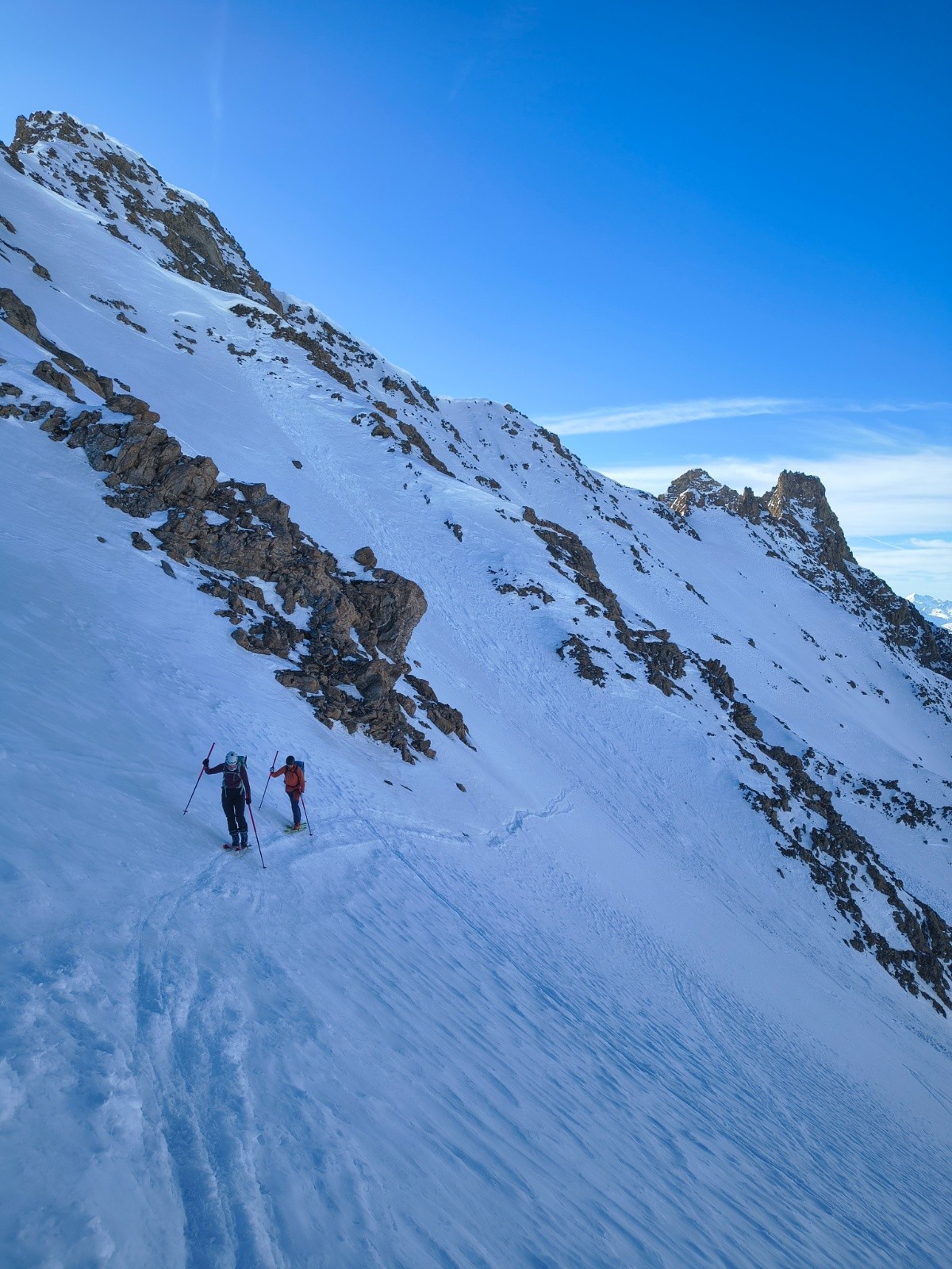 Conditions pour le ski : bon regel, moquette déjà épaisse à 11h en versant Sud, qui deviendra vite de la soupe collante. Neige cartonnée dans le couloir du Roignais