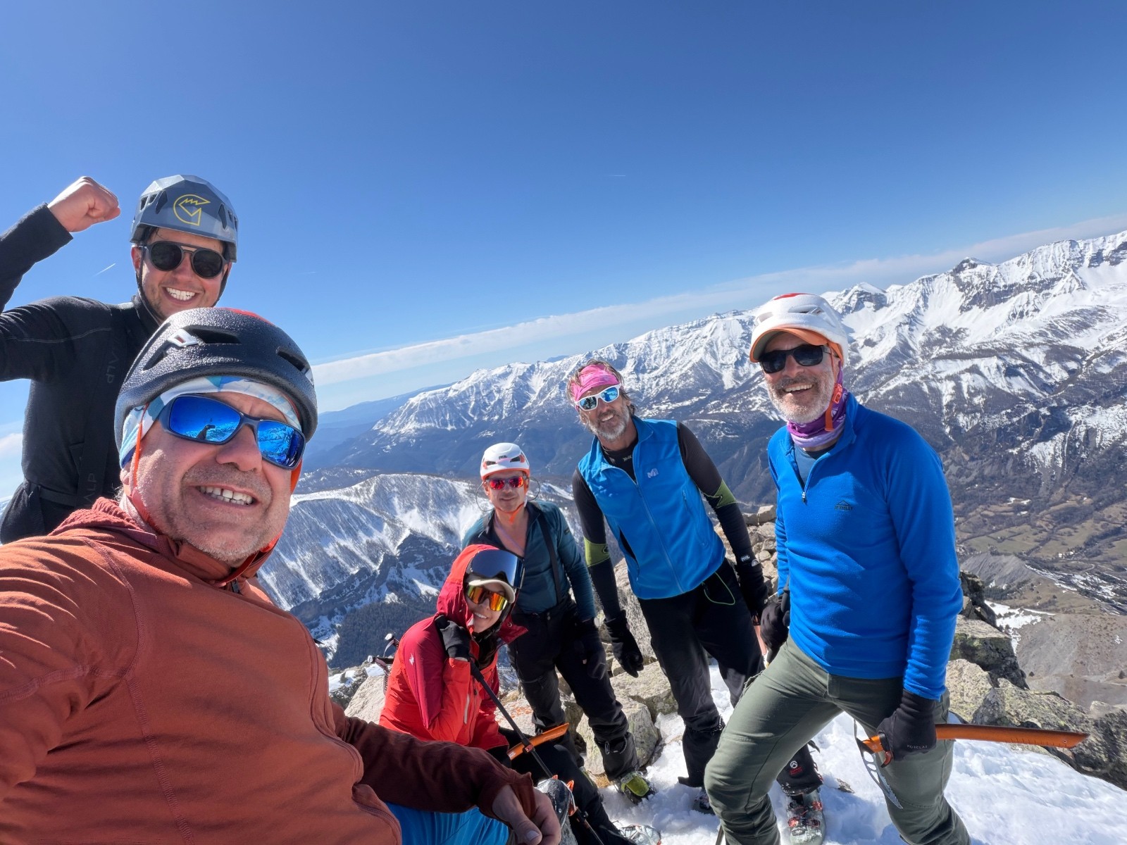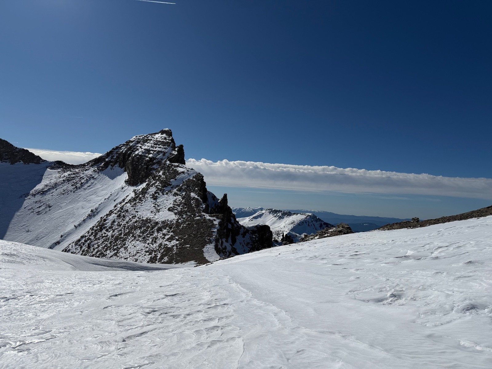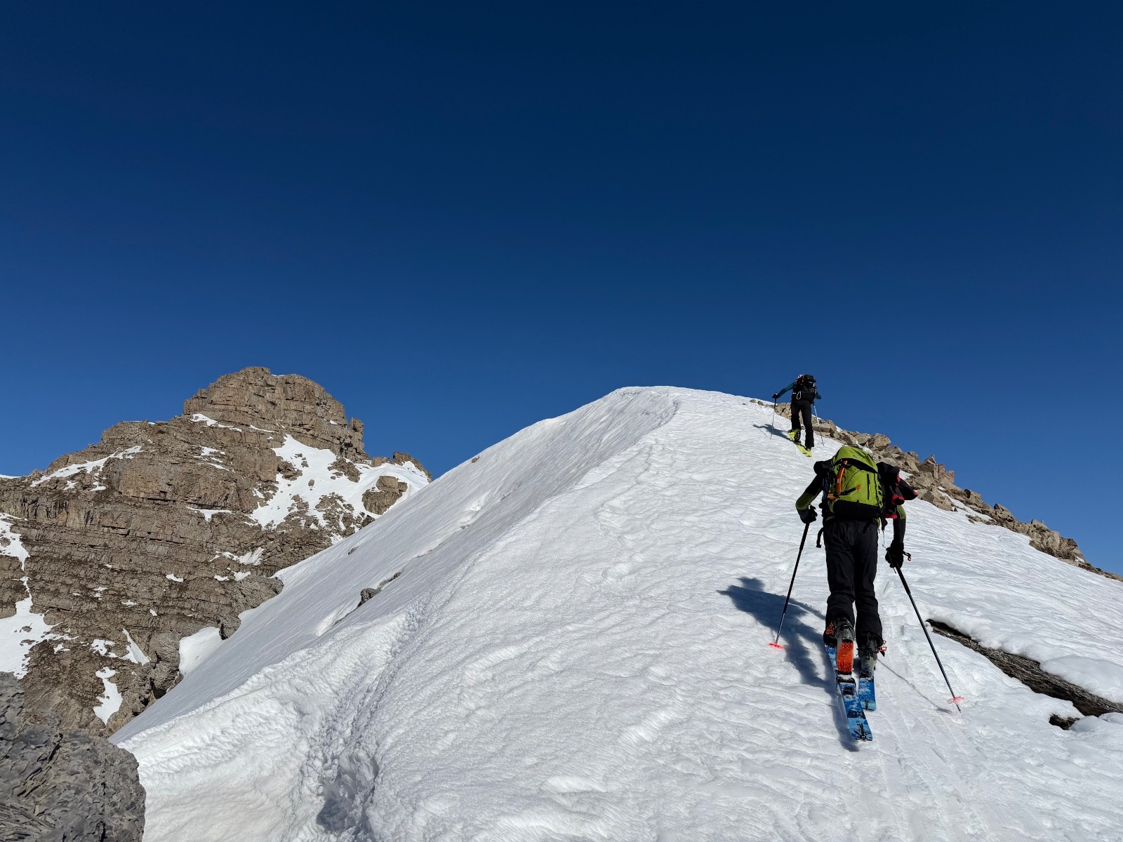 On manque de superlatif pour décrire une si belle journée. Une très sympathique et efficace petite équipe pour réaliser cette traversée à la fois alpine, esthétique, et skiante à la descente. On a pu monter jusqu’à la crête en ski et couteau puis place au portage sur le cheminement de crête et quelques passages nécessitant les crampons pour sortir le sommet.