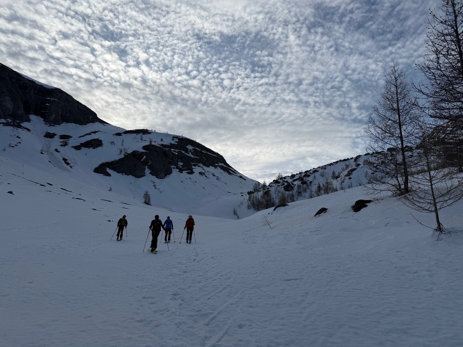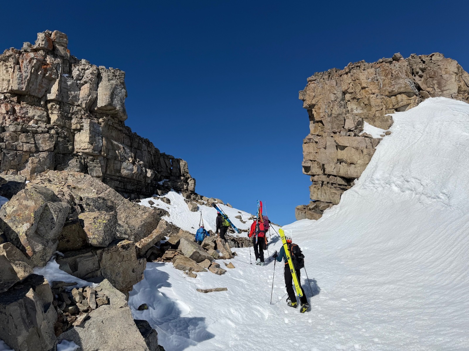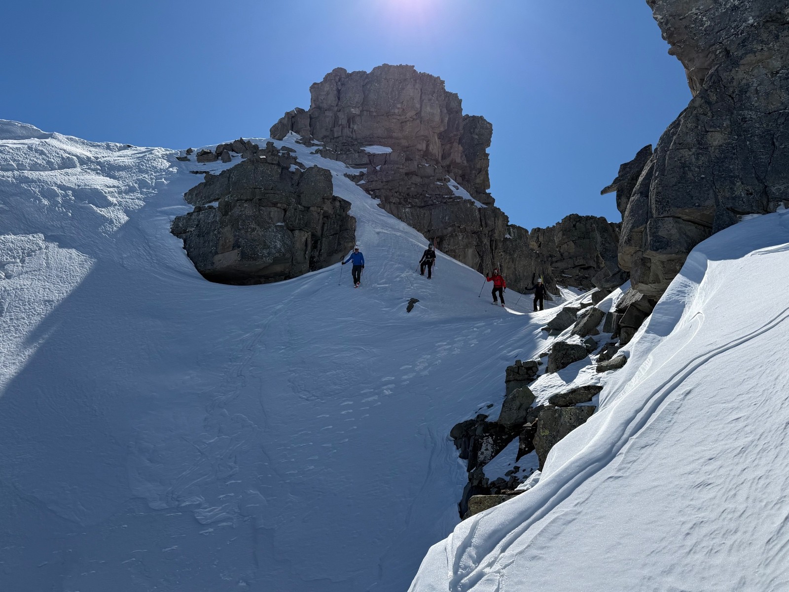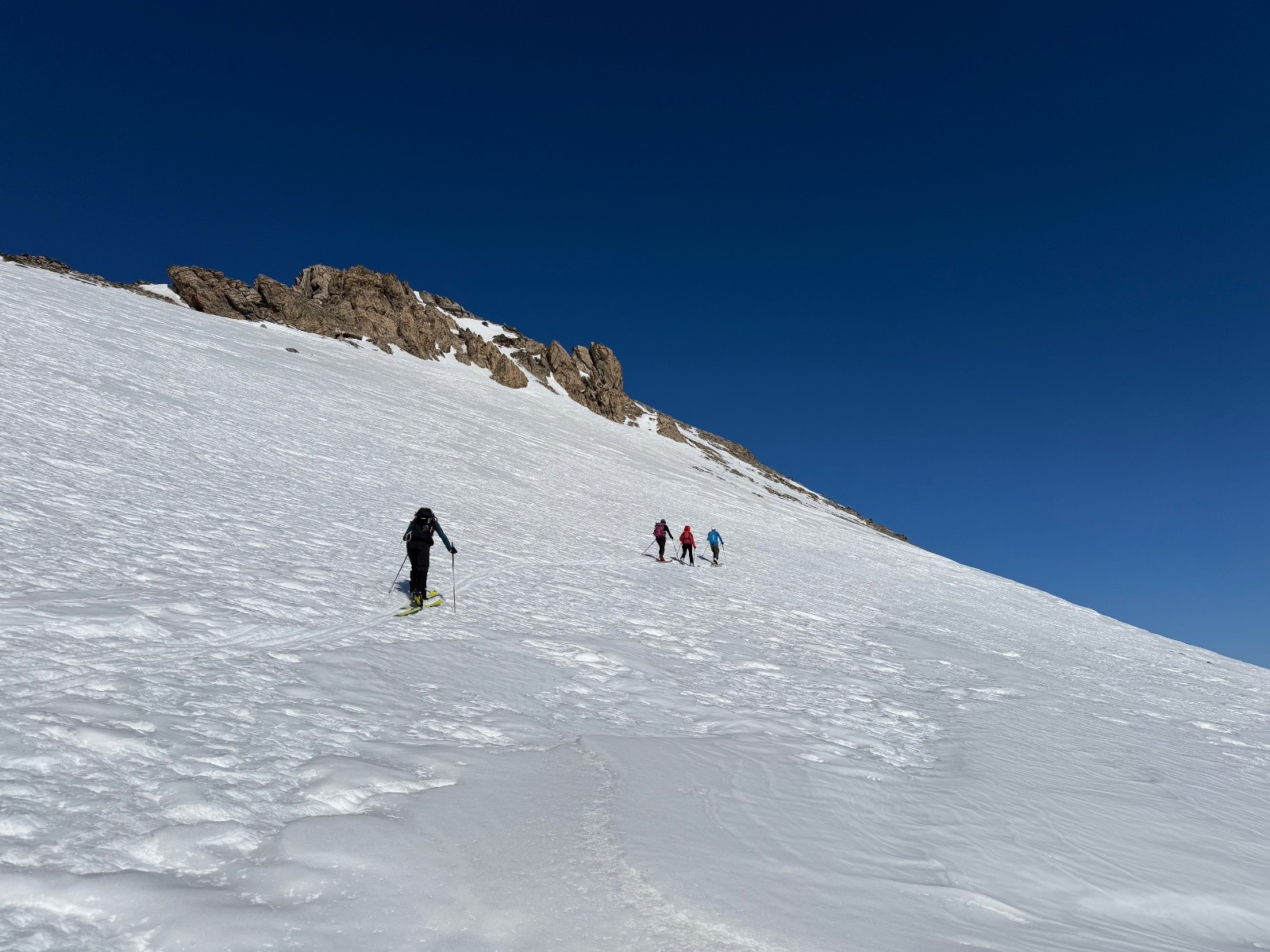 On manque de superlatif pour décrire une si belle journée. Une très sympathique et efficace petite équipe pour réaliser cette traversée à la fois alpine, esthétique, et skiante à la descente. On a pu monter jusqu’à la crête en ski et couteau puis place au portage sur le cheminement de crête et quelques passages nécessitant les crampons pour sortir le sommet.