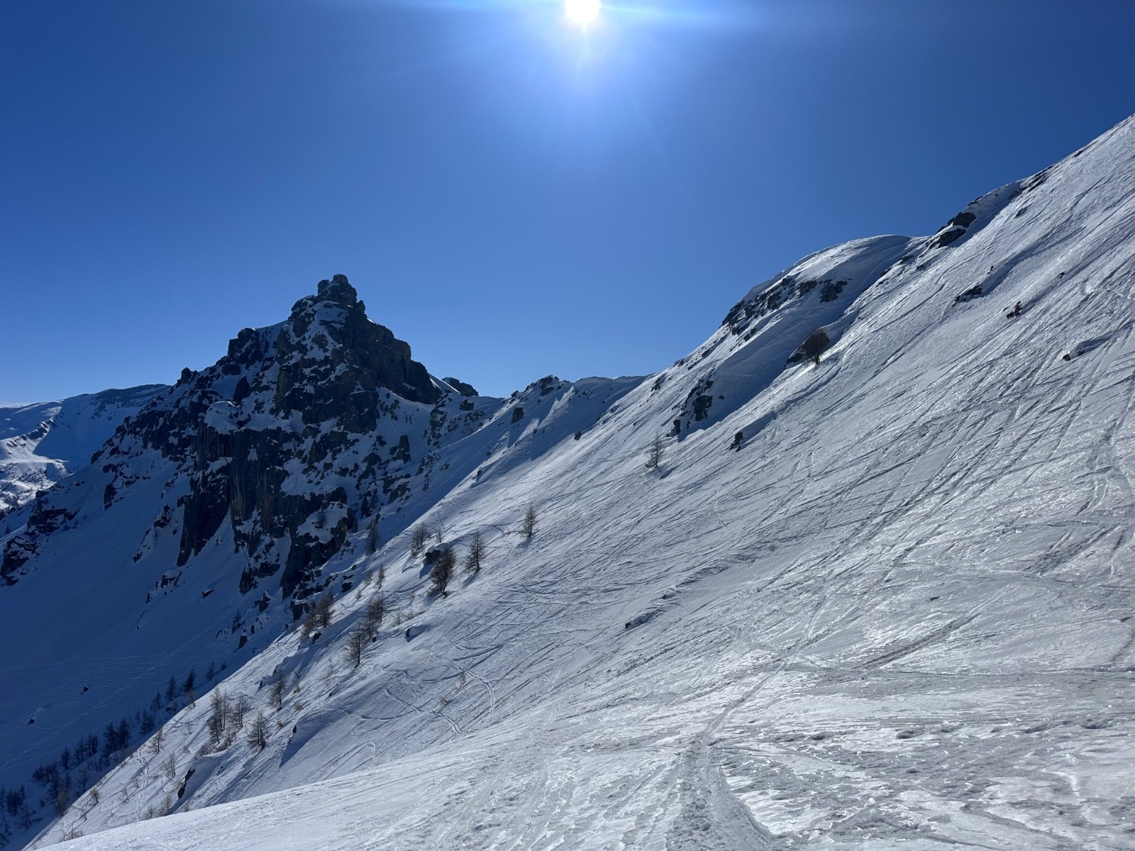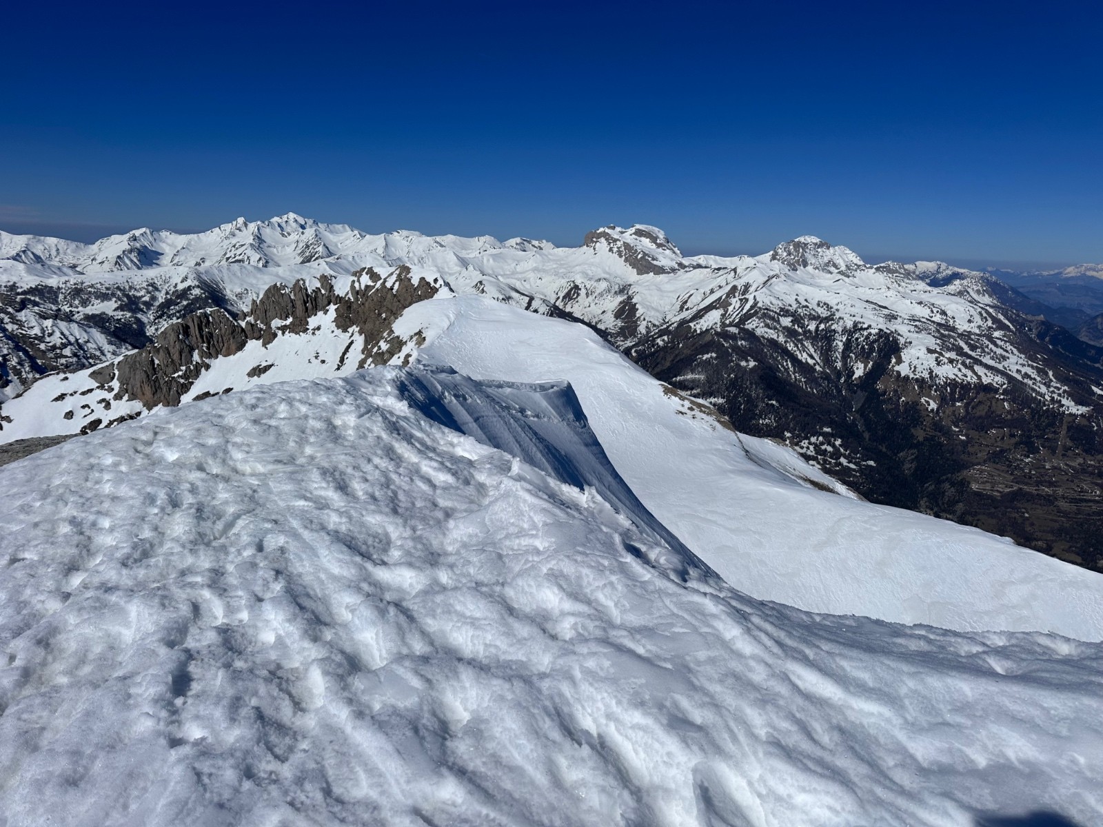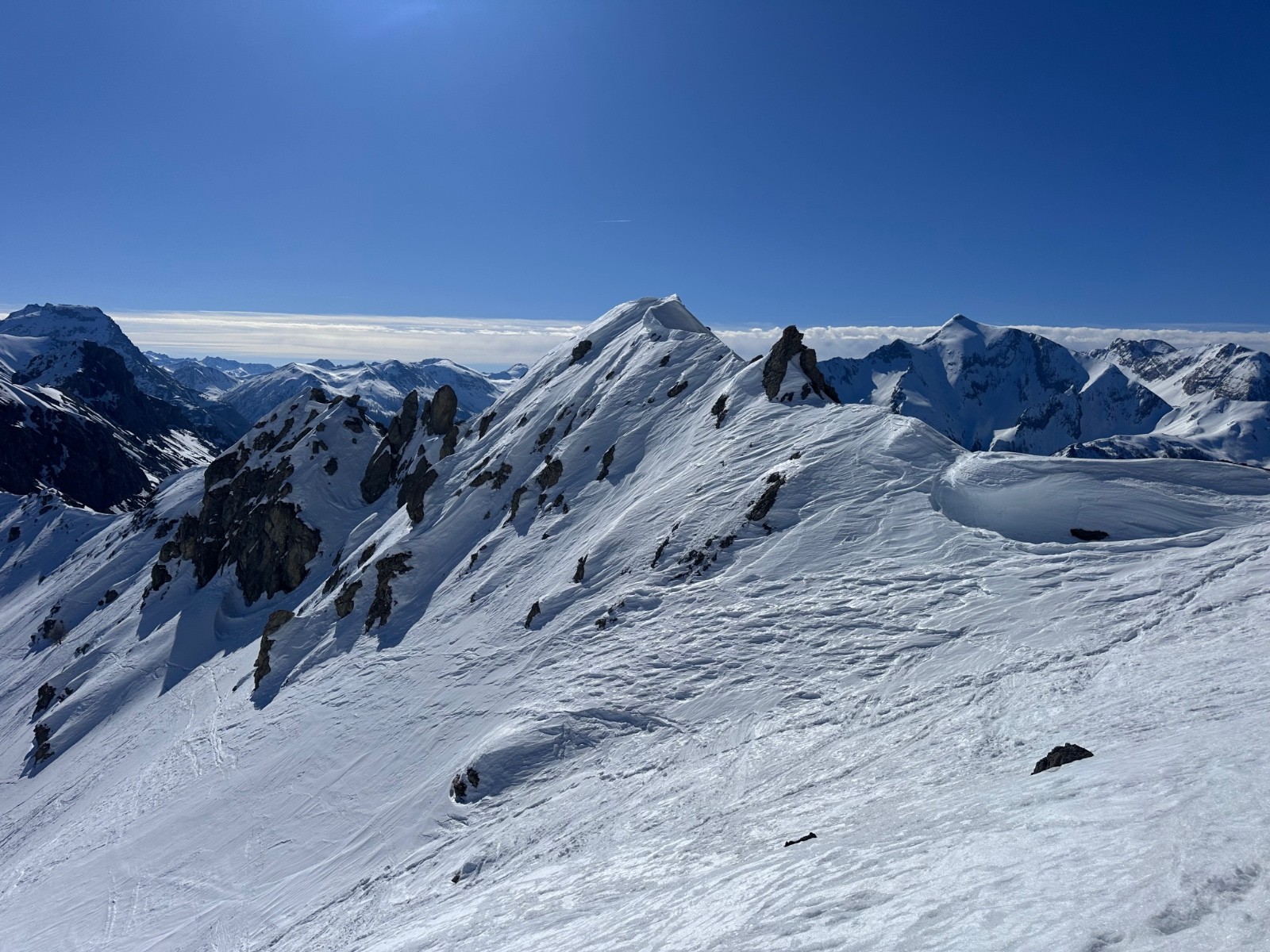 Conditions nivo et activité avalancheuse : bonnes conditions. Attention au fort réchauffement, départs ponctuels d'avalanche de fonte en faces Ouest et Nord-Ouest, résidus avec amas de blocs dans la traversée sous le Brec Second pour rejoindre le haut des pistes du Super Sauze