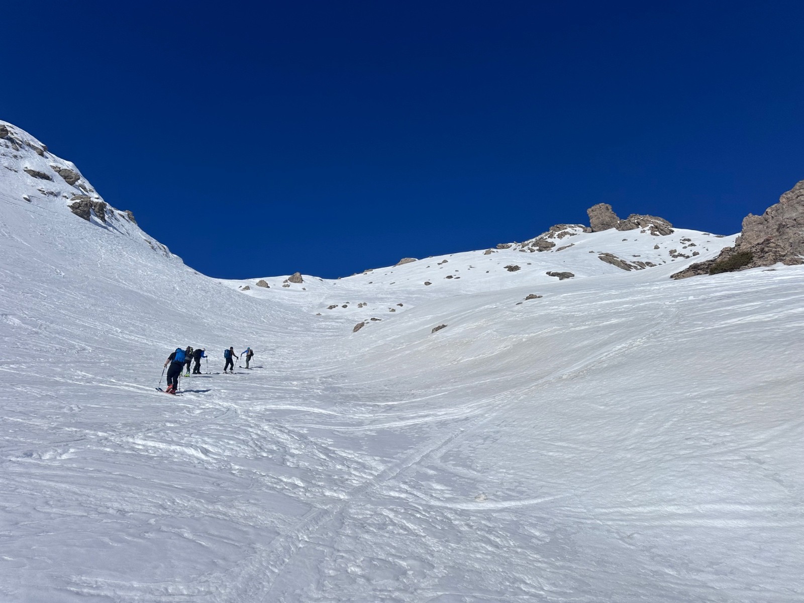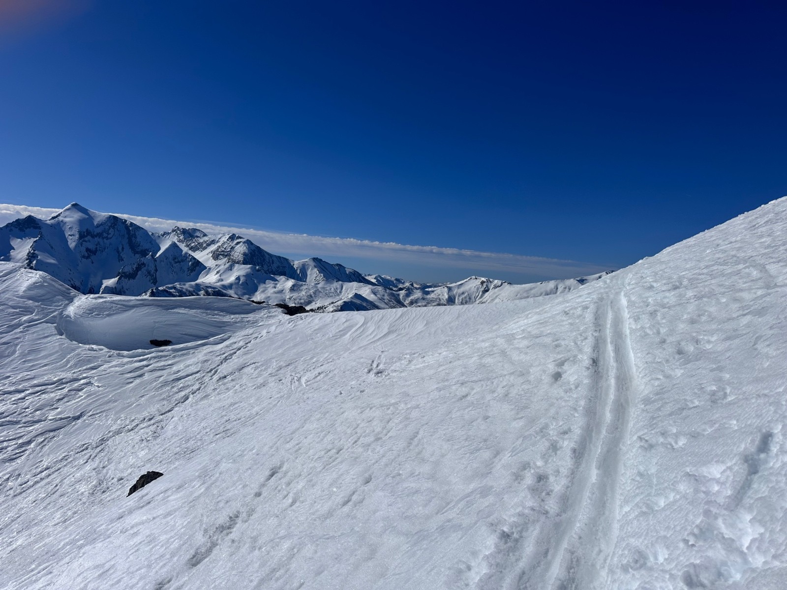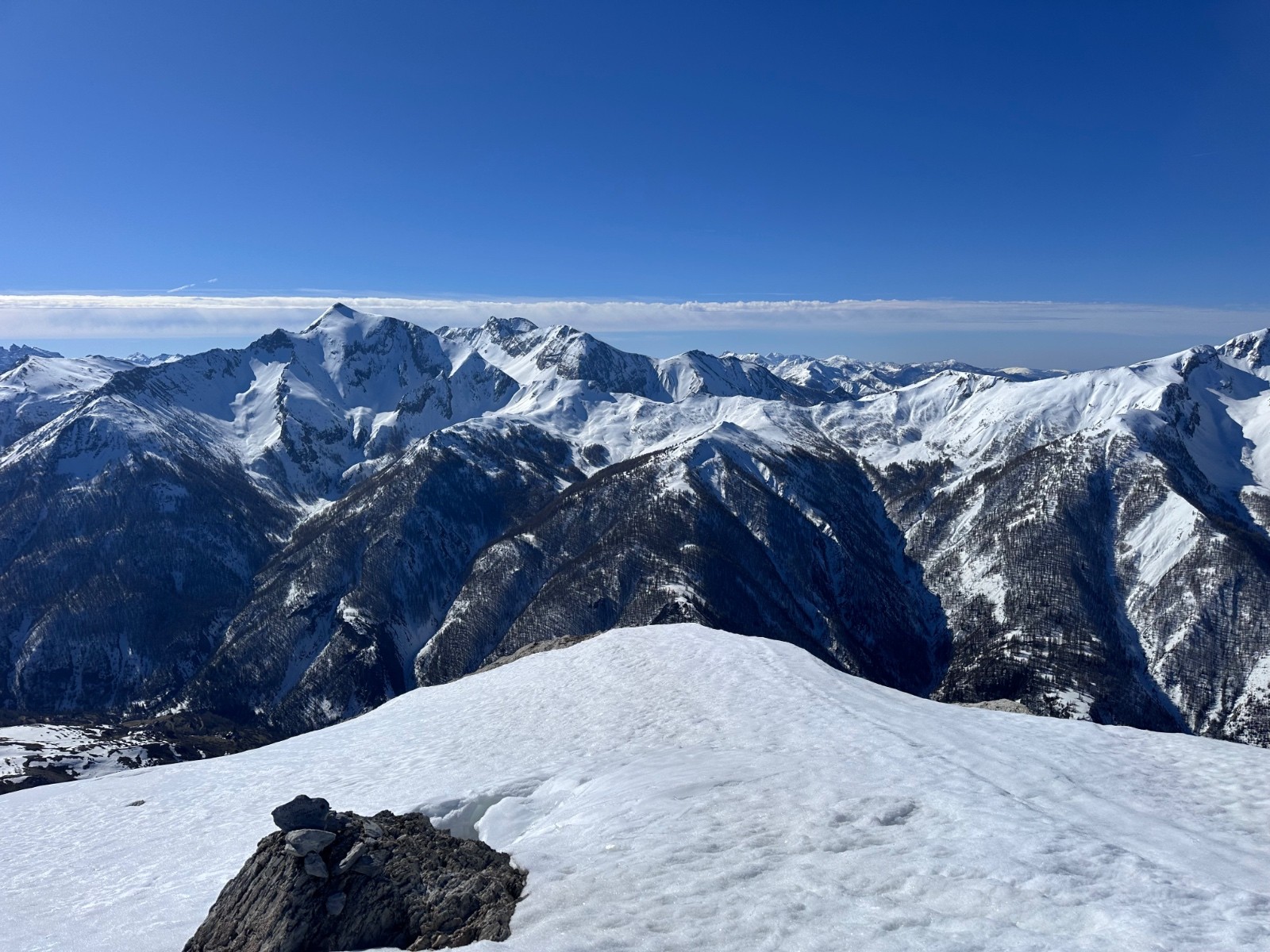 Conditions nivo et activité avalancheuse : bonnes conditions. Attention au fort réchauffement, départs ponctuels d'avalanche de fonte en faces Ouest et Nord-Ouest, résidus avec amas de blocs dans la traversée sous le Brec Second pour rejoindre le haut des pistes du Super Sauze