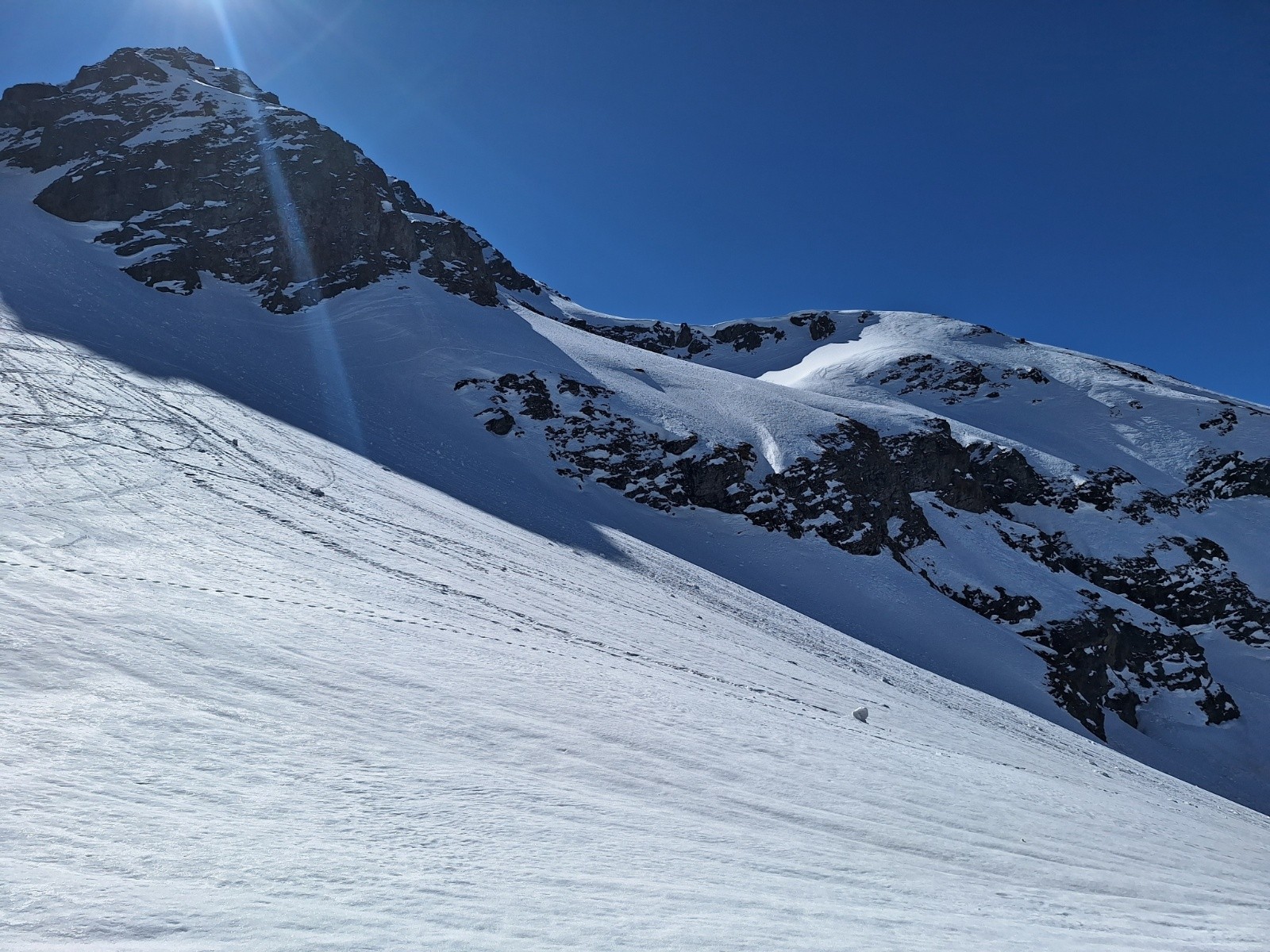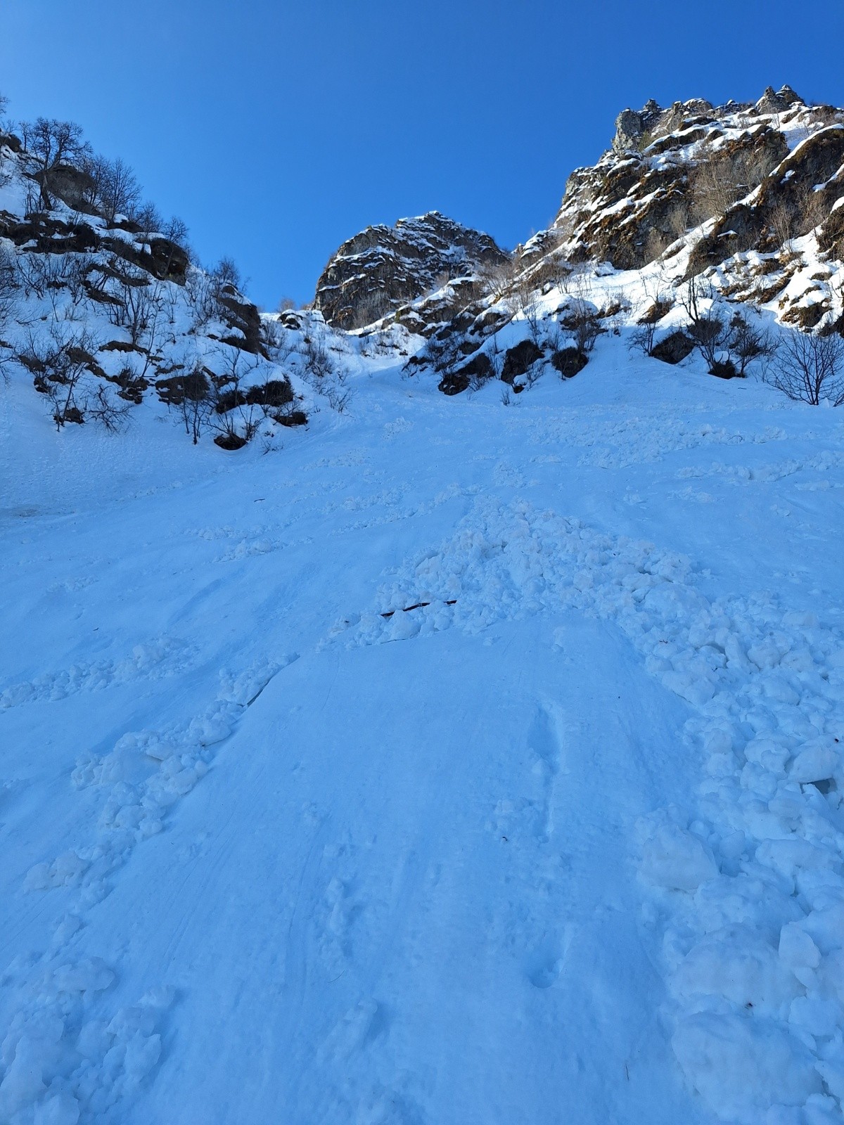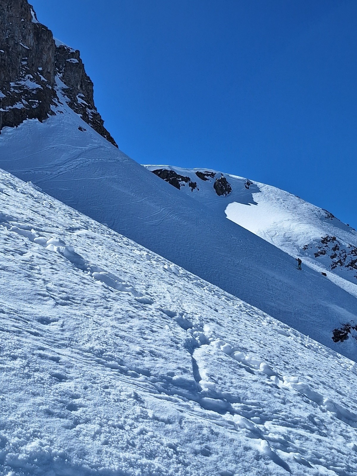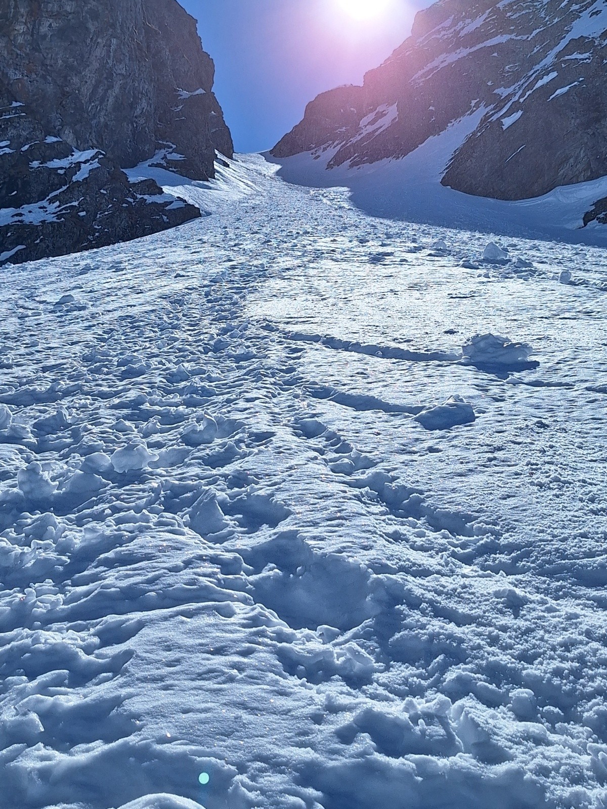 Ça purge fort au soleil, le Bera largement sous évalué. La neige encore accrochée au Rocher tombe, dans la pente elle emporte le surplus ce qui peut, et a devant nous, mobilisé de grosses quantités.