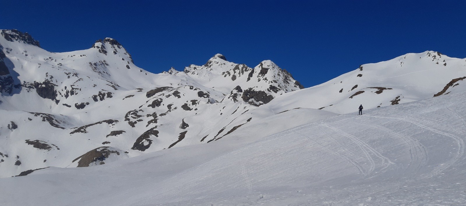 Conditions pour le ski : frisette ou poudre tassée vendredi en nord, neige en cours de transformation de samedi à lundi: descente du Thabor sur Re Maggi vers 14h samedi: moquette épaisse bien skiante. Dimanche, moquette fine sous col des Muandes SO vers 11h, moquette plus épaisse sur la descente du col de la Tempête sur Laval plein sud à 14h. Lundi, à la montée, de la poudre (frisette ou tassée) observée dans la combe entre le lac et le col des Béraudes en nord. Descente vers midi, transfo lourde en sud entre col des Béraudes et col de la Ponsonnière. Au nord de ce col par contre, vers 14h, poudre tassée un peu carton en haut, bonne jusqu'à 2400m, puis moquette fine jusqu'à 2200m. Plus lourd en dessous, mais pas trop pénible jusqu'à retrouver la piste militaire fraîchement dâmée pas la chenillette des militaires qui descendaient des Rochilles ! Ça descend ensuite bien sur la route du Lautaret.