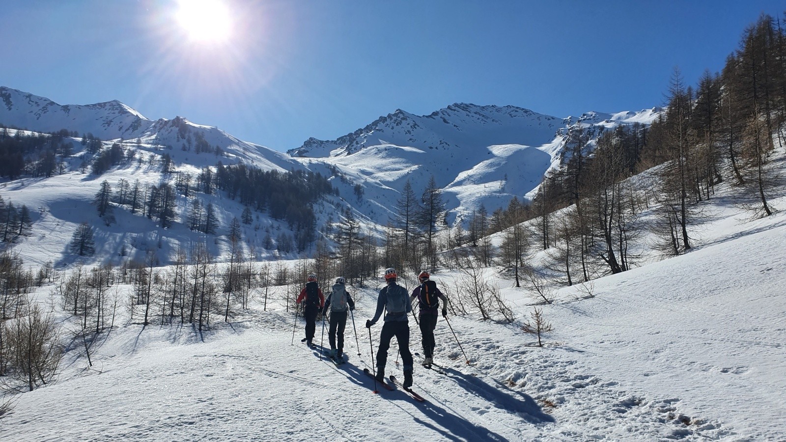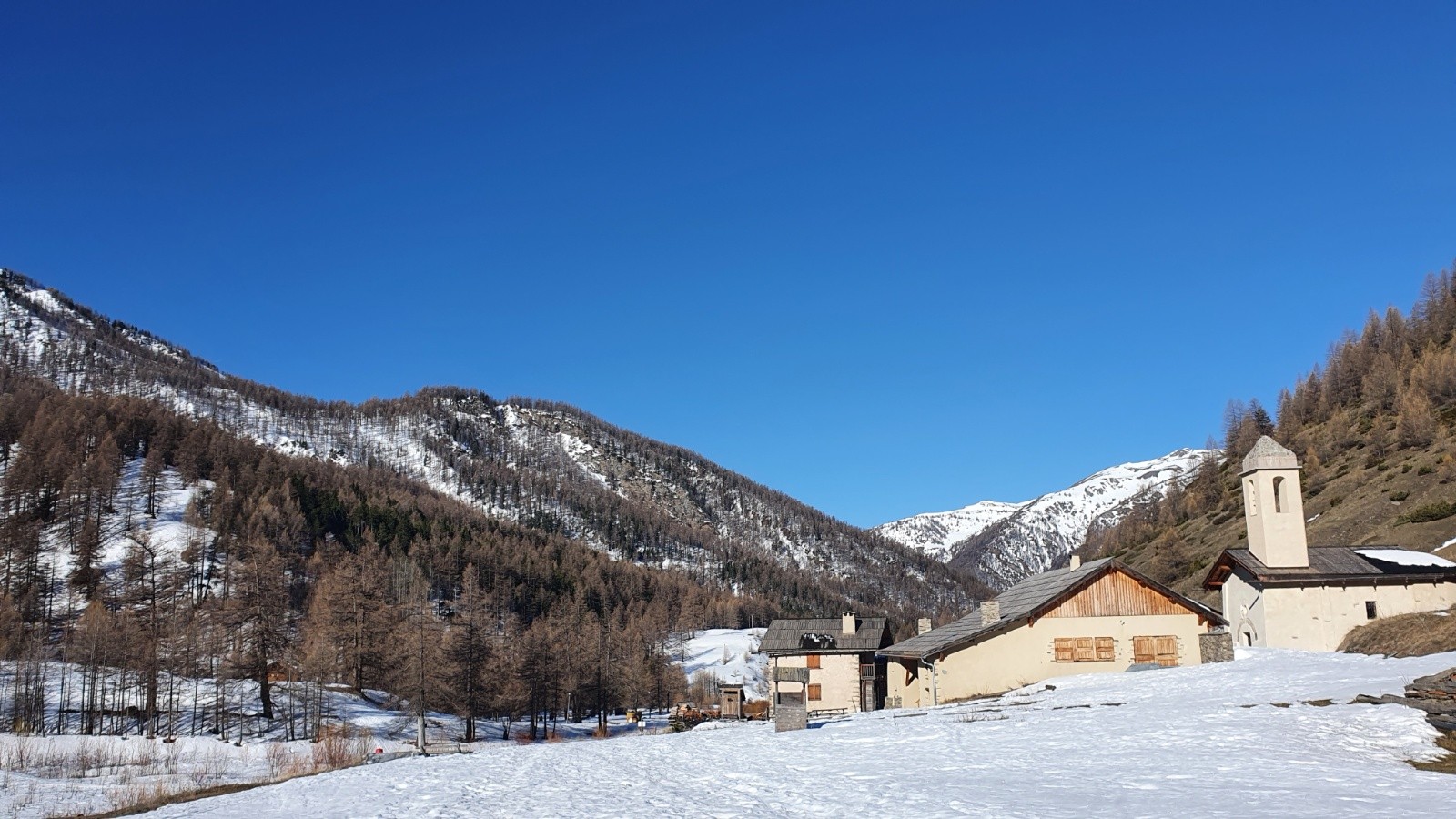 Découverte et vraiment le hameau est magnifique avec de quoi faire pendant plusieurs jours dans le mélèzin ou des petits couloirs dans le cirque au fond ! Et la vue sur le Bric Bouchet est vraiment belle, pareil pour la vue sur le Viso et la plein du Po en haut !