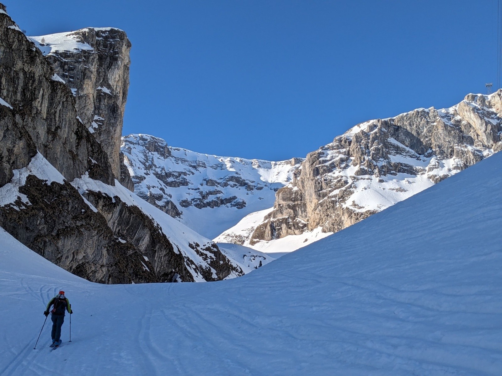 Depuis le temps qu'on voulait connaître ces Chourums et les gravir. Voilà, c'est fait, certes c'est pas l'Olympique mais le plaisir était là sans être héroïque car la montée c'est faite sans stress. Les marches étaient bien marquées, pas de cailloux, pas de glace que du bonheur. Bon pour le reste c'était pas terrible, chaleur, soupe bien.....soupe, traversée bien dure nous obligeant à mettre les couteaux. Mais l'arrivée sur le plateau est magique avec ses télescopes tournés vers l'univers. Pour la descente nous avions choisi de passer par l'autre vallon à droite en descendant. C'était par la meilleure idée : neige soupe collante et pas mal de traversées. Il aurait mieux valu descendre par le vallon de Corne où il y avait beaucoup plus de traces, ça colle moins. Prochain objectif, l'Olympique....