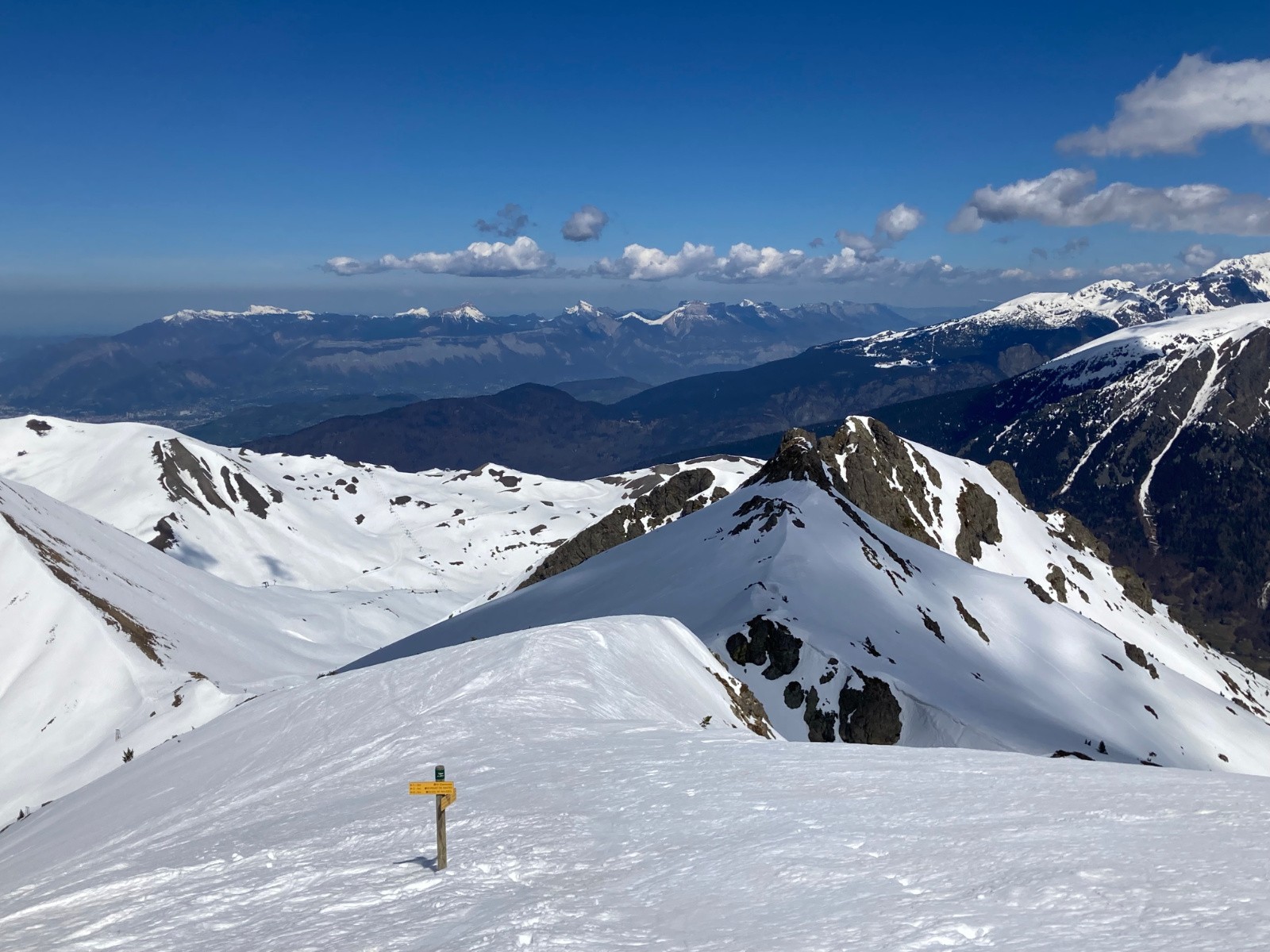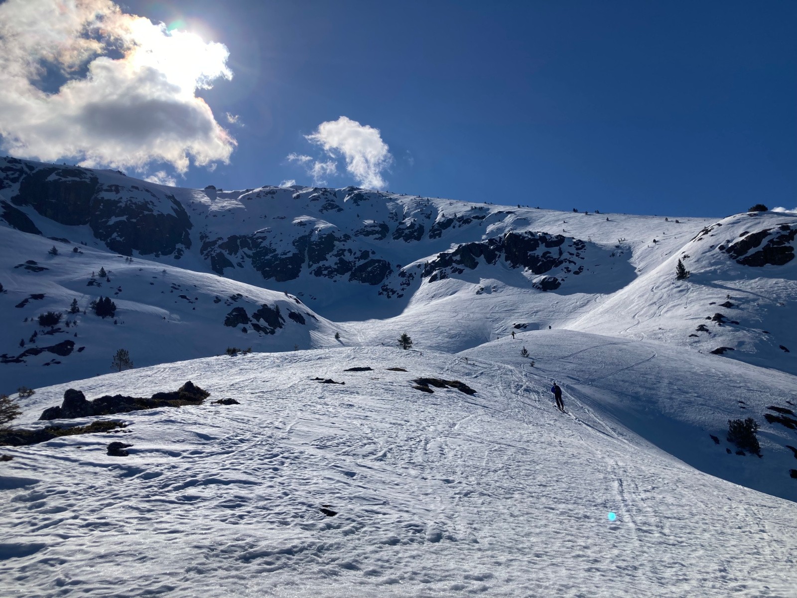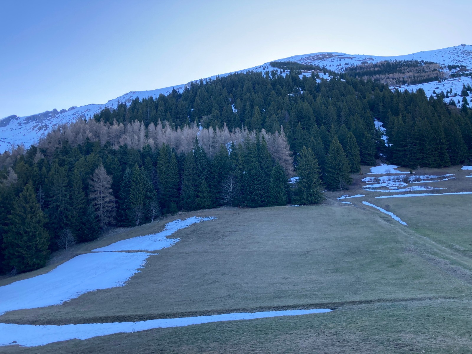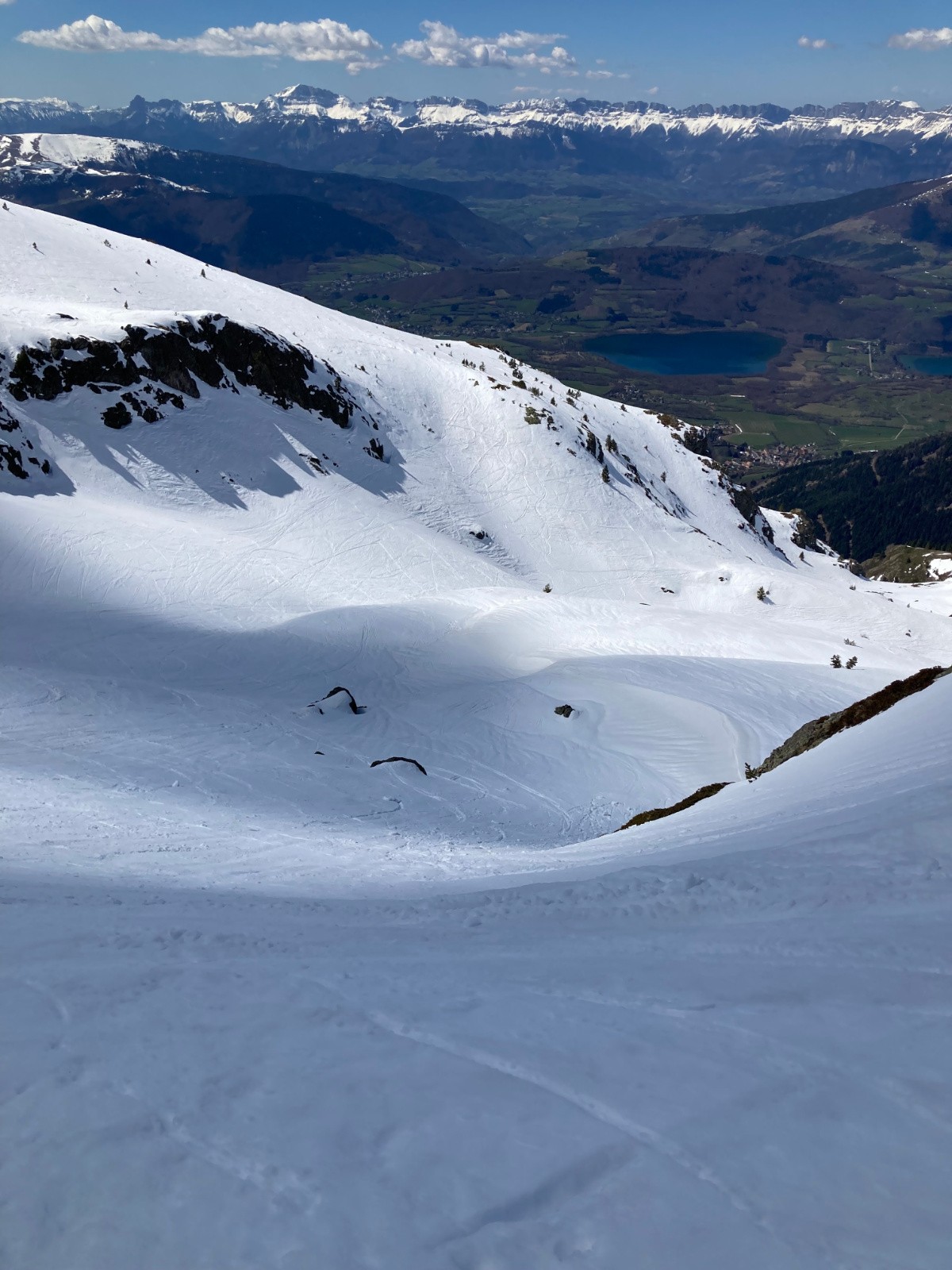 Conditions pour le ski : Correcte. Peu de regel sous 1800m. Neige décaillée sur fond portant dans la partie supérieure de la descente à 13h30, puis de plus en plus lourde et molle, mais pas collante.
