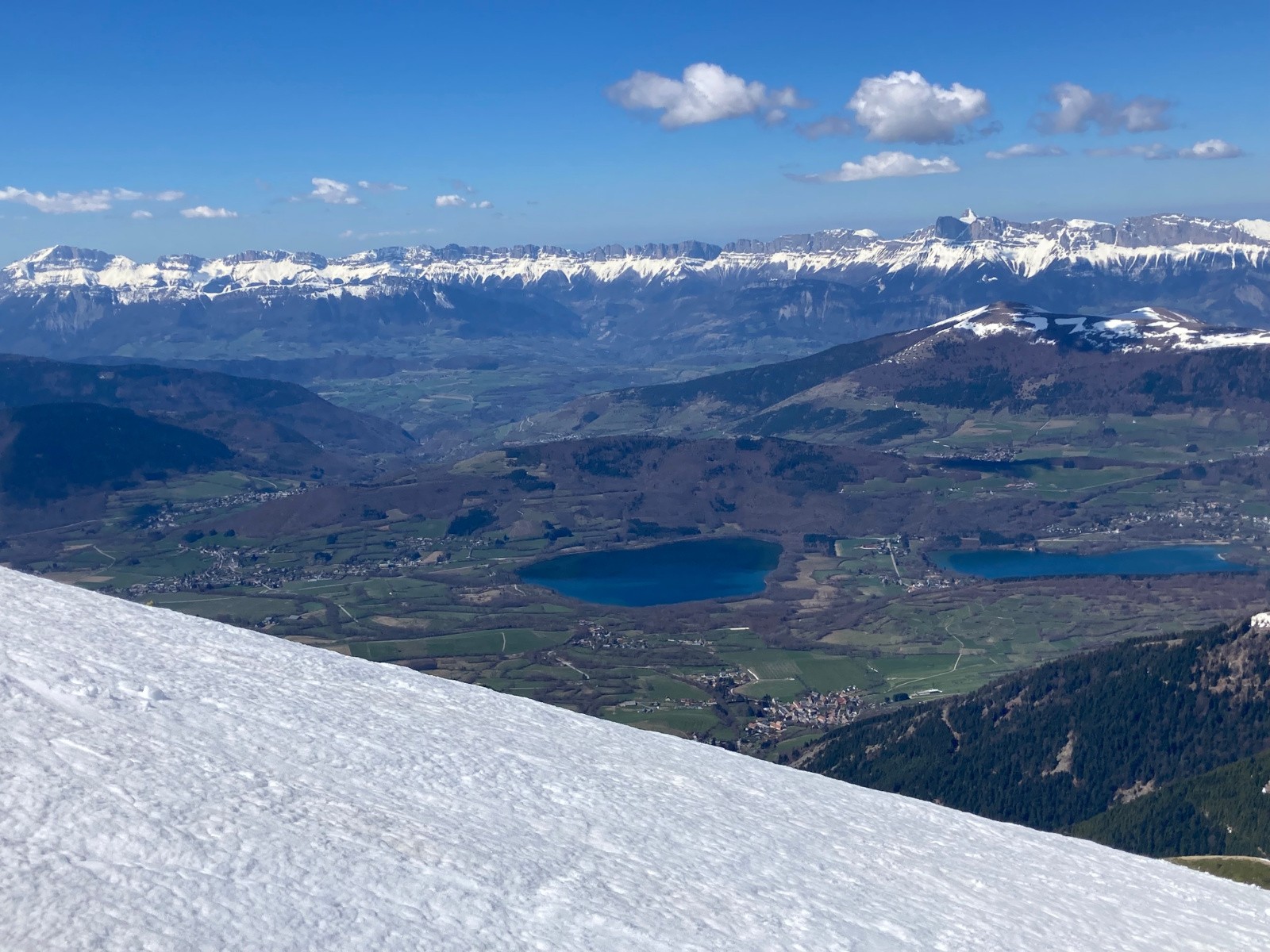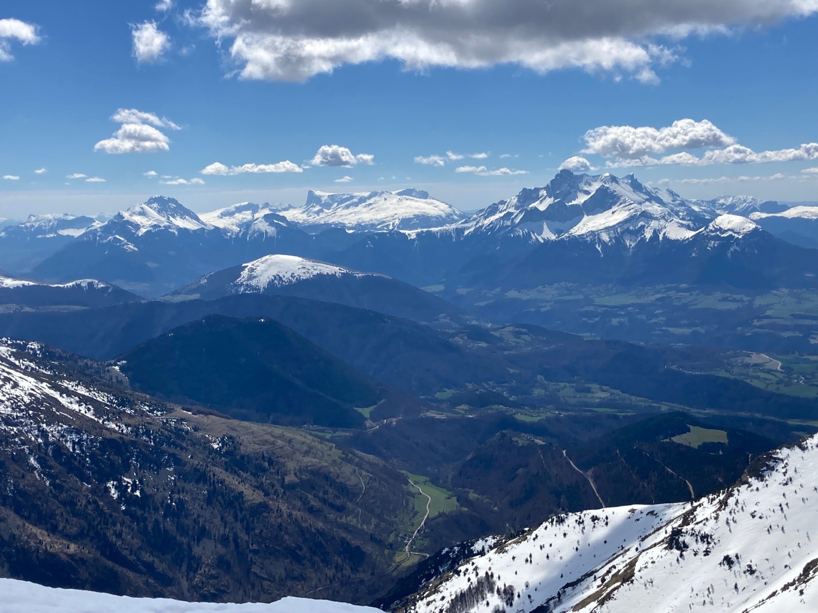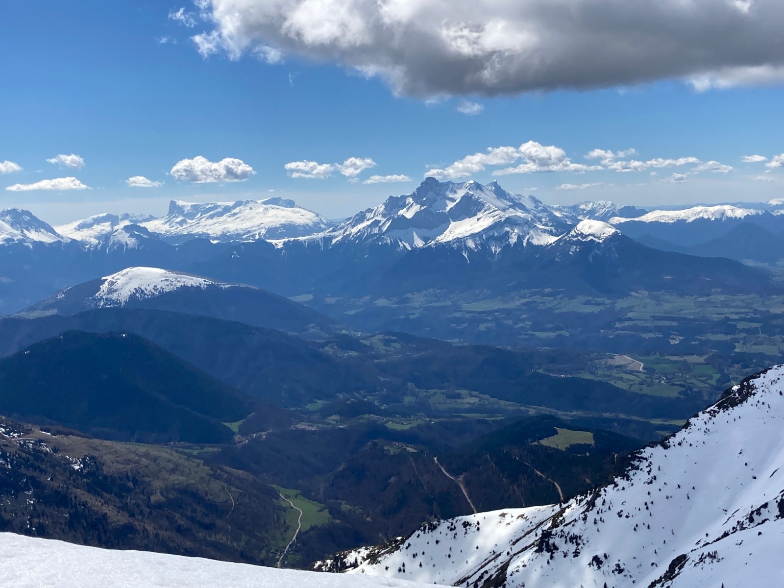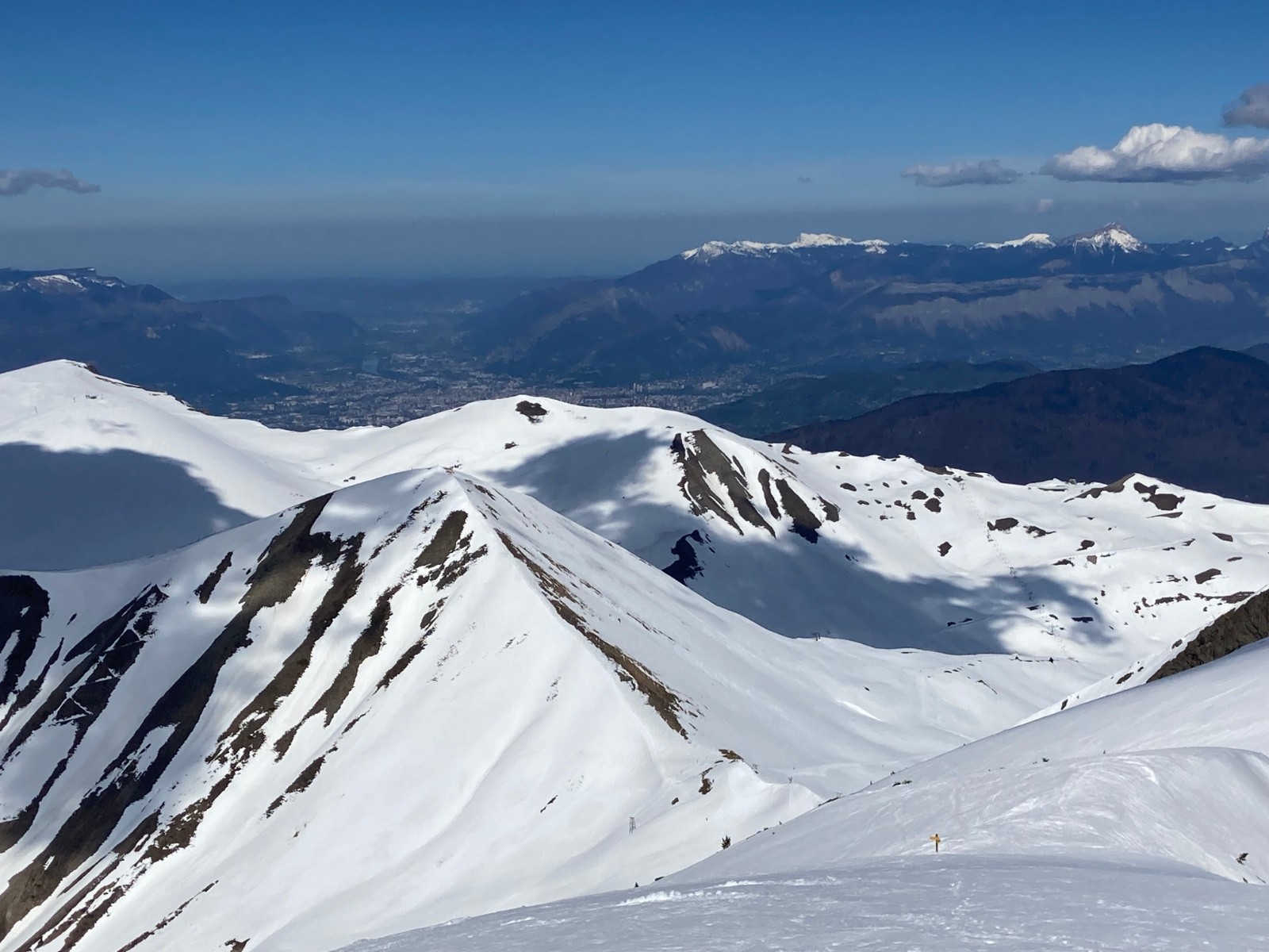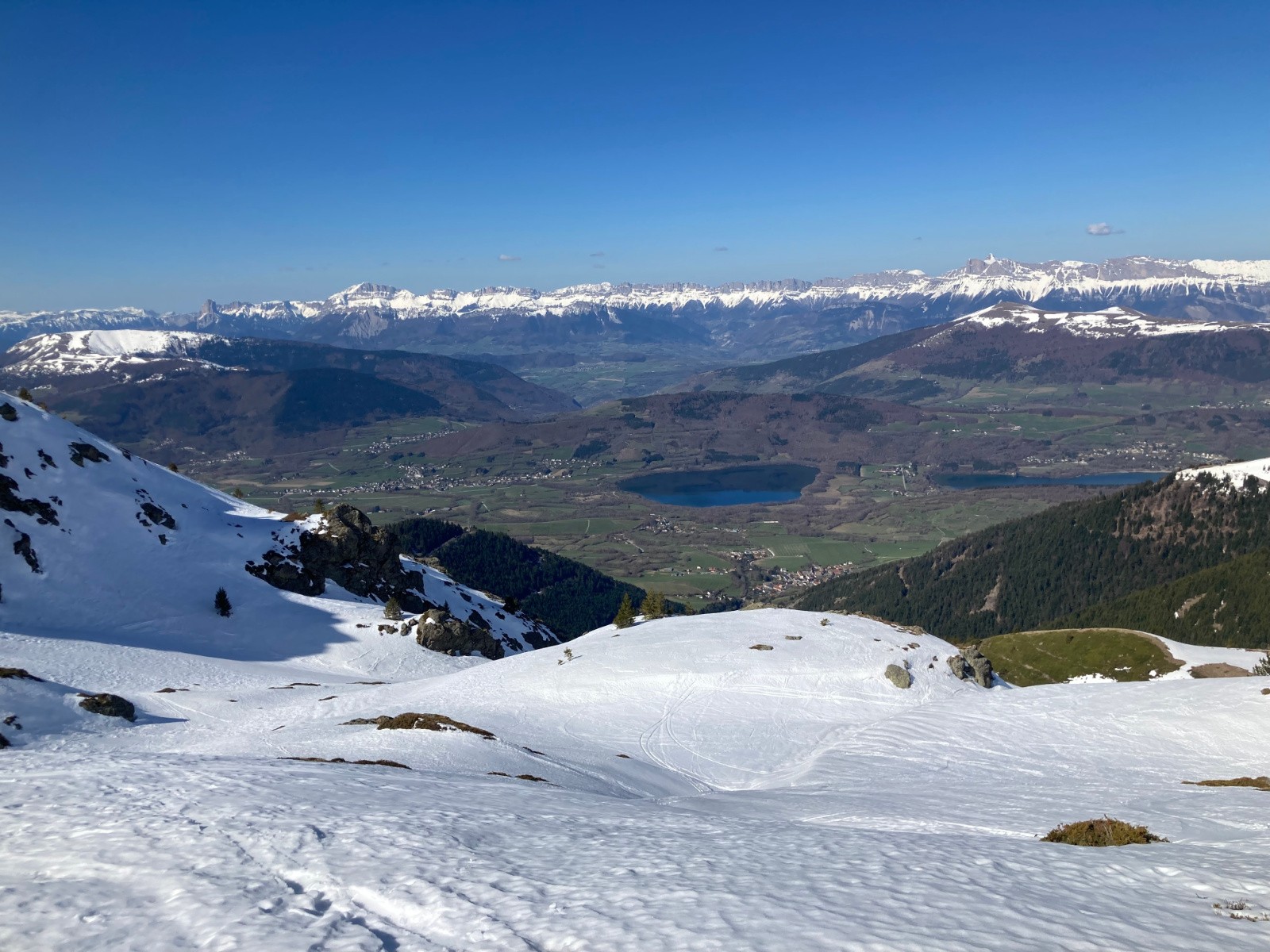 Conditions pour le ski : Correcte. Peu de regel sous 1800m. Neige décaillée sur fond portant dans la partie supérieure de la descente à 13h30, puis de plus en plus lourde et molle, mais pas collante.