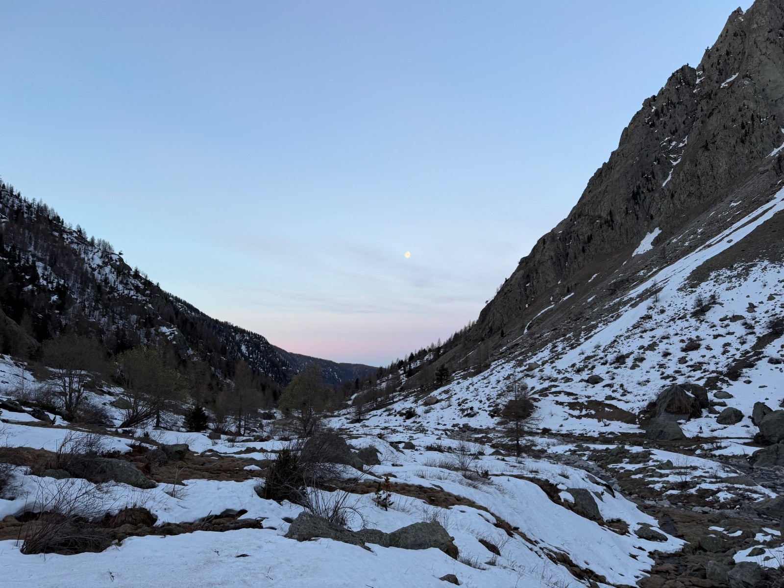 À 6h20 le petit vent nous vivifie mais en voyant passer un autre groupe on se dit qu’on est pas les seuls fous. On tente la montée en rive gauche mais l’enneigement est parcellaire, on se retrouve à jardiner puis déchausser. La montée au niveau du mur des italiens est délicate car mon collègue en split n’a pas un matériel adapté. Je finis par lui tracer des marches dans de la neige mi-béton mi-croutée avec mes chaussures de ski (merci d’ailleurs à nos devanceurs pour les marches de la fin). Puis arrivé au dévidoir mon collègue abandonne, je continue jusqu’au refuge. Il fait chaud mais le vent fait de son mieux pour climatiser la zone. J’ai plus beaucoup de batterie dans les jambes, ça sera un stop sur un promontoire dominant le lac Niré. Piquenique agréable au soleil à contempler les sommets qui me seront accessibles un jour quand j’aurai le temps de développer une condition physique.