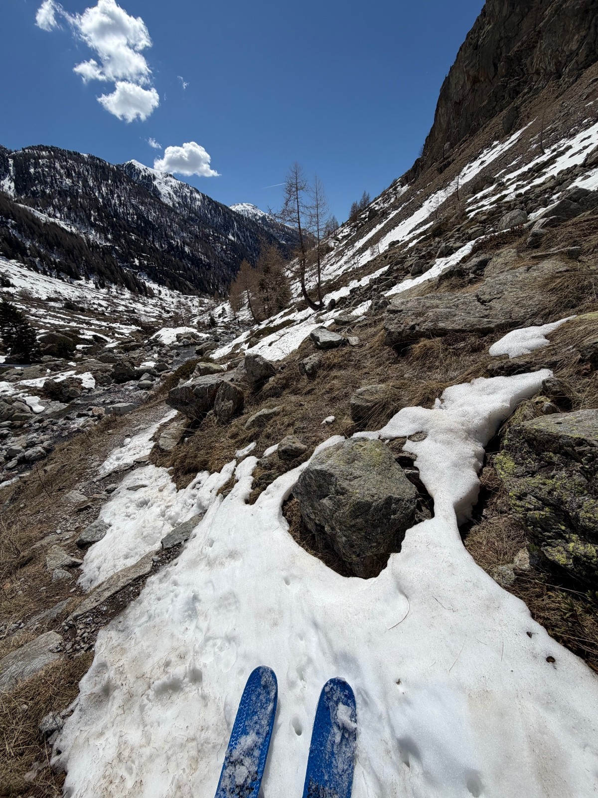 Redescente à midi, les versant Nord Ouest sont pas encore mûrs avec le petit vent. Mais la suite est bien en soupe. Le passage labouré par les piétons est pas très agréable, mais ensuite les etroitures au niveau du mur des italiens sont en soupe lisse rigolote. En bas, rive droite on peut alterner plaques de neige et pas en dry pour égayer les phrases de portage jusqu’à la voiture.