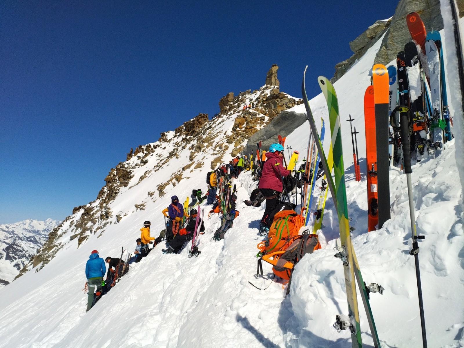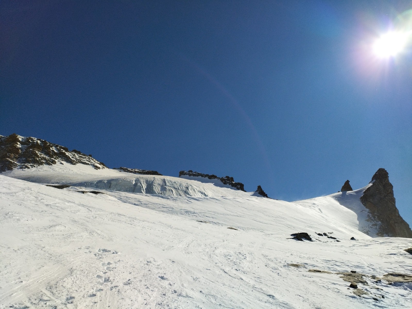 Le sommet montre enfin le bout de son nez tandis que les premiers skieurs redescendent sur une neige bien dure.