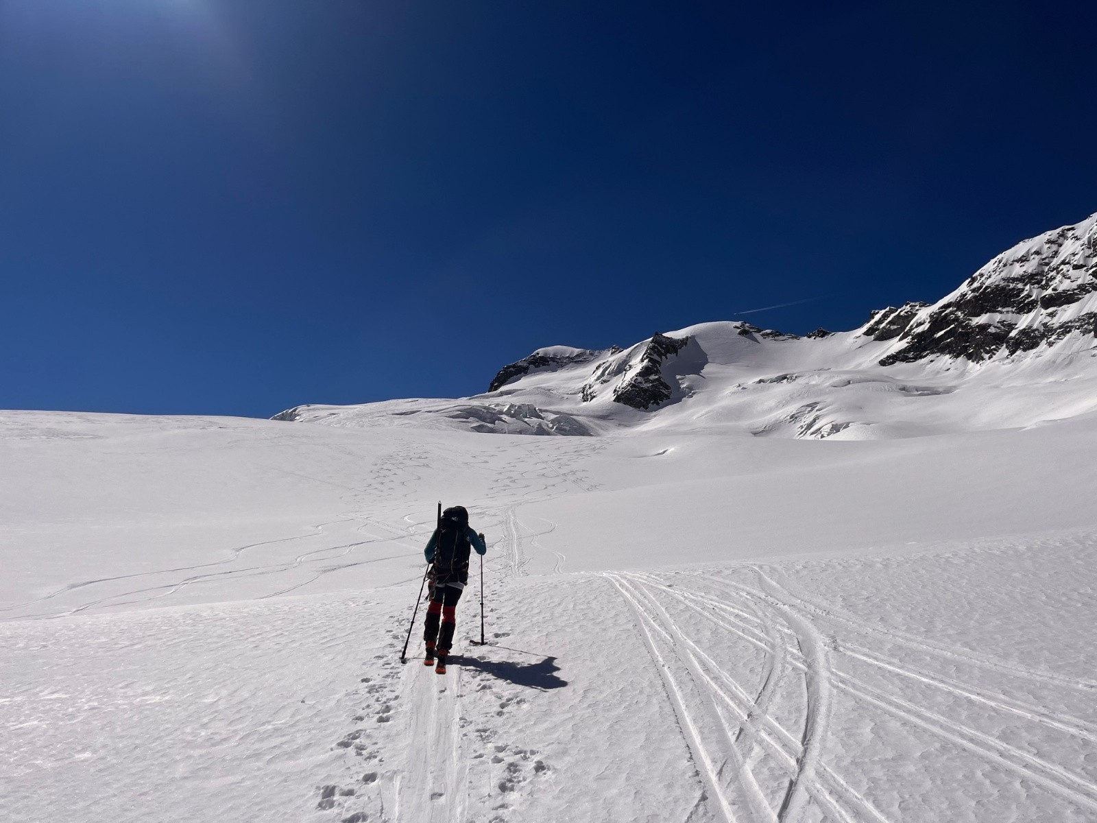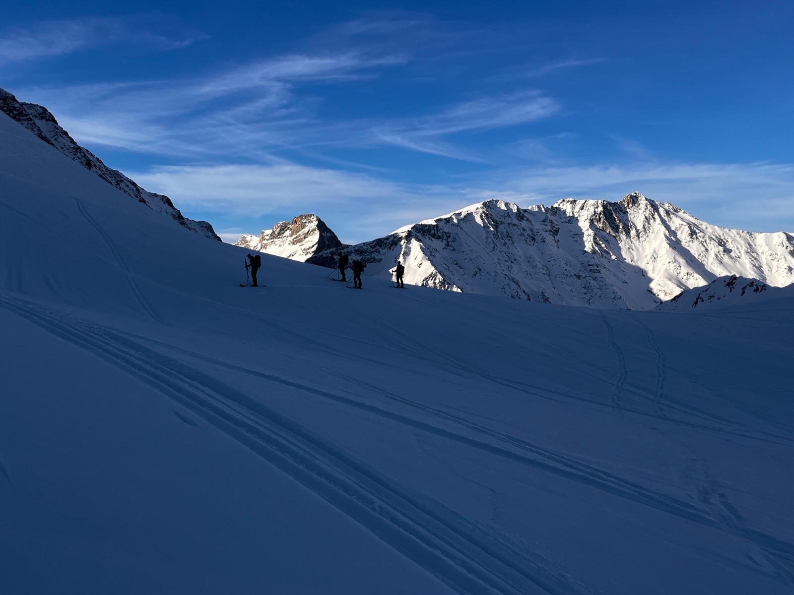 Montée classique au grand Col avec personne à l'horizon, pistes fermées donc bien sympa de cheminer dans ce cadre sans skieurs.