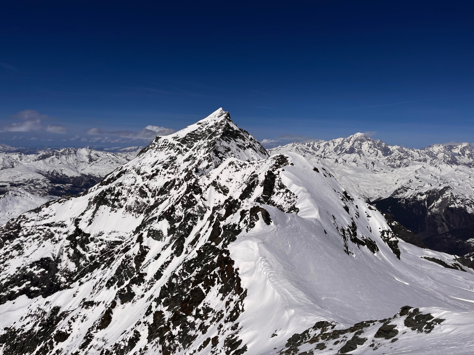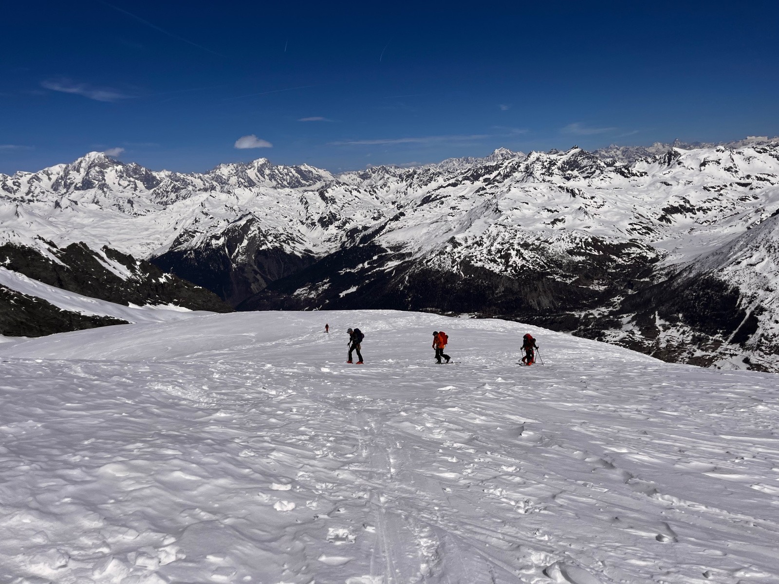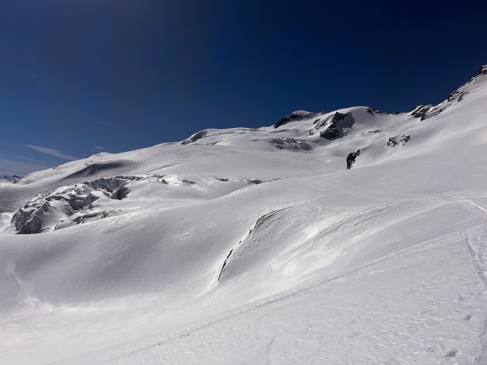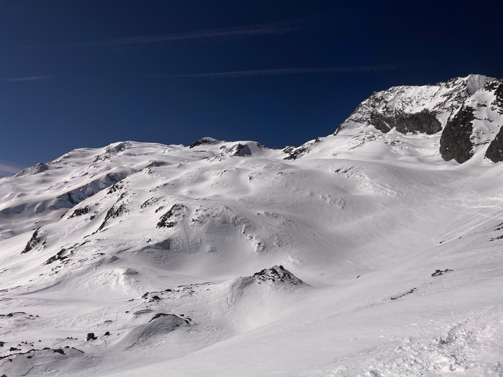 On vise le même itinéraire de descente à côté de rocher vieux/les lances pour aboutir à la fin sur le chemin de randonnée. Cela passe mais la fin est assez scabreux, cela passe encore en descendant en dérapage mais c'est étroit, d'ici 1/2 semaines, je pense que la neige risque de manquer mais cela doit passer à pied aussi. Puis sur le chemin, remontée au refuge avant le dernier jour.
