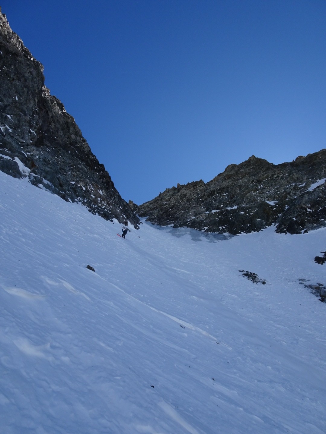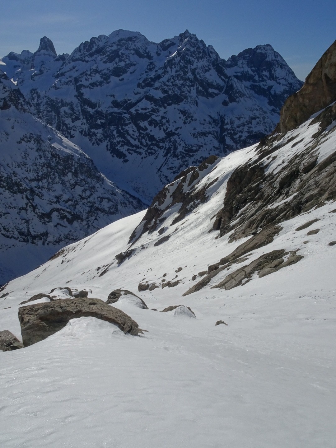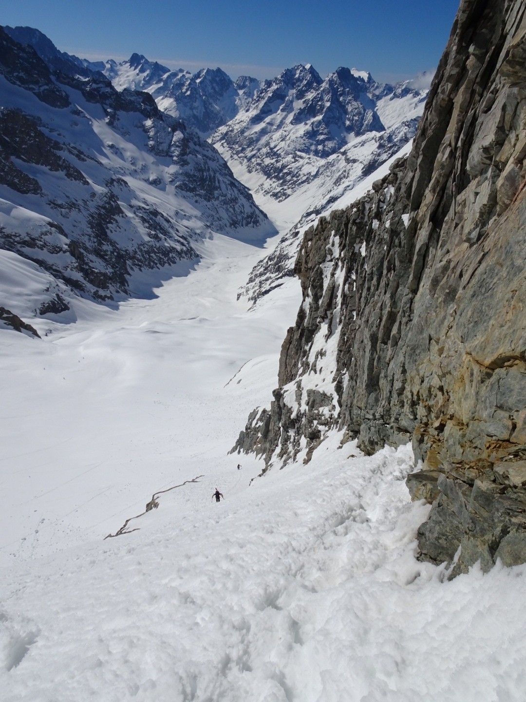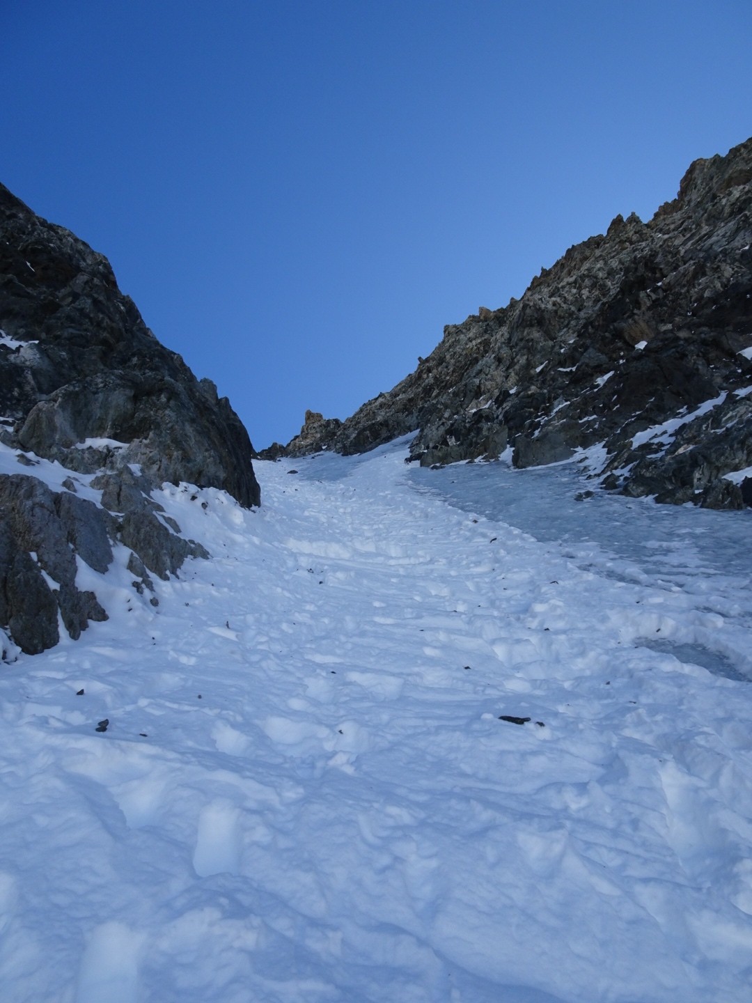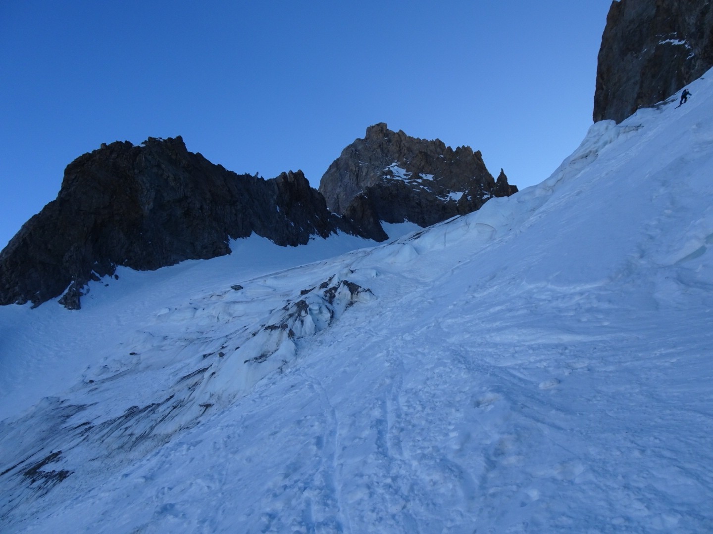 - couloir Nord Roche Faurio: désescalade 150m pas cool en neige dure (prendre deux piolets), puis neige froide compacte agréable toujours quelques reliefs