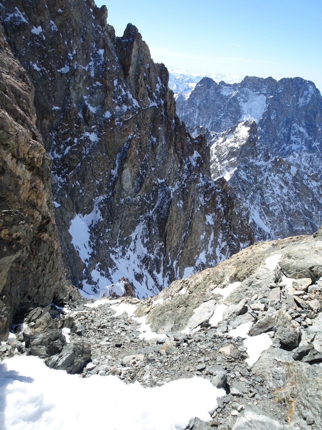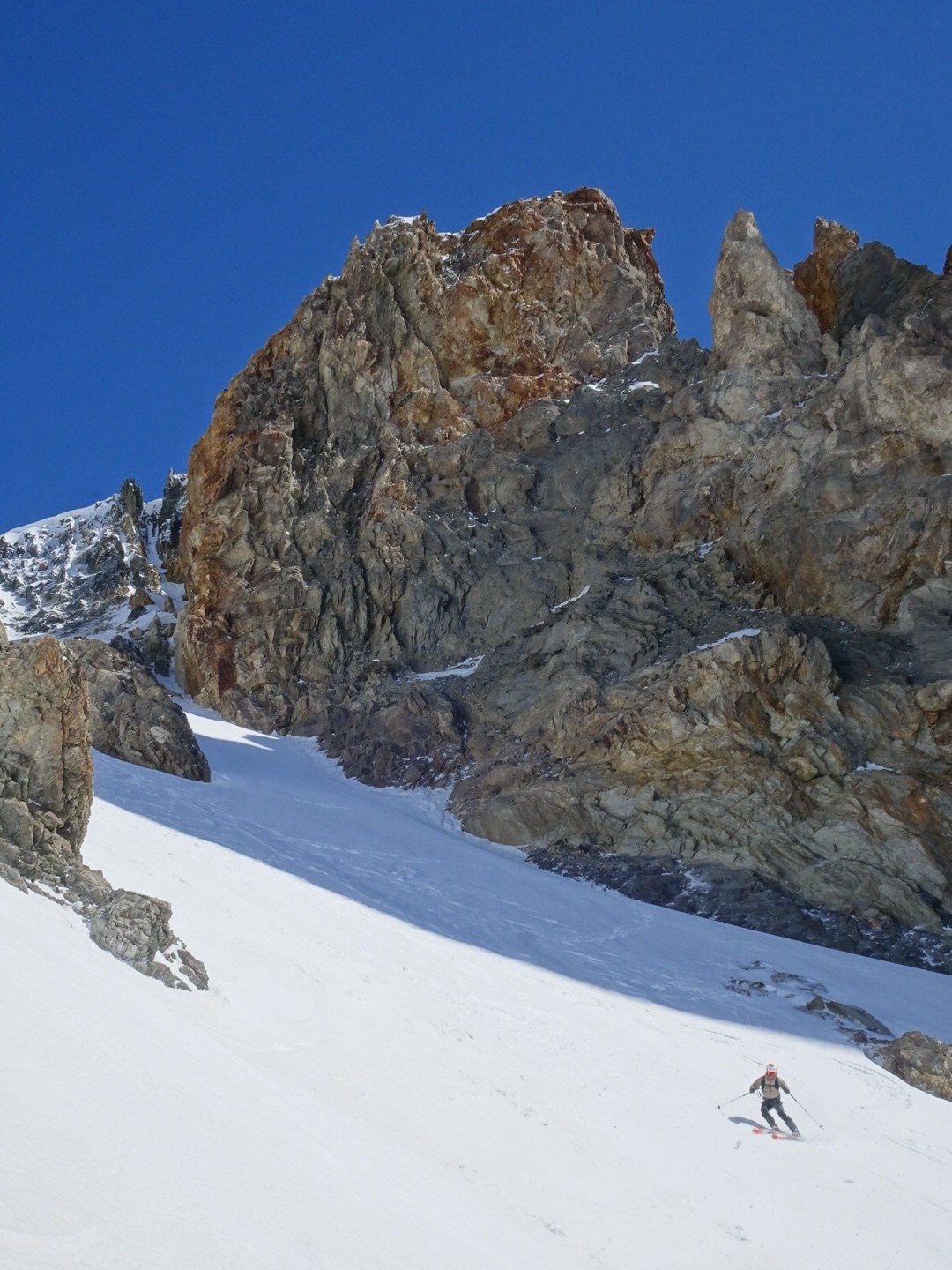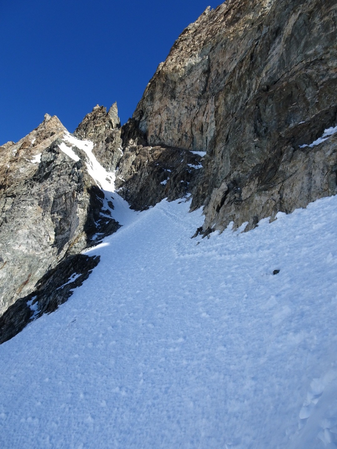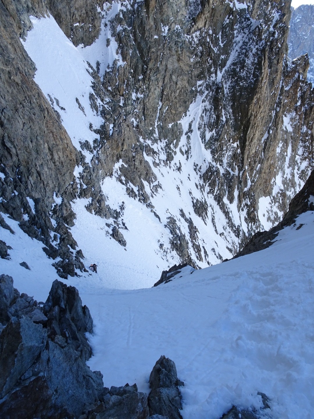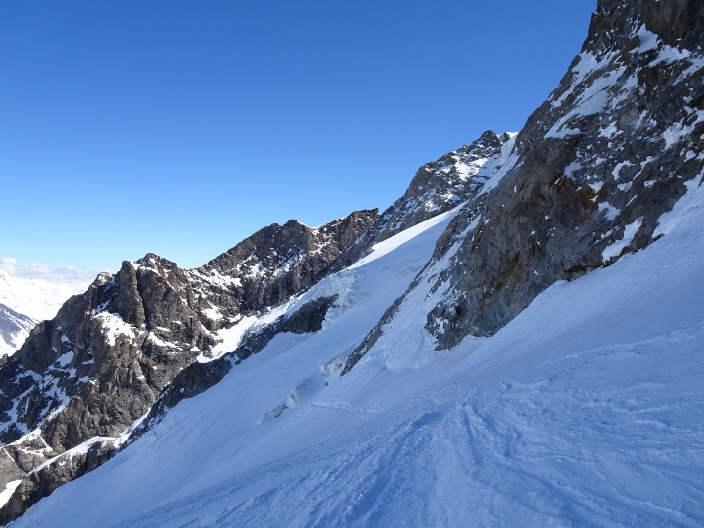 - couloir Nord Roche Faurio: désescalade 150m pas cool en neige dure (prendre deux piolets), puis neige froide compacte agréable toujours quelques reliefs