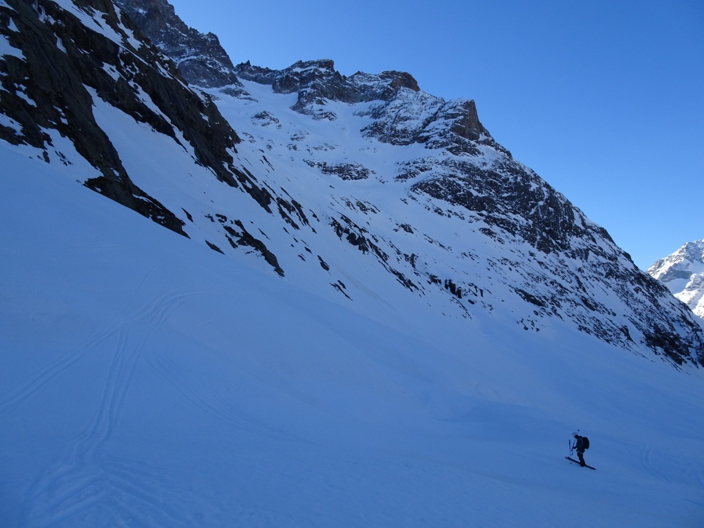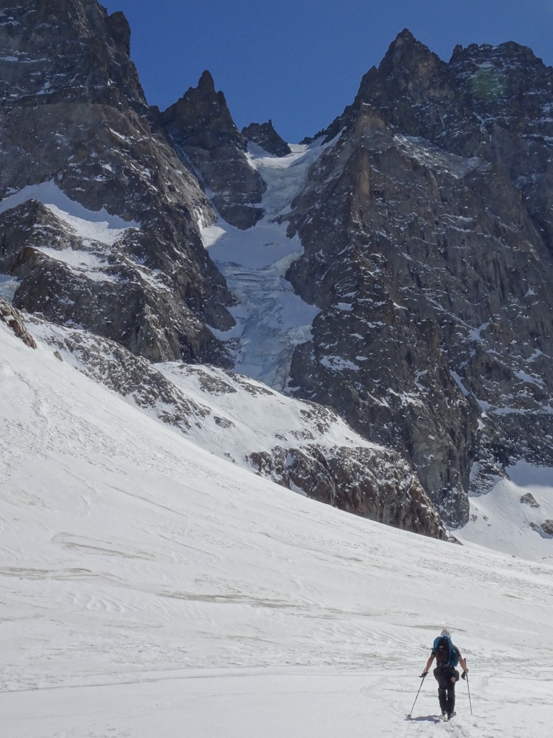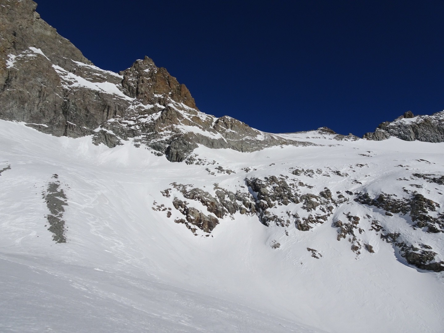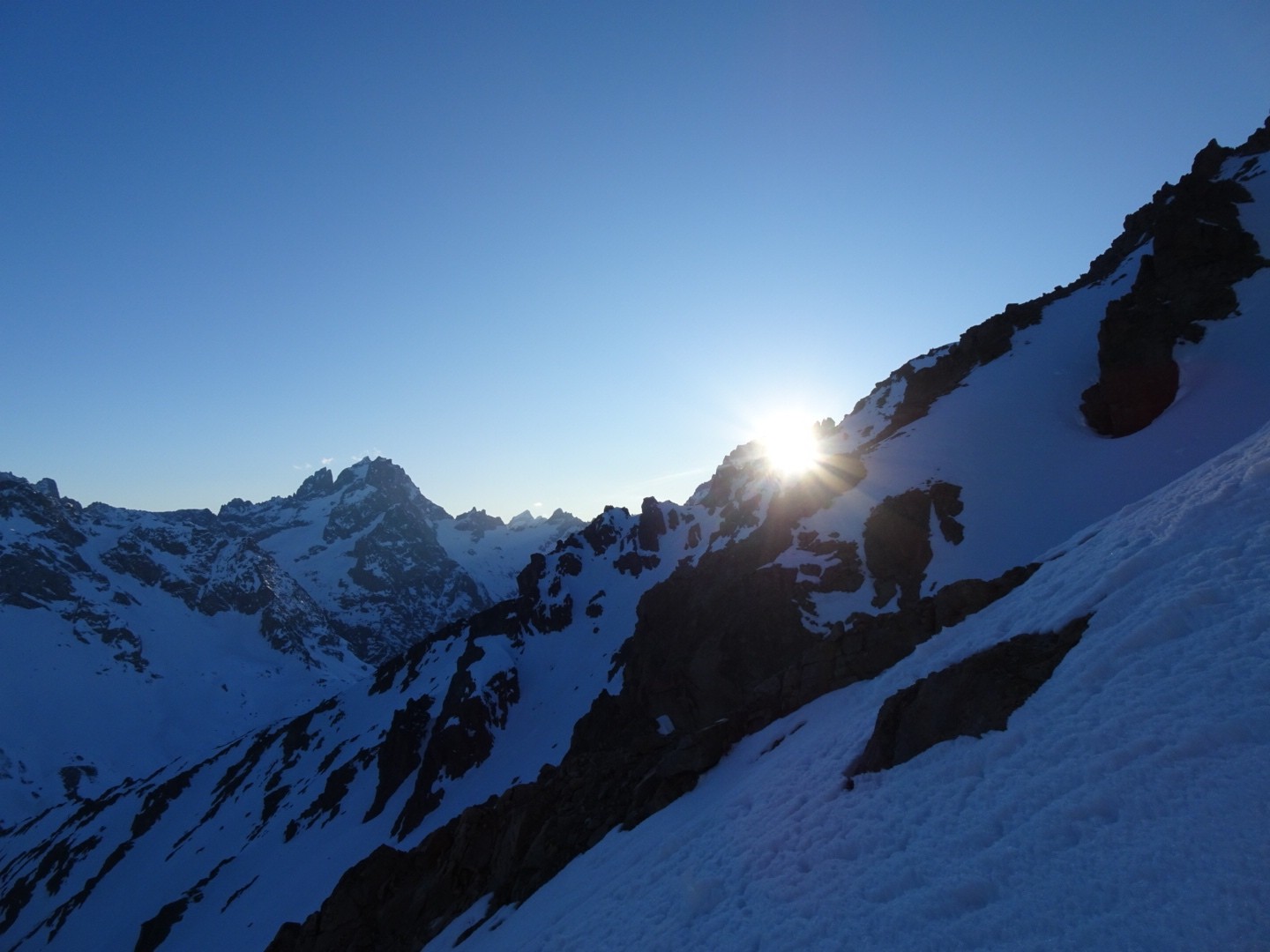 - couloir Nord Roche Faurio: désescalade 150m pas cool en neige dure (prendre deux piolets), puis neige froide compacte agréable toujours quelques reliefs