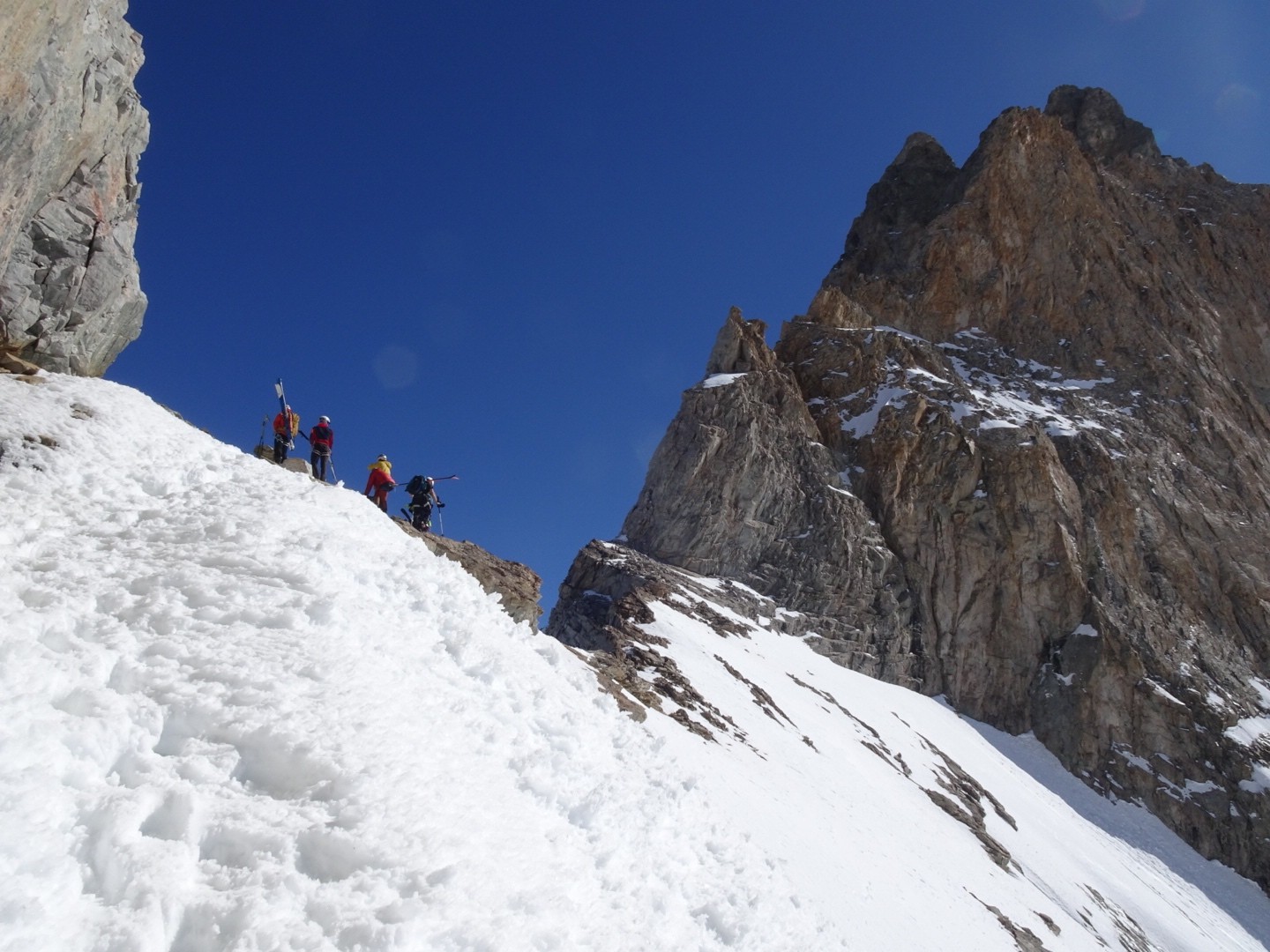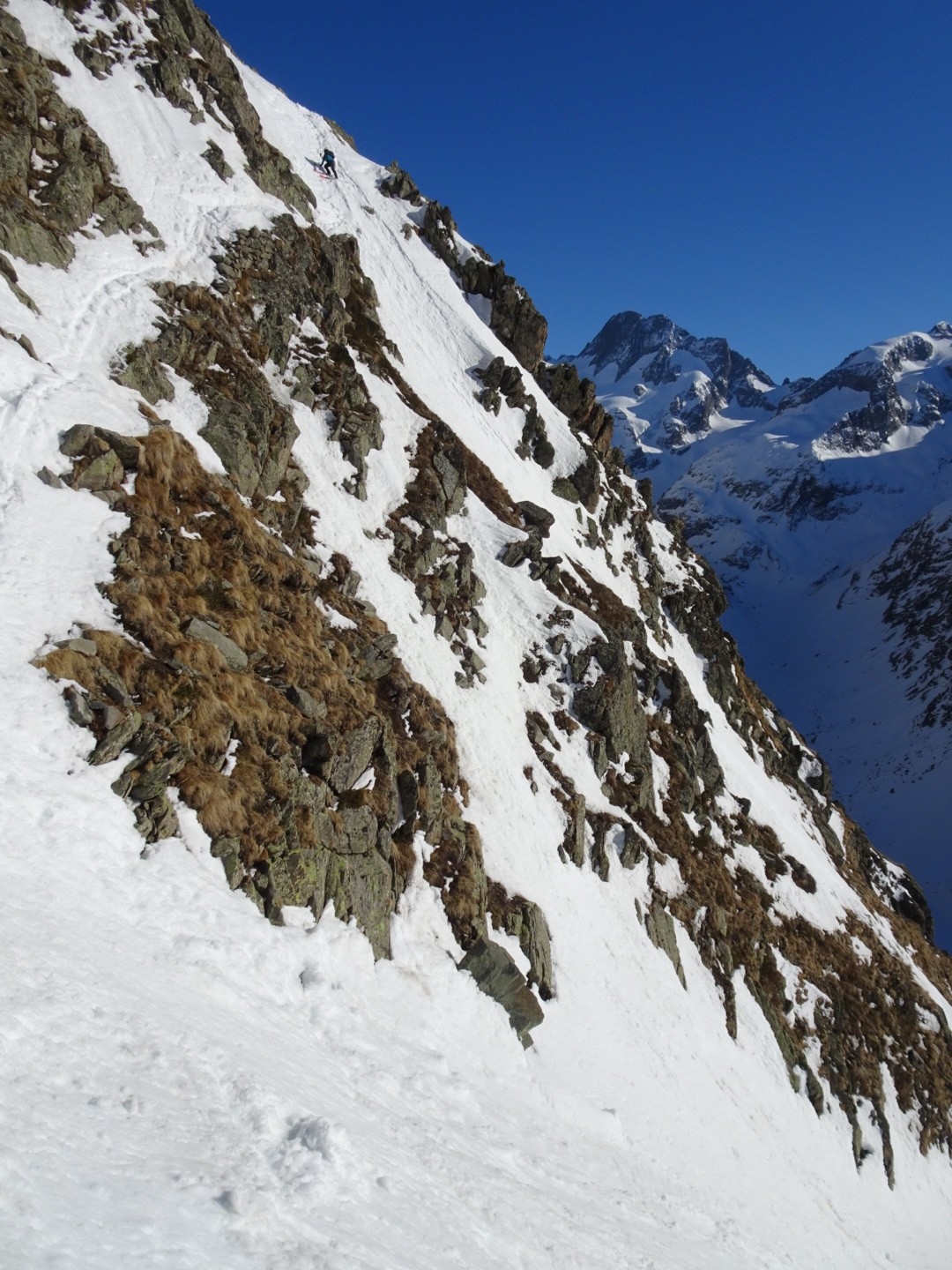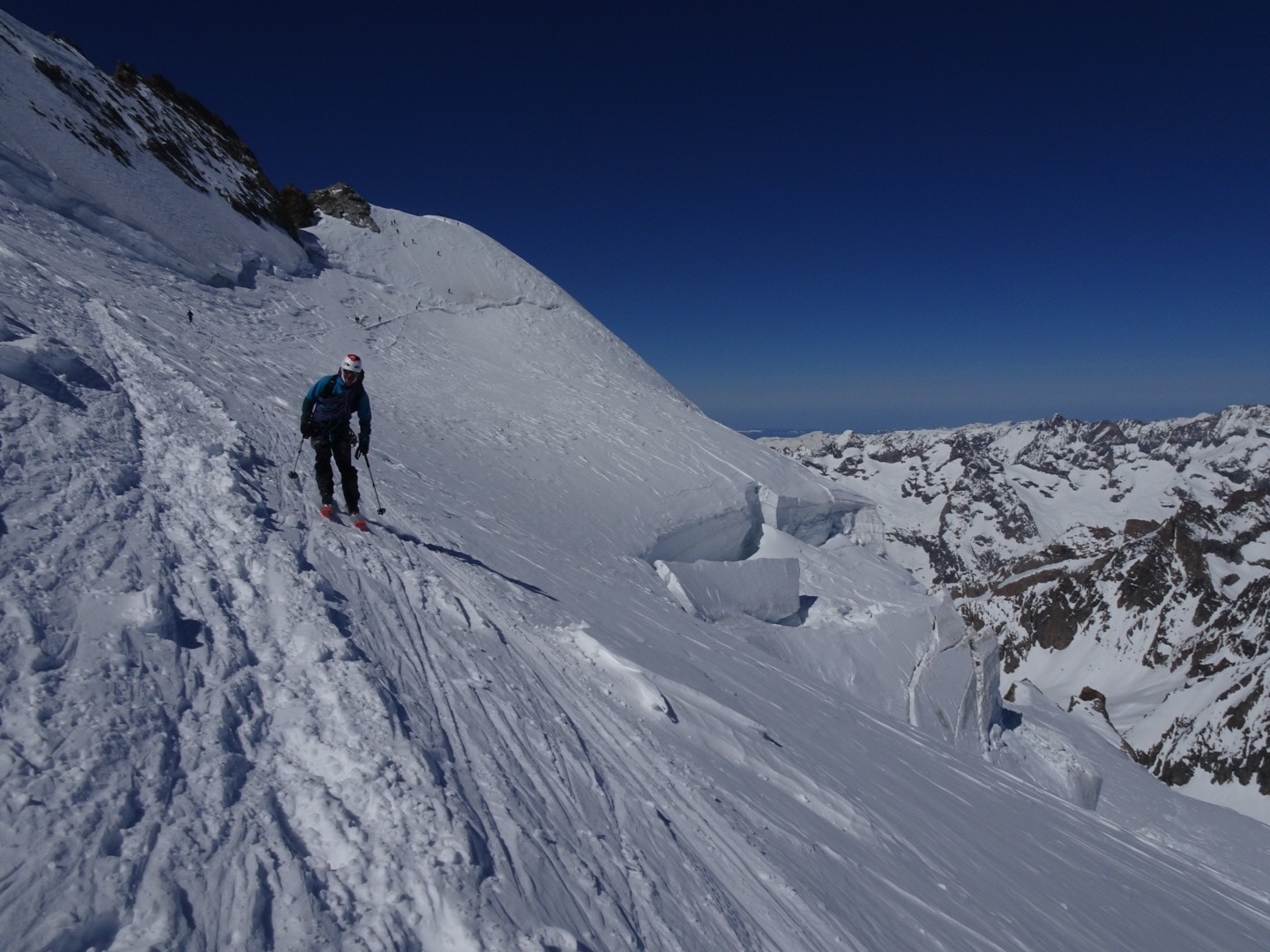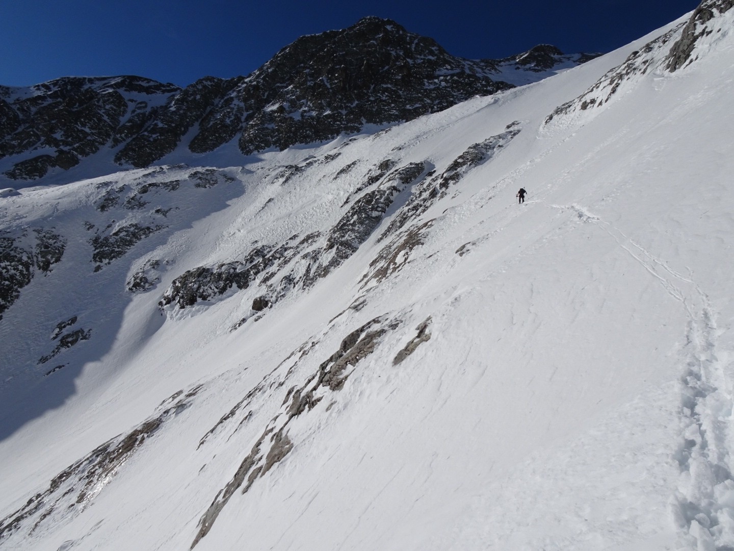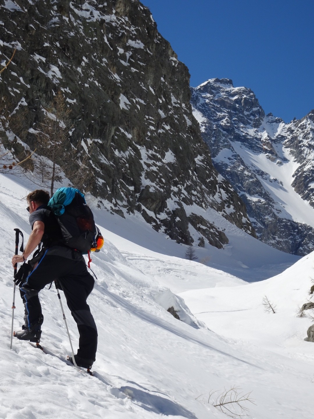 - couloir Nord Roche Faurio: désescalade 150m pas cool en neige dure (prendre deux piolets), puis neige froide compacte agréable toujours quelques reliefs