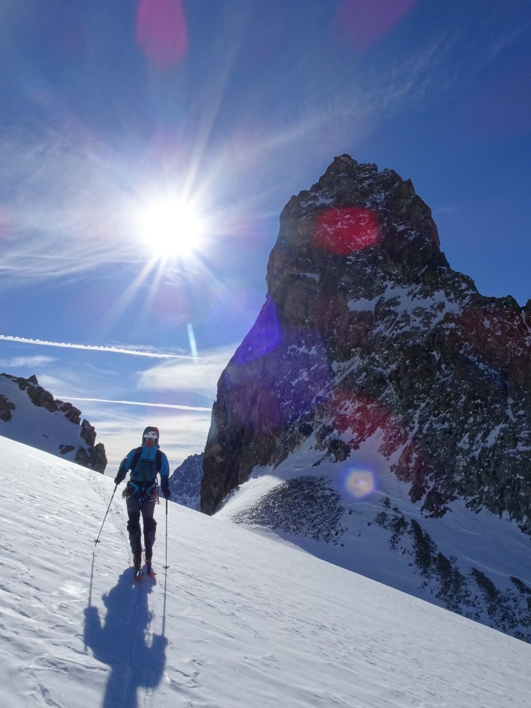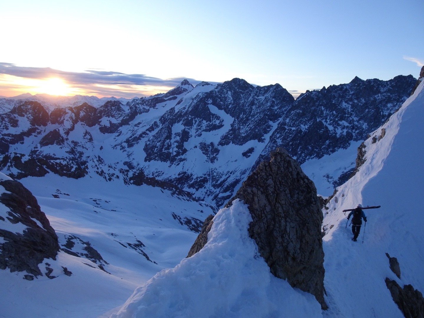 Un parcours grandiose autour des plus grands des Écrins, des passages déments notamment l’arrivée au sommet de la Combe du Riou et son couloir Sud de 1500m de D- , la sortie de la Brèche Lory et sa montée (en super condis), le couloir Nord de la Roche Faurio, ou encore le lever de soleil au col des Neiges, le Classique tour de la Meije et son Serret du Savon (pas très tranquille cette année, mais équipé avec dégaines, 10m en glace), le fameux glacier de l’Homme et ses grands séracs, et la course poursuite au Pic du Combenot pour chopper les dernier rayon de soleil…