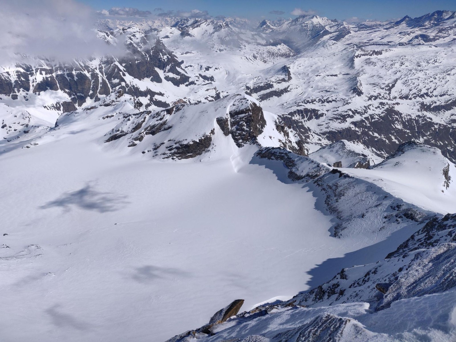 Conditions nivo et activité avalancheuse : glacier bouché ; quelques coulées de neige humide (datées de la veille ?) notamment dans le pas du Bouquetin et dans la descend du col du Montet