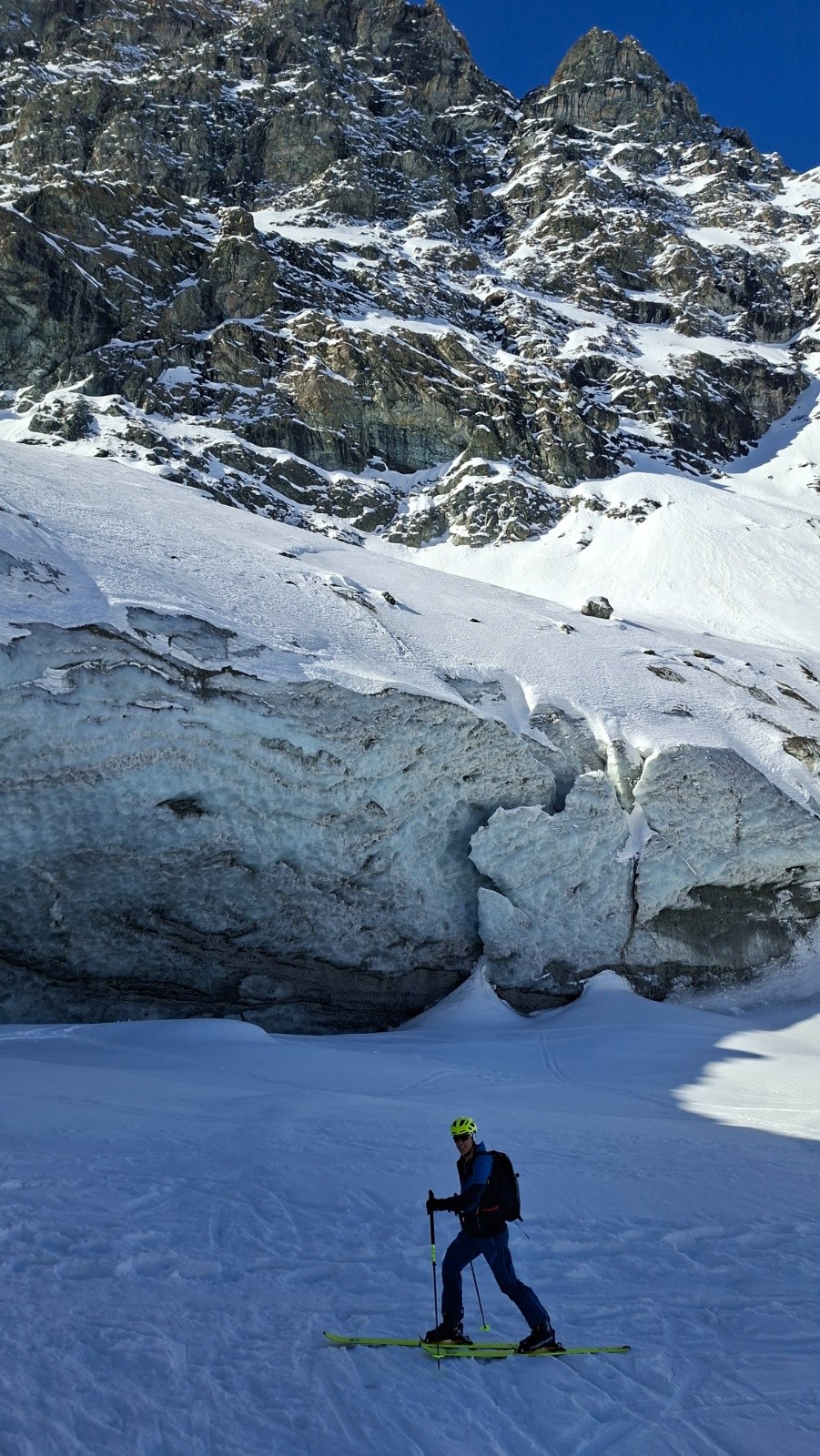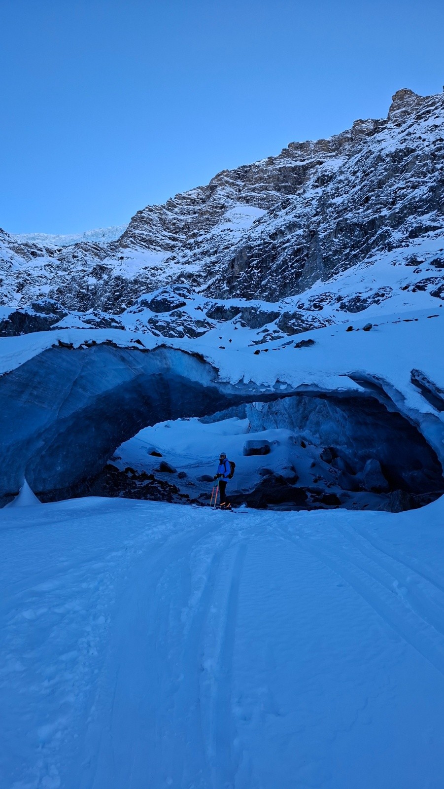Itinéraire suivi : RM de la station au départ, puis itinéraire du topo. Au pied du glacier du Vallonet inférieur, la grotte de glace n'était plus qu'une arche fin 2025 (photo). Aujourd'hui elle n'existe plus.