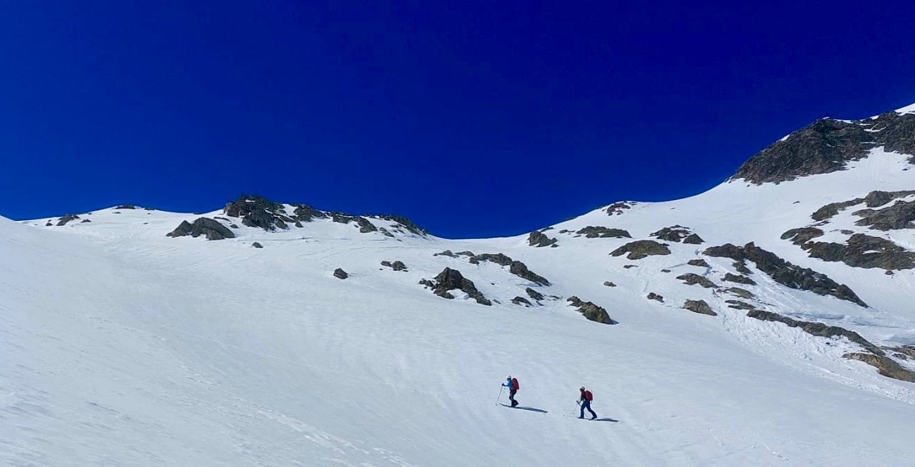 Didier nous propose 2 itinéraires pour remonter à la grande Lauzière, on choisir la Col du Bâton (l'autre couloir de 300m à remonter en crampons à l'ombre ne nous inspire pas du tout!)