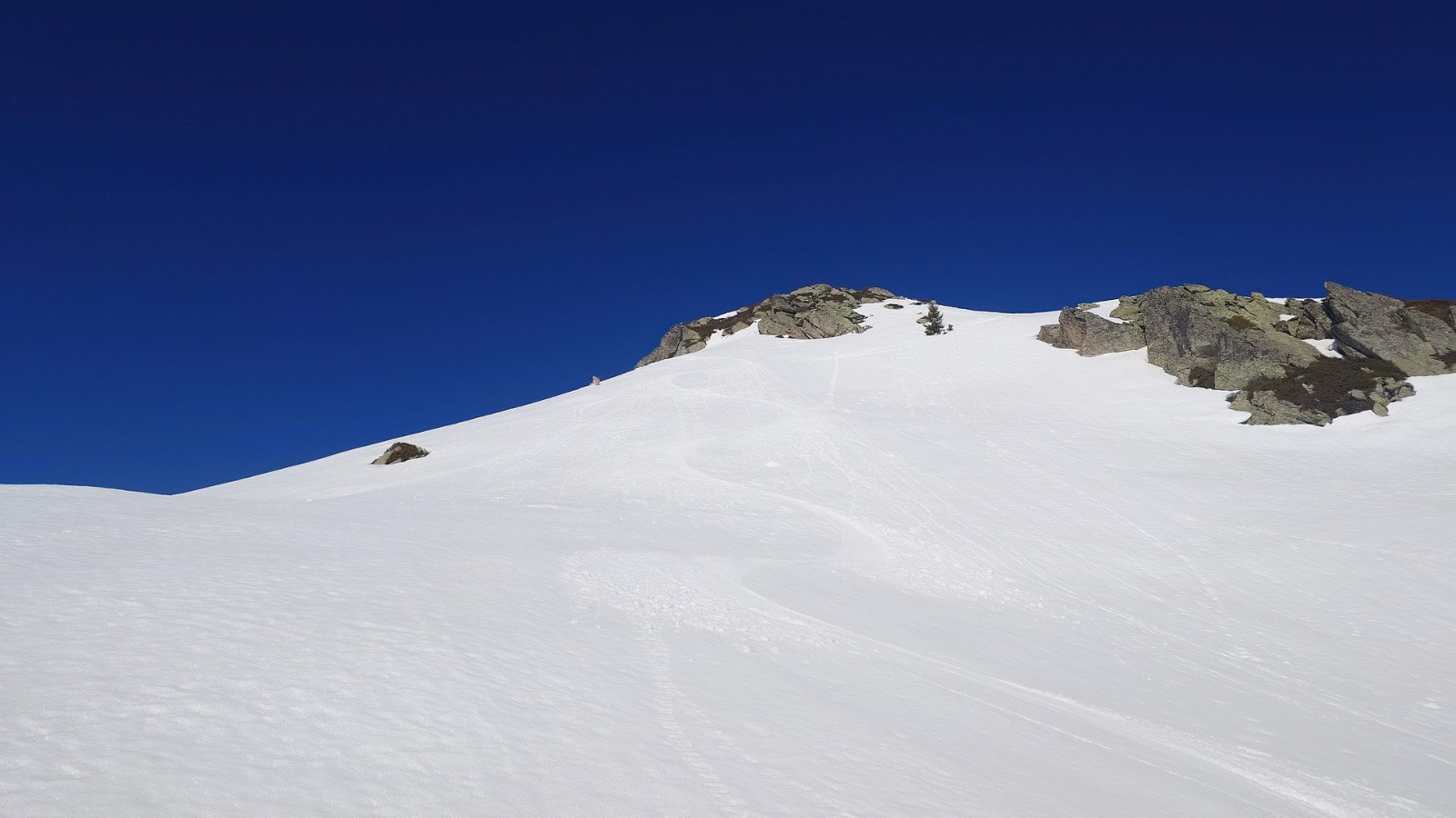 L'itinéraire est aléatoire, à vue. Une vague idée initiale sur la carte, hier soir. Mais c'est tellement mieux d'improviser en fonction des conditions. Tiens, par ici. Non, par là. Oh ça a l'air bon plus loin. Oui ! Non, pas ici. Un col, une descente, un sommet, une petite face, un autre sommet, une traversée, une descente un peu raide puis plate. Heureux bricolage.