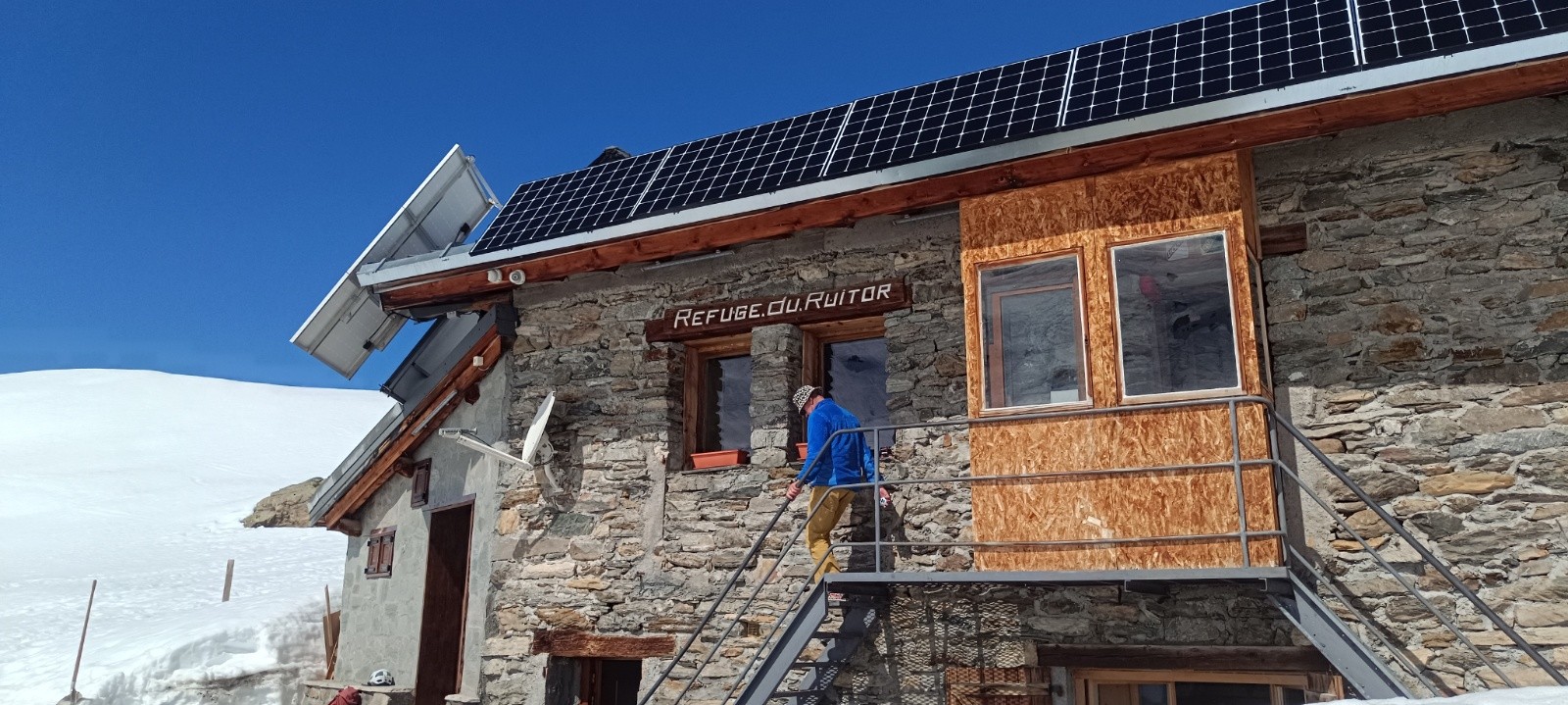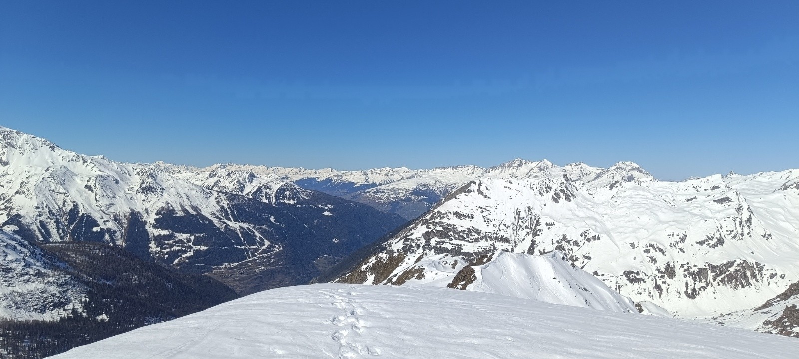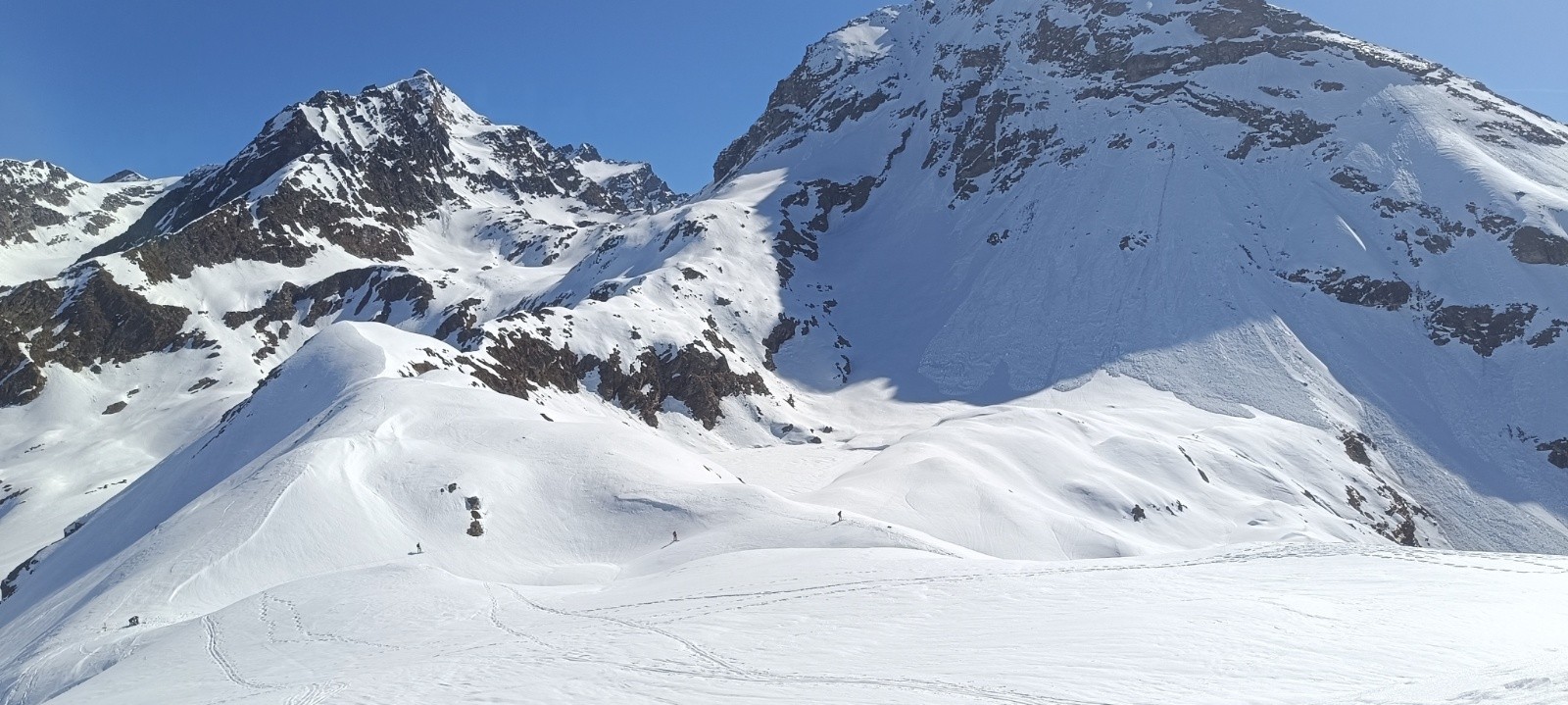 Descente sur neige encore froide agréable à skier jusqu'au refuge du Ruitor... Après, c'est mou là où il y a de la neige
