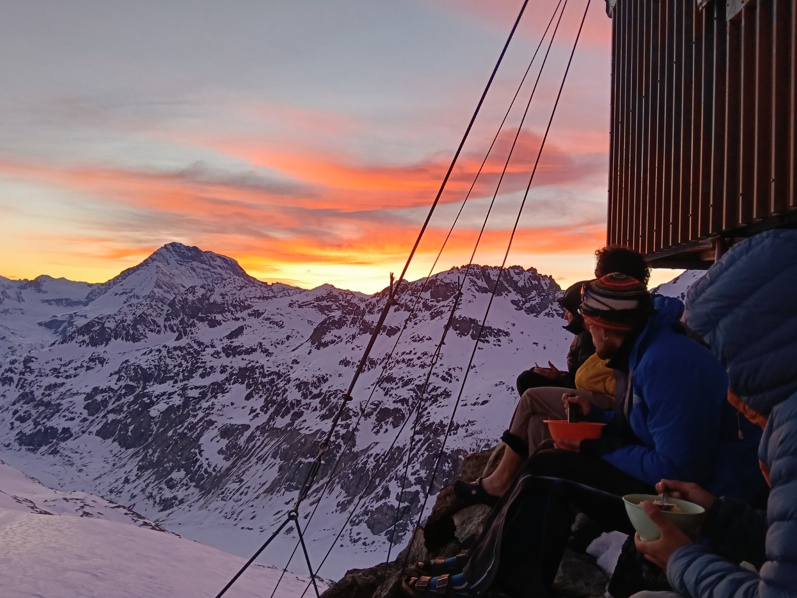 Itinéraire suivi : De la cabane de Valsorey on mont environ 600m pour arriver au plateau du Couloir. La dernière partie on fait normalement avec des crampons (c'est bien tracé, donc avec des chaussures ça va aussi), mais il y a un motivé qui insiste de le faire avec skis. Une petite descend et montée pour arriver au Col du Sonadon, et on peut faire un descend très longue et très scénique sur le glacier du Mont Durand. La neige est bonne, on a un peu de neige de printemps dans la dernière partie. On remets les peaux pour aller vers le glacier d'Otemma. On s'encorde pour être plus sécure, mais le glacier et dans un bon état. Il fait chaud, et les pieds commencent a faire mal, mais on est motivées pour le bivouac, notre pastina et la vu. Une foie arrivé, on commence l’opération chilling at the bivouac. On est seule, la vu est incroyable, on peut voir toute notre trajet depuis le Mont Vélan. Une toilette de 5 étoiles!