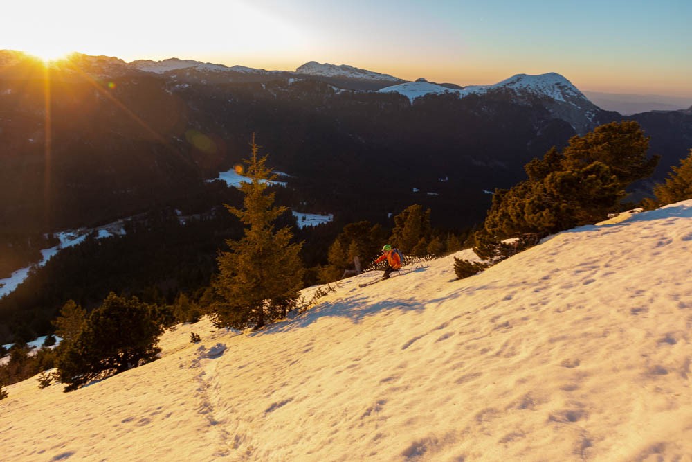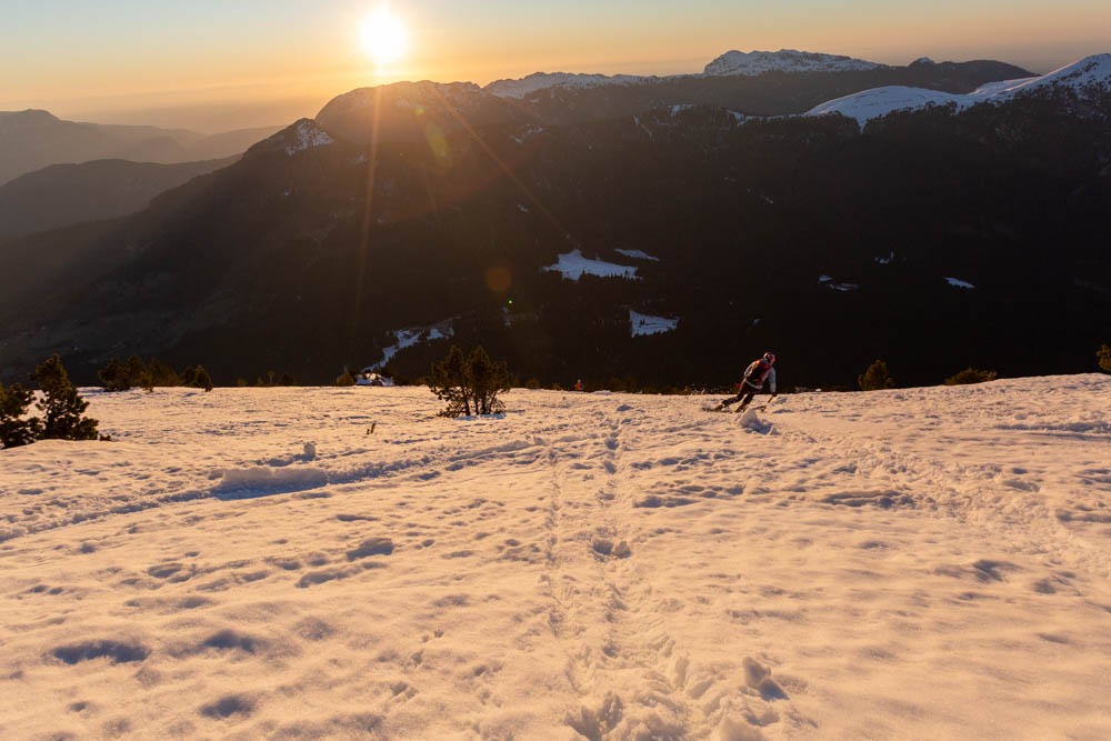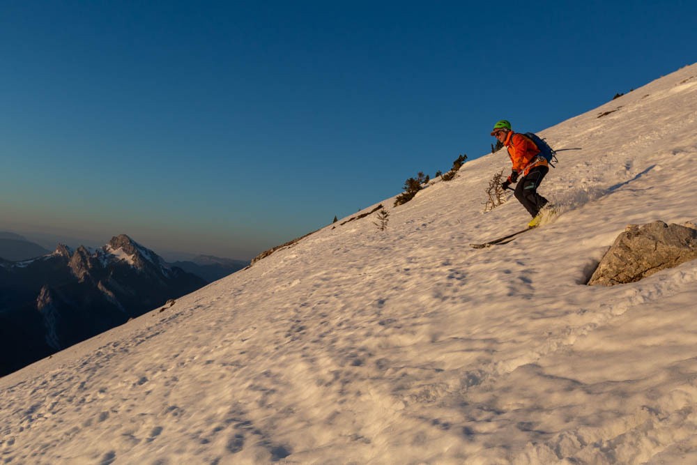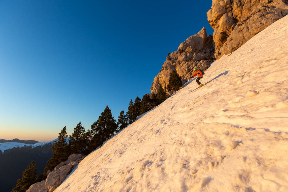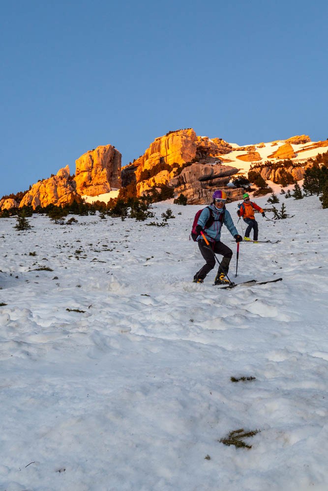 Conditions pour le ski : poudre lourde sur cailloux, branches, pierrailles et fond tassée