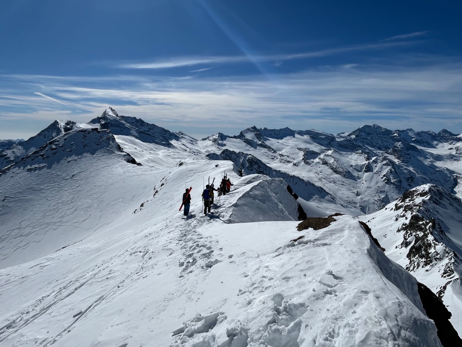 Mes skis ne voulant pas me laisser continuer, j'invente la technique du squat en marche arrière dans une pente à 40°! Ouf, me voilà passé et je rejoins le reste du groupe sur l’arrête (j'en menais pas large quand même sous mon rocher...).