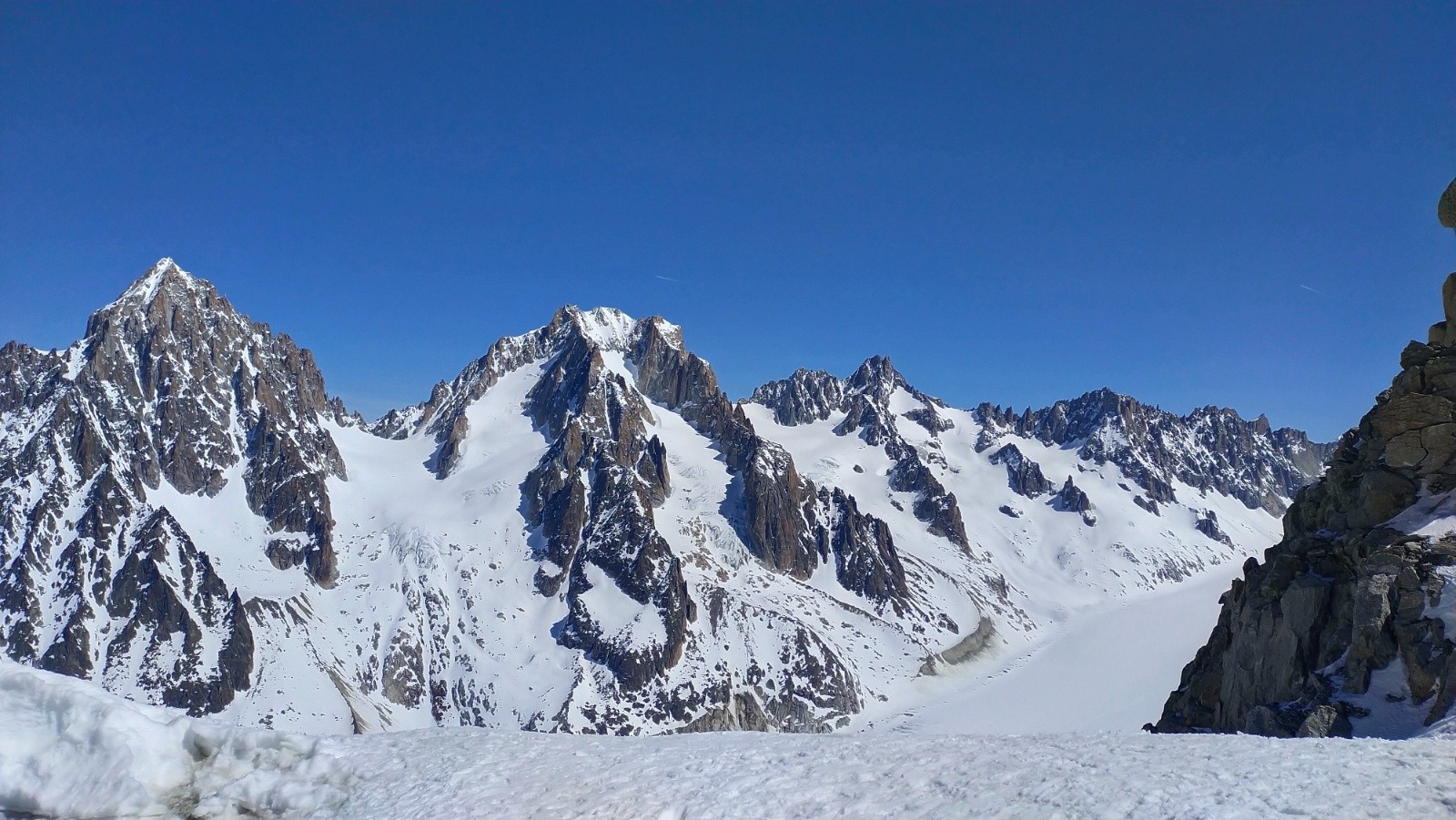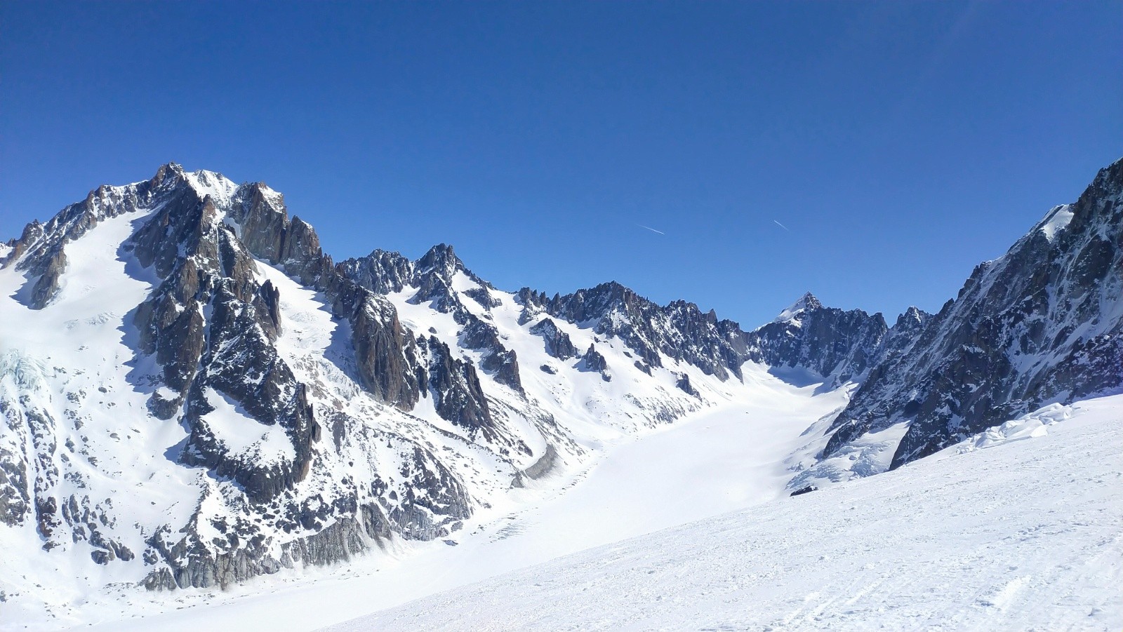 Après une bonne petite pause pique-nique en haut et une dernière contemplation de la voie normale de l'Aiguille d'Argentière, on se lance dans la descente. Je teste donc la deuxième paire de ski de papa, comme mes deux paires sont actuellement hors service...