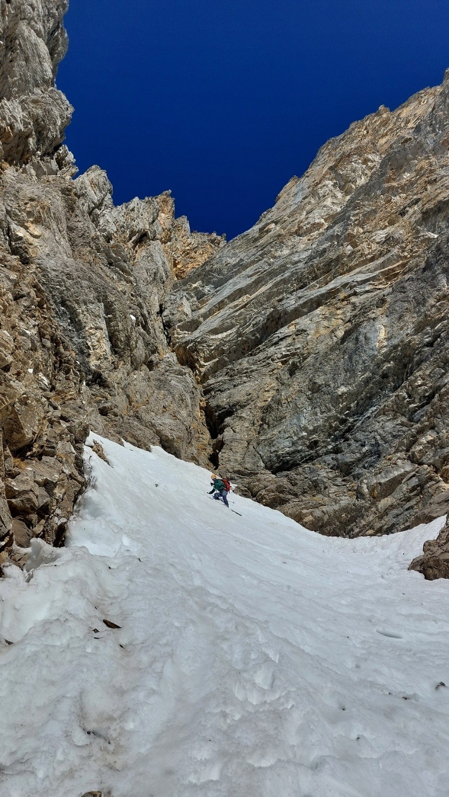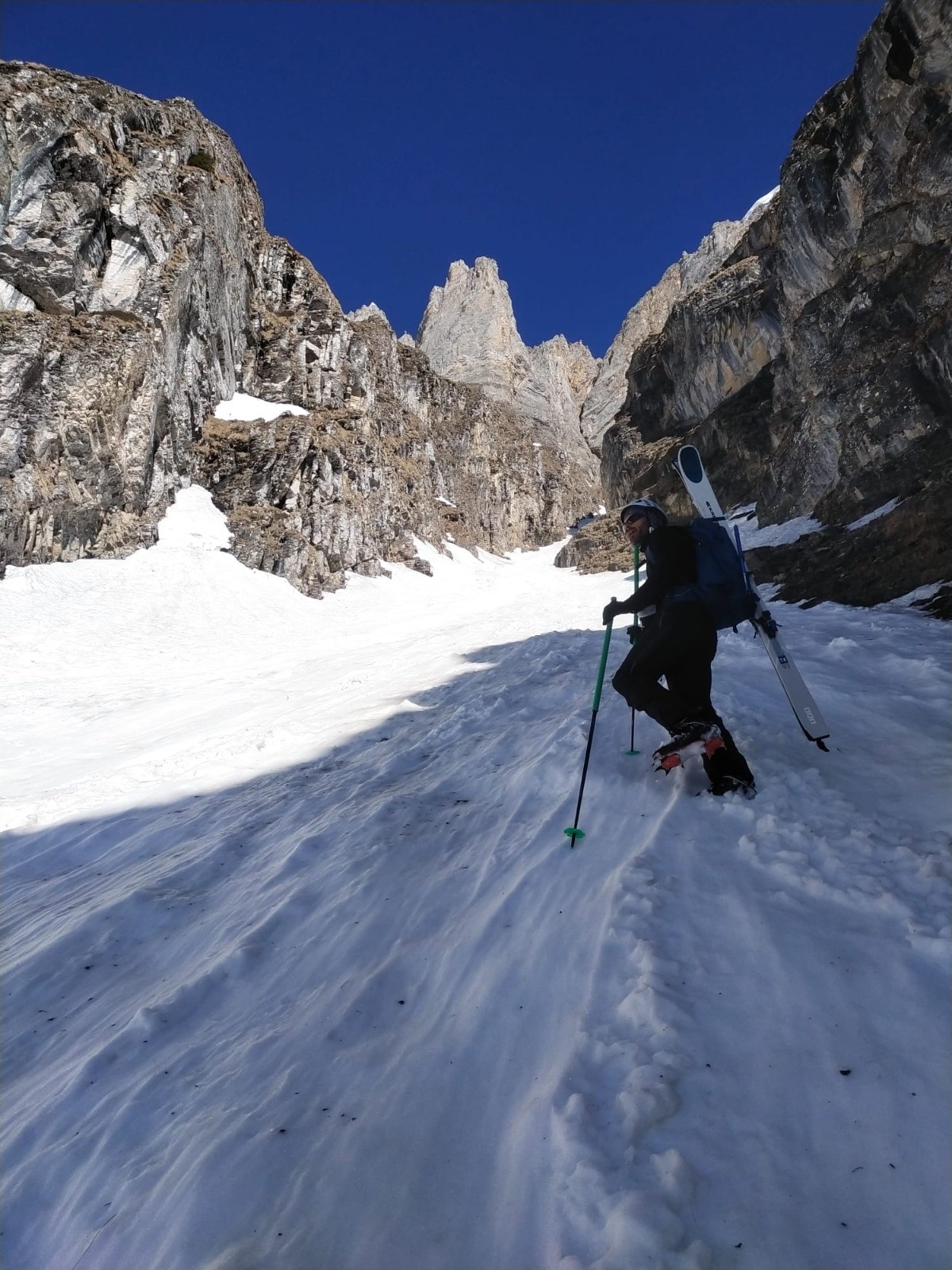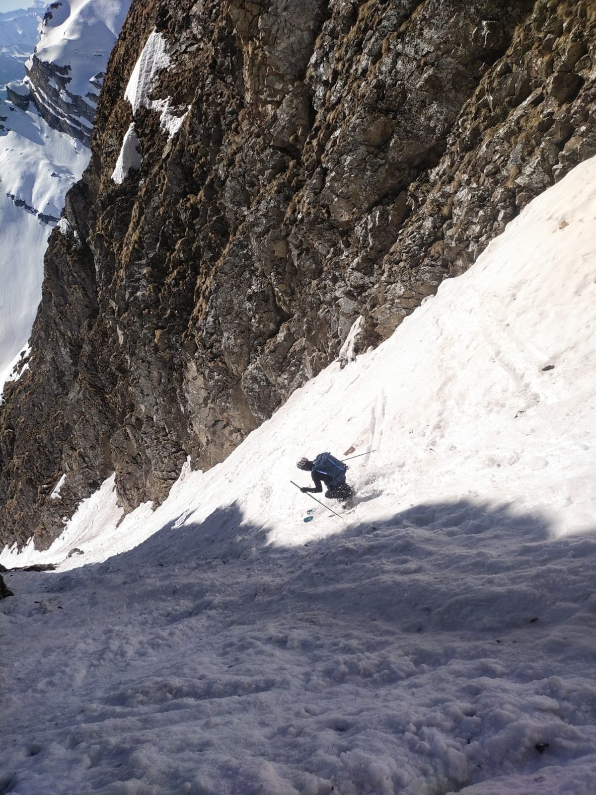 Conditions pour le ski : dans le couloir, regel très médiocre, mais neige assez dense qui se skie correctement. La rive gauche prend le soleil vers 8h, mais la rive droite reste à l'ombre jusqu'à 9h30