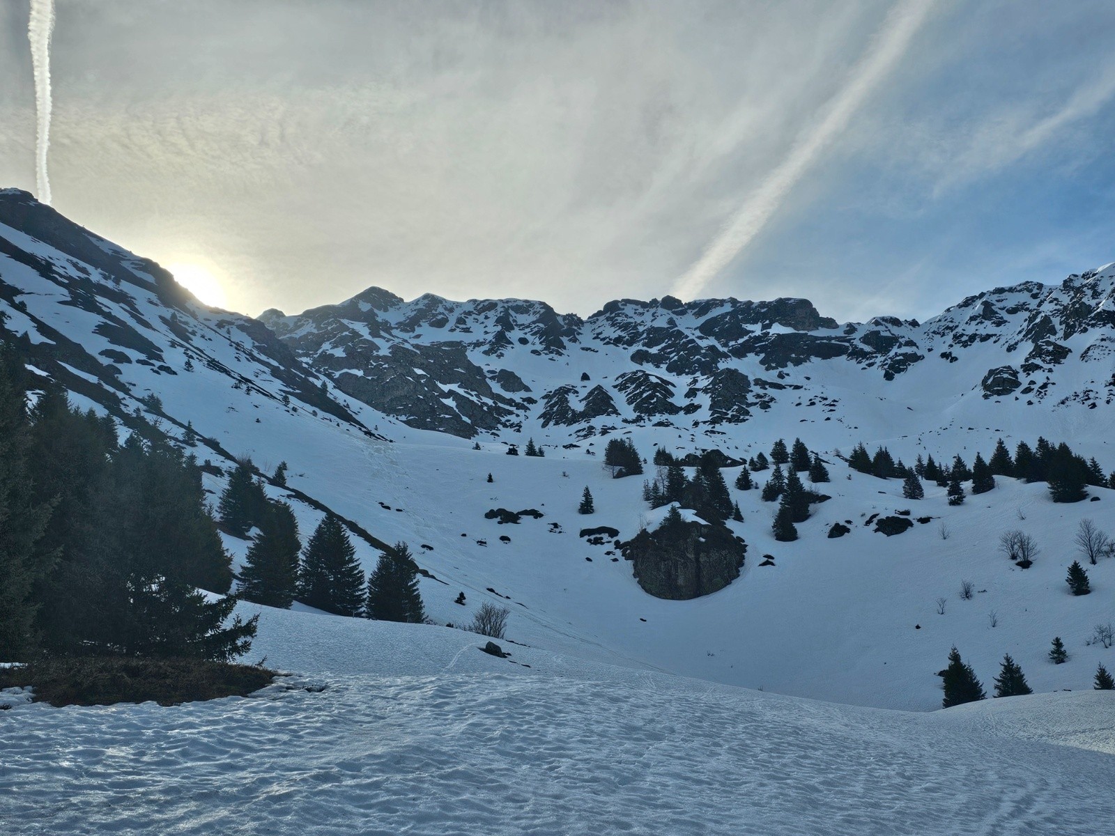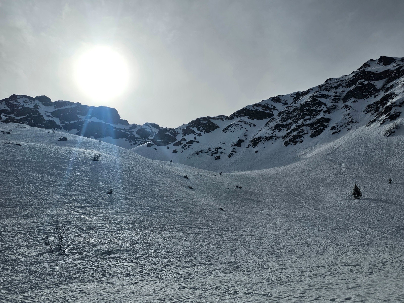 Itinéraire suivi : piste verte gelée, combe de Bédina, col de Bédina et trace vers la Jasse descente par les pistes.