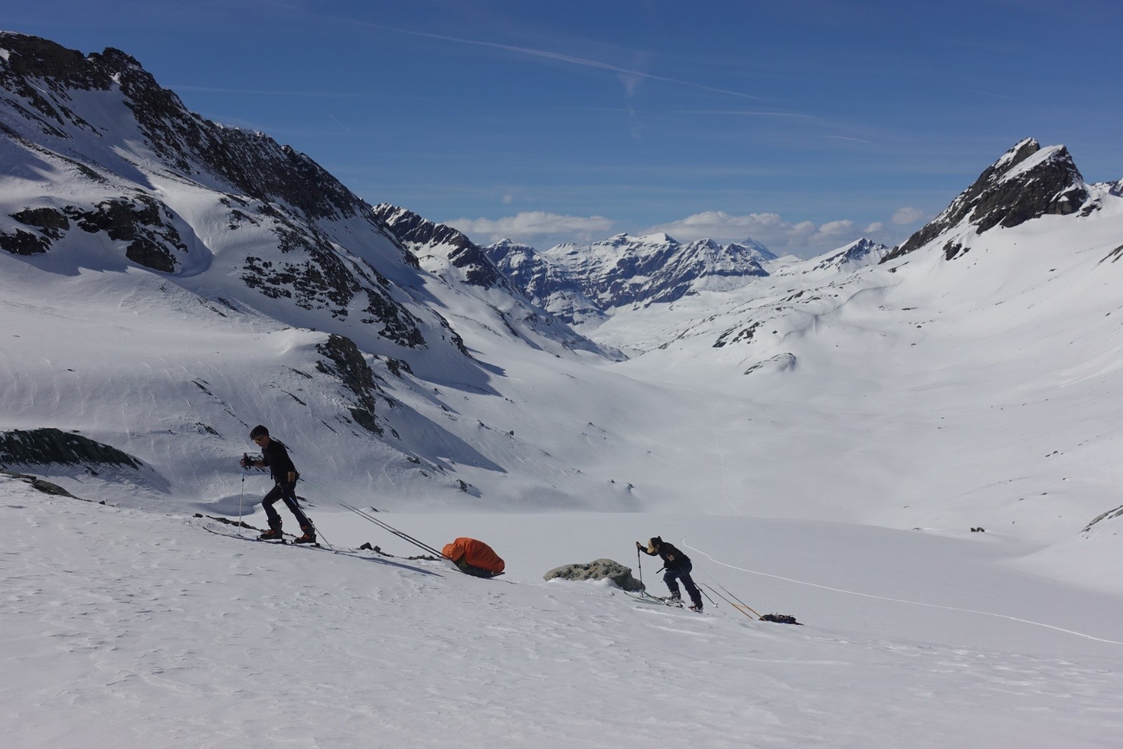 Bonne pioche ! Cette année, on a pas vu un nuage et les conditions nivo étaient très rassurantes. Autre bonne nouvelle coté nivo, aucun portage. Du coup dès la voiture, on tire notre pulka dans un décor sublime, surplombé par l'imposante masse de la pointe Charbonnel qui impose sont autorité aux sommets alentours. En tirant la pulka sur près de 7 km on fini par oublier que l'on tire un sac de 22 à 28 kg selon les protagonistes. Il faut dire que l'on est parti pour une autonomie de 4 jours...et que certains aiment avoir leur petit confort !