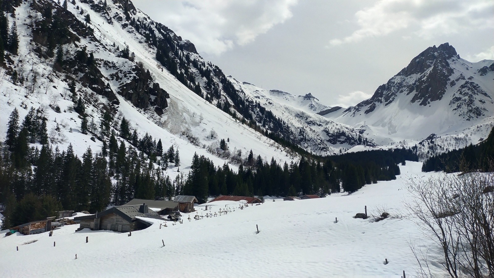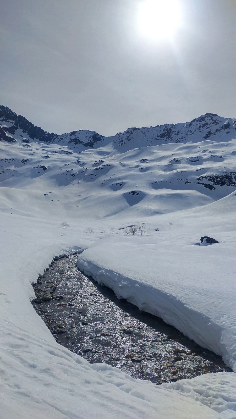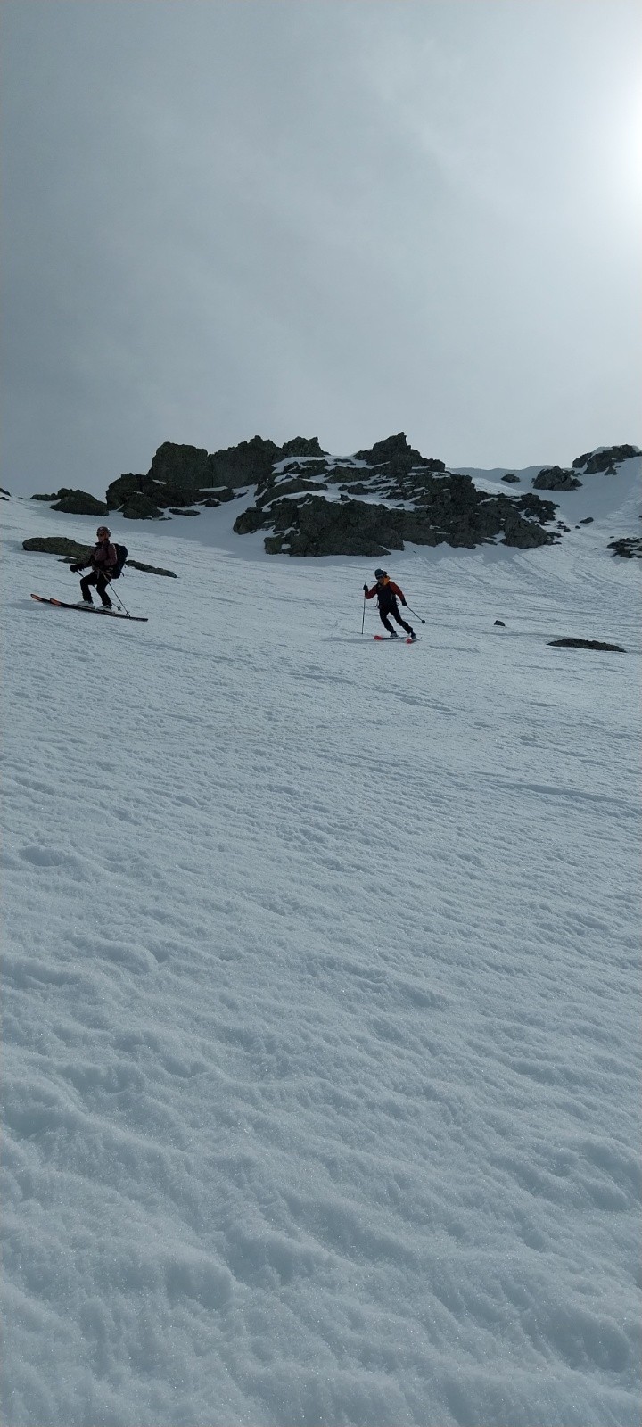 Descente à point, on s'est lancé pile au bon moment ! Le départ n'était pas complètement revenu, mais le grip était impeccable. Une fois les 50 premiers mètres passés, c'est moquetteland jusqu'aux lacs. Au top, c'était trop bon, mais vite avalé... On a continué tranquillement jusqu'à 1700 m, où on s'est arrêtés pour profiter d'une bonne pause pique-nique. La suite se fait bien, la neige est lourde sur la partie plate, mais le reste est bien bon. Pour terminer, il a fallu finir à pied, ce que papa a moins apprécié.