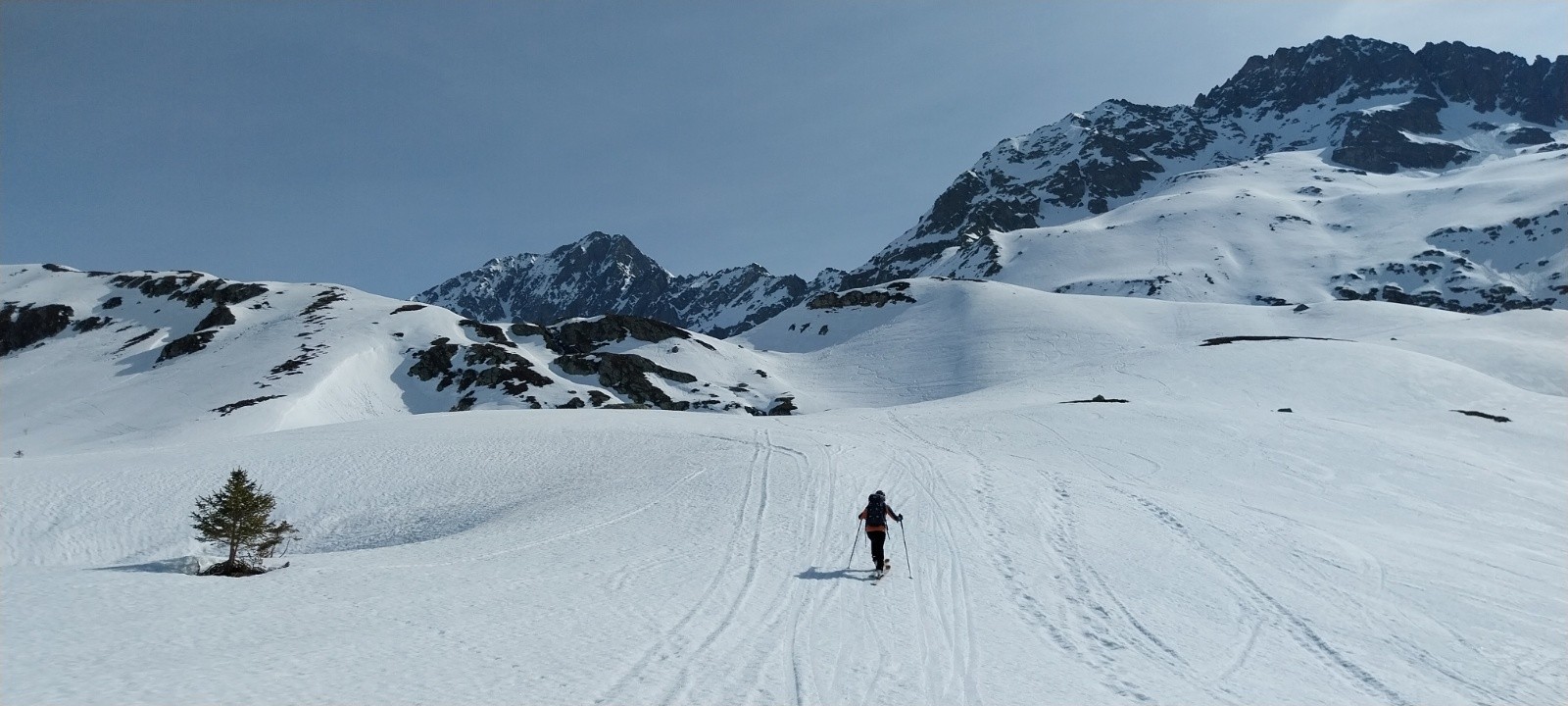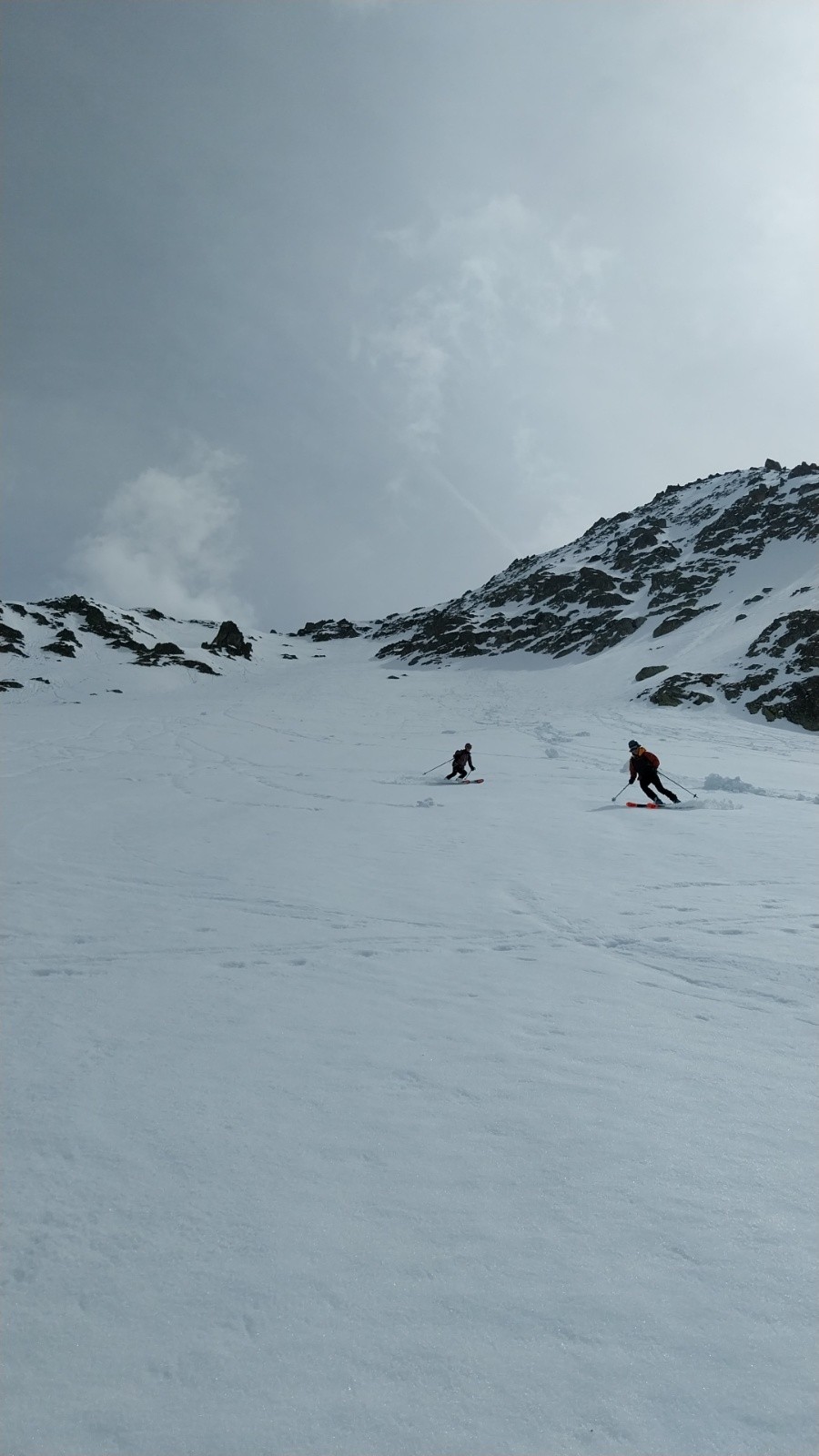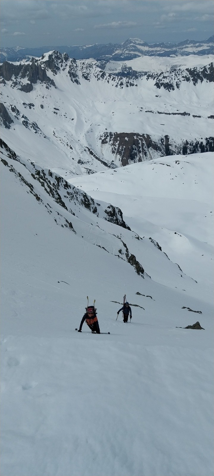 On met les couteaux et on s'engage dans la grande pente du col. On monte en suivant une vieille trace, des fois juste visible et d'autres fois un peu plus en mode rail. On a fini en crampons sur les 100 derniers mètres pour moi et 50 m pour les parents.