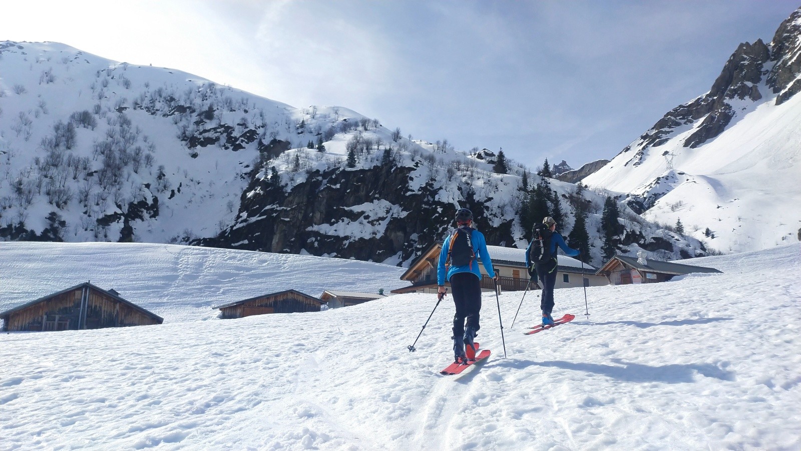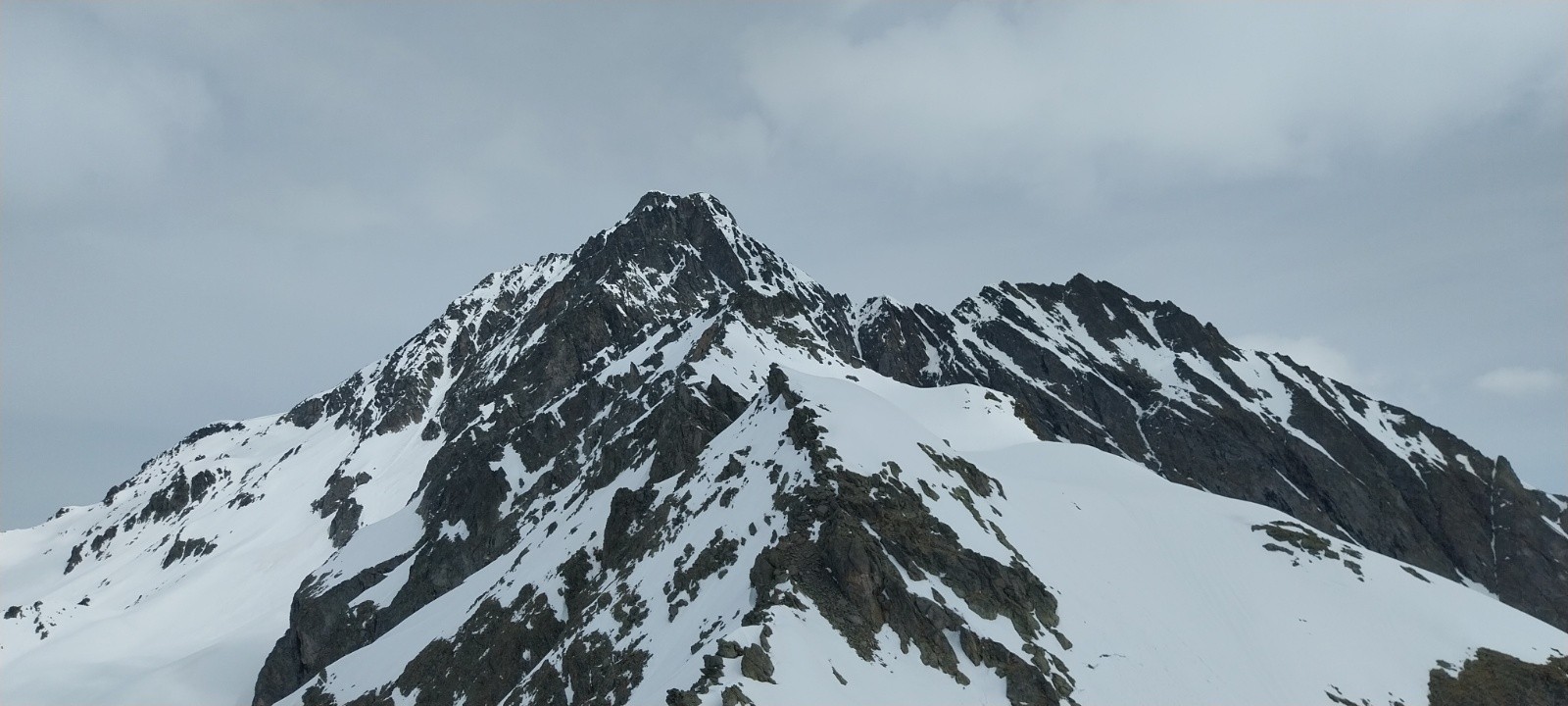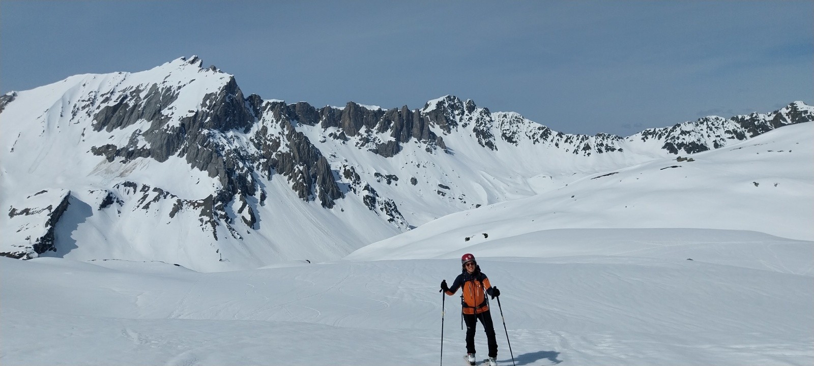 On met les couteaux et on s'engage dans la grande pente du col. On monte en suivant une vieille trace, des fois juste visible et d'autres fois un peu plus en mode rail. On a fini en crampons sur les 100 derniers mètres pour moi et 50 m pour les parents.