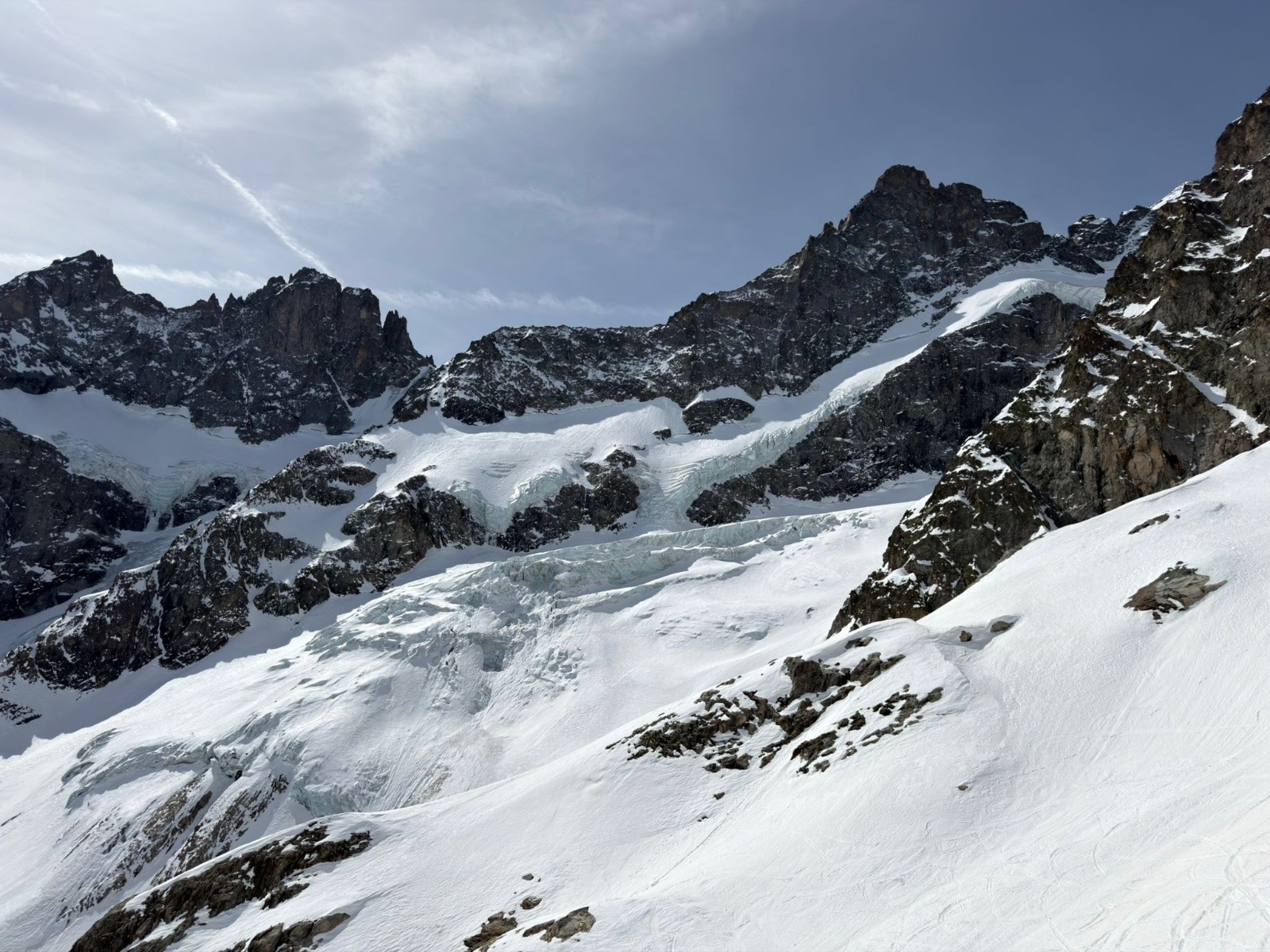 Et voilà qu'on domine le glacier de l'homme qui promet lui aussi une belle ambiance déchirée. Au dessus la Meije Orientale trône, avec ses pentes bien dures à l'allure patibulaire vu d'ici. Un coup d'œil derrière nous, et toujours personne. C'est pas aujourd'hui que quelqu'un ira la visiter celle là...