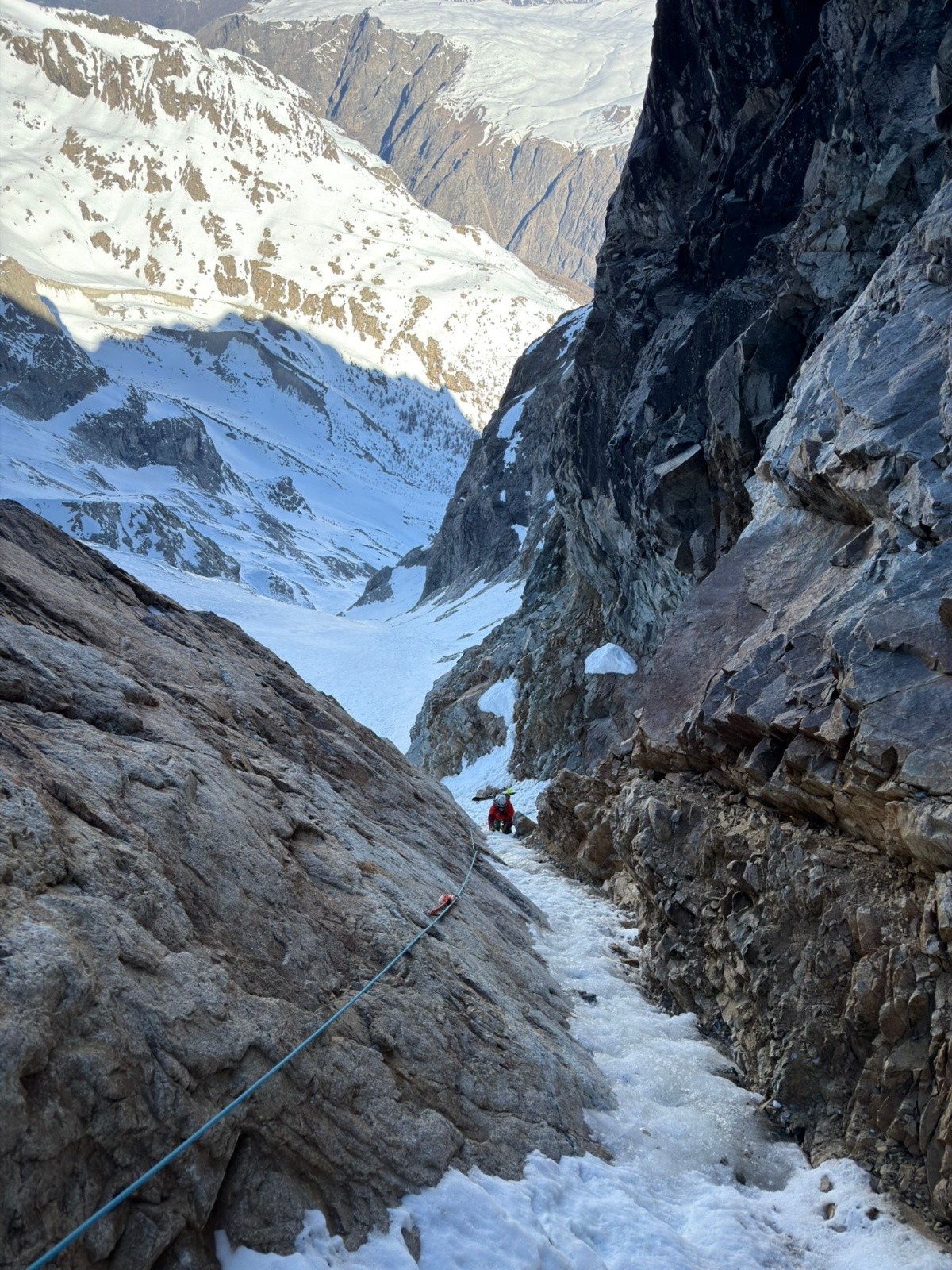 Et puis le voilà parti dans le couloir, la patience d'un guide a ses limites. Dans la partie en glace, il me laissera passer devant, c'est gentil à lui, ça m'évite de gérer une corde en plus dans les pattes. Et puis au détour d'une deuxième longueur qu'on tire, il passe la cinquième et disparait bientôt dans l'étroiture.
